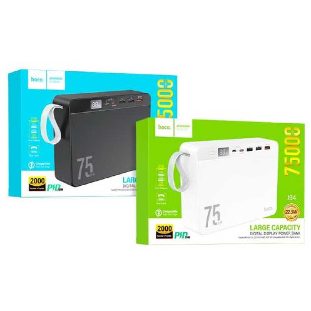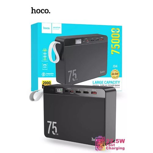 Powerful and portable mobile power bank with a massive capacity of 75000mAh and a rated capacity of 44000mAh. It features convenient input options including Micro-USB and Type-C, both supporting 18W input for Quick Charge (QC), Fast Charging Protocol (FCP), and Adaptive Fast Charging (AFC). The output options are versatile: USB 1 offers a fast charging speed of 22.5W supporting QC, FCP, SCP, and AFC, while USB 2 and USB 3 provide a standard output of 5V/2.1A. The Type-C port provides a powerful 20W output, compatible with Power Delivery (PD), QC, FCP, and AFC. The total output capability is 5V/3A. Equipped with an LED digital display, the J94 Overlord power bank allows you to easily monitor the battery level and charging status. The construction is made of high-quality materials, including an ABS + PC flame retardant shell and a reliable lithium polymer battery. it is a compact and portable device that can accompany you on your travels and adventures. The J94 Overlord power bank is a reliable companion that supports fast charging protocols and ensures your devices stay powered up wherever you go. Power Bank Portable Charger Hoco 75000mAh Hoco J94 Power Bank LED Digital Display, a portable device featuring a massive capacity of 75000mAh allowing for quick and efficient charging of multiple devices simultaneously. It includes convenient inputs for fast charging via Micro-USB and Type-C, with versatile output supporting QC, FCP, SCP, and AFC charging, in addition to adaptive fast charging technology. Features of Hoco 75000mAh Power Bank LED Digital Display: The power bank comes with a capacity of 75000mAh It features multiple input options including Micro-USB and Type-C, both supporting 18W fast charging (QC), Fast Charging Protocol (FCP), and Adaptive Fast Charging (AFC). The Type-C port provides a powerful 20W output, compatible with Power Delivery (PD), QC, FCP, and AFC. The total output capacity is 5V/3A. Equipped with a digital LED screen, the J94 Overlord power bank allows you to easily monitor battery level and charging status. Made of high-quality materials, including flame-resistant ABS + PC and reliable lithium polymer battery.