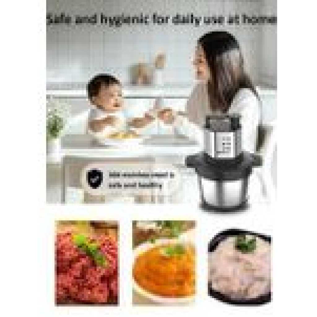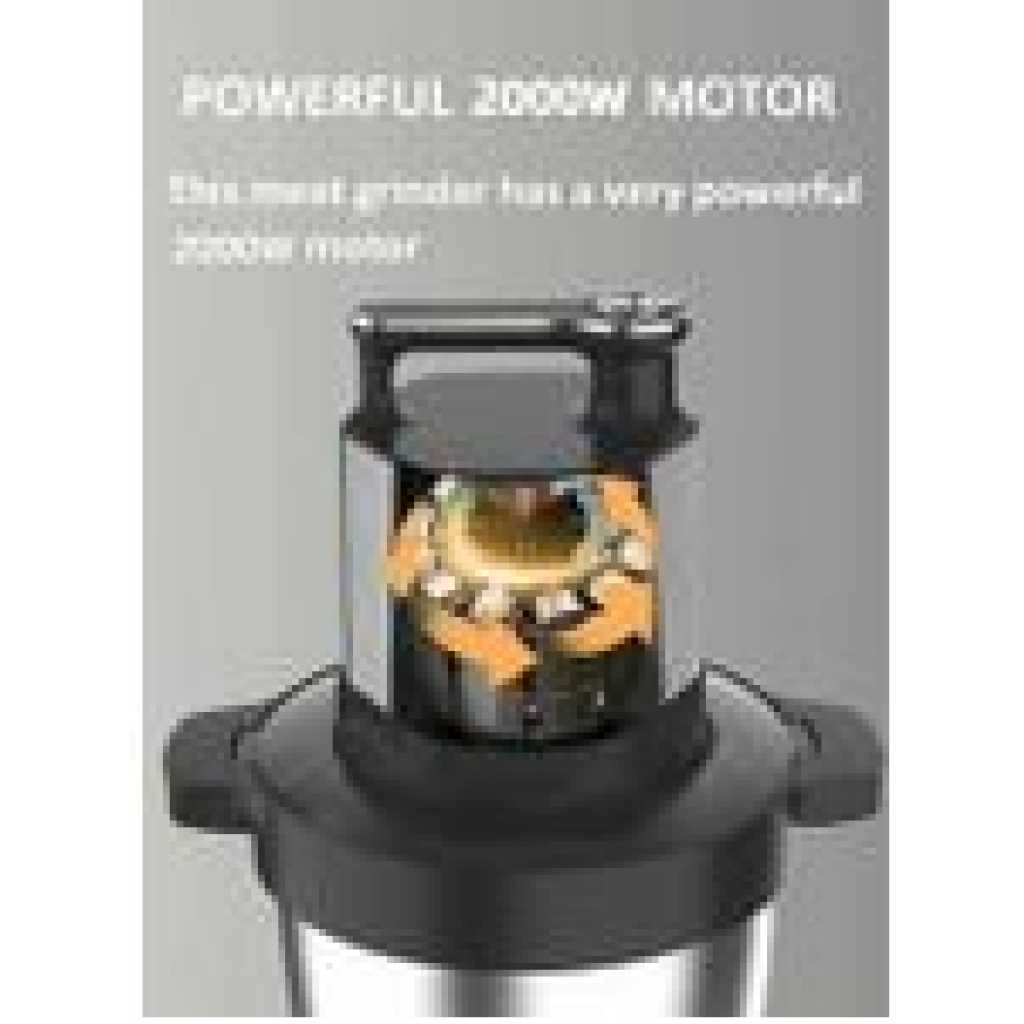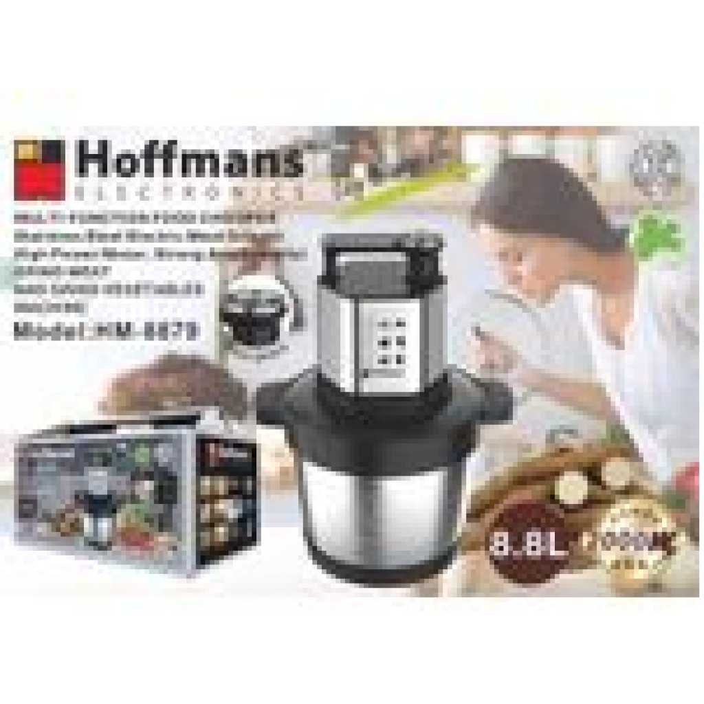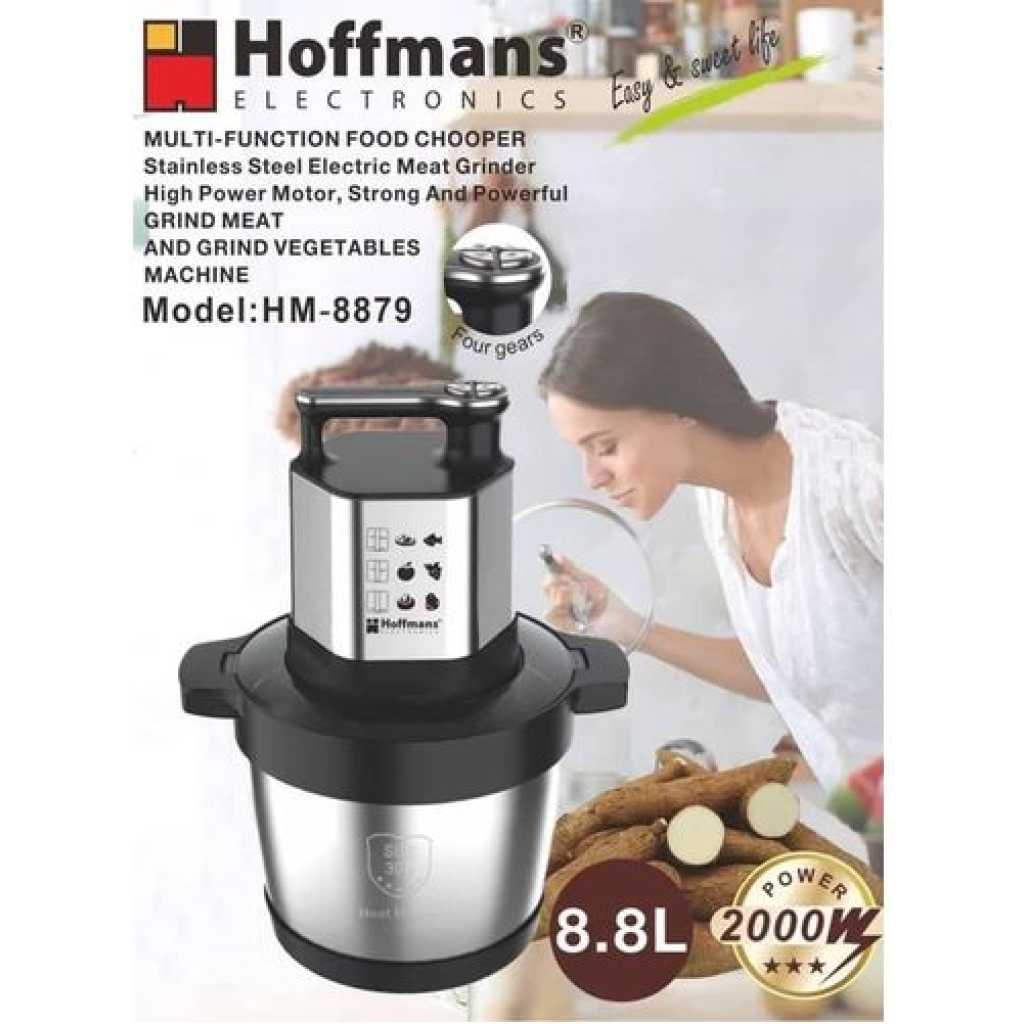 Hoffmans meat grinder with 2000W high power Motor, helps you take less time grinding up bulk batches of meat, giving you more time to cook and savor flavors. This food grinder is equipped with stainless steel blades and 4 modes to choose from. You can chop, grind various ingredients, such as onions, meat, ham, garlic, onion, small herbs. Electric chopper is equipped with a stainless steel bowl and 8.8L capacity.With overload protection provide safety for use. The meat grinder will turns off if overheating or overloading occurs. Meat grinder equipped with a stainless steel bowl,which is more stronger, healthier and shock-proof. The joint connection between blade and the main body is made of stainless steel unlike other plastic one thus the blade is not easy to break off. Suitable for use in both home kitchens and restaurants, this meat grinder effortlessly grinds meat, vegetables, fruits, nuts, ingredients, baby foods, and much more Key Features: Environmentally clean and easy to use. Touch switch. Four-leaf stainless steel blade. Has powerful driving force. Quiet mince. Environmental PVC non-slip mat.