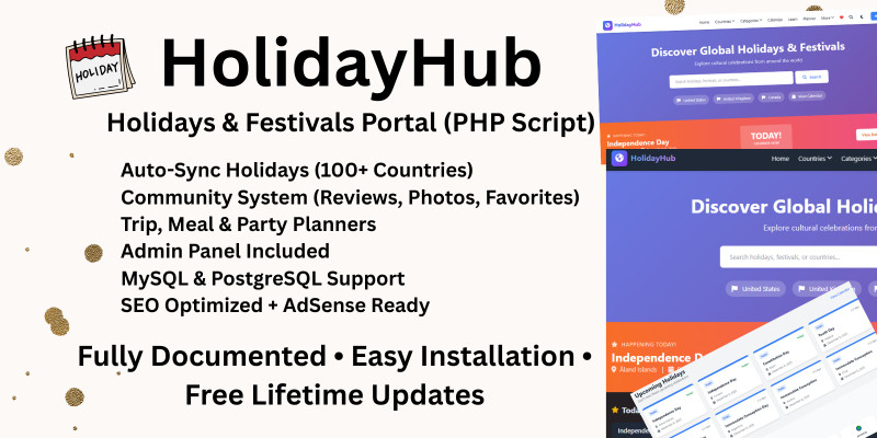 HolidayHub – Holidays And Festivals Portal. Worldwide holidays & festivals portal with community system, planners, admin panel, SEO tools, and multi-database support.