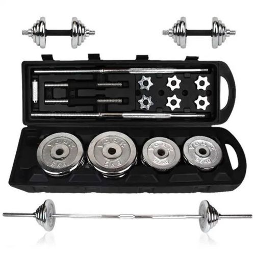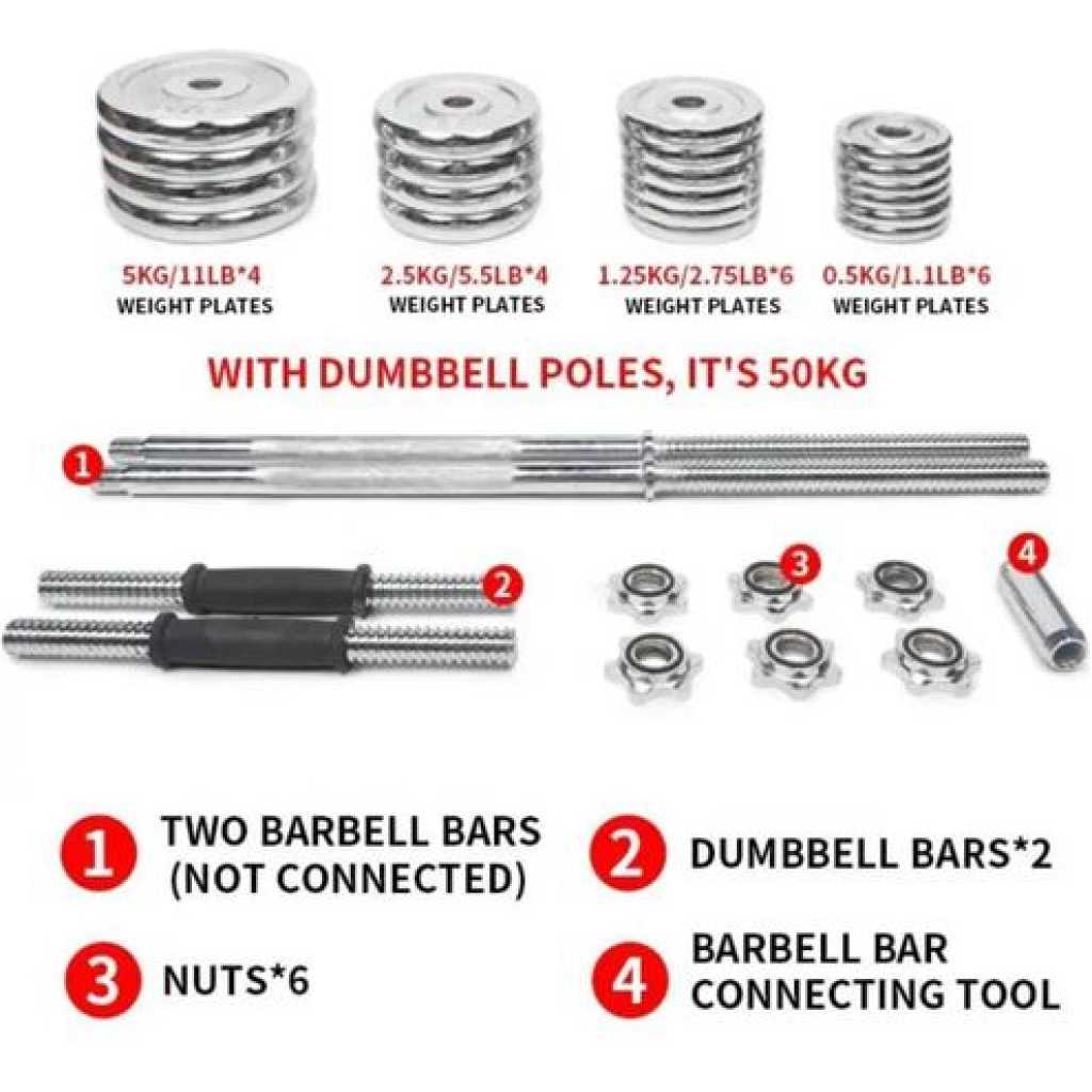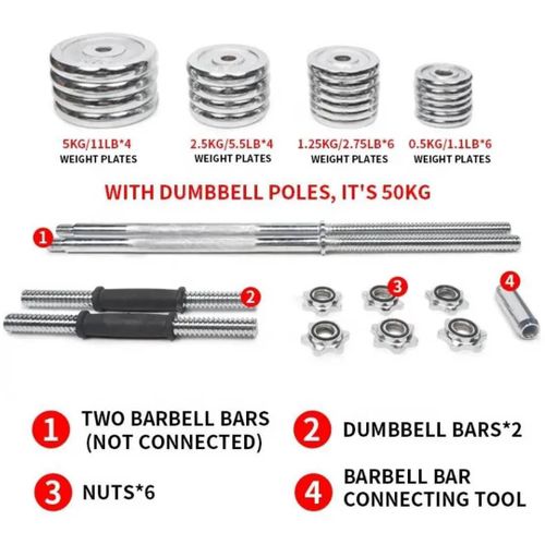 YALLA Home Gym 50KG Dumbbell Set Weights Solid Chrome Set with Straight Barbell, Curl Barbell Chrome Plates This cost-effective 55KG dumbbell set offers you the chance to sculpt and tone your body from the comfort of your own home. If you’re new to fitness and looking for an entry-level set, then look no further. Get ready to perform fun and effective full-body workouts for a total cost similar to only a couple of weeks gym membership. Solid Chrome Plates Made of Chrome iron these weights are built to last and the rubber grips will make it comfortable for you to use for longer. Adjustable weights Adjustable weights – can add and remove weights as desired. Target your legs by adding weight to lunges or squats to increase your strength and enhance your balance. Strengthen your core strength in an effective and safe way, help you burn calories, improve abdominal endurance and build six abdominal muscles. The connector that connects the two ends of the dumbbell to form a barbell is a dual purpose, which is a combination of dumbbell and barbell. The packaging is environmentally friendly and wear-resistant. It can protect the floor and protect the dumbbells. EXPANDED STRENGTH TRAINING: Our adjustable dumbbells with dumbbell connectors provide you with excellent versatility and interchangeability, and now you can quickly adjust your training level or easily switch between exercising dumbbells or barbells EASY TO USE AND STORE: it can be assembled and removed in seconds. Compact, convenient, easy to use and store. The all-in-one dumbbell eliminates the need for multiple dumbbells in the exercise space. Suitable for basic bodybuilding exercises NOTE: This product total weight is 55 kg. (including handle, spin lock, weight plate and plastic box)