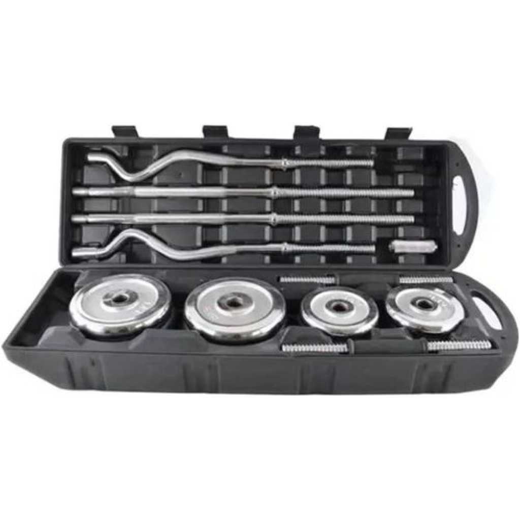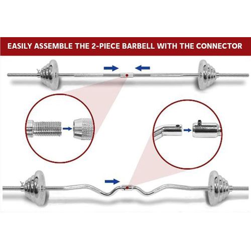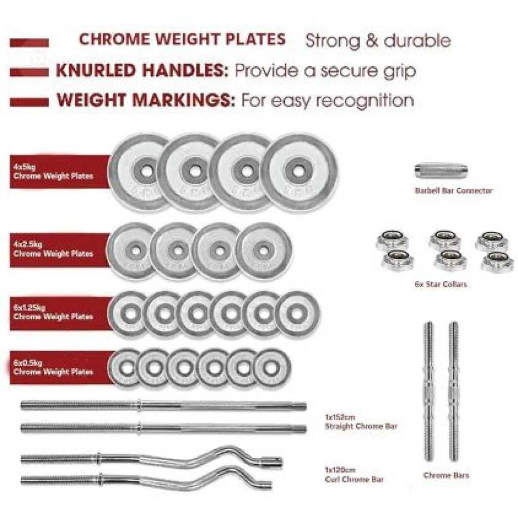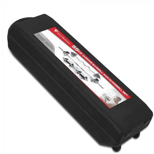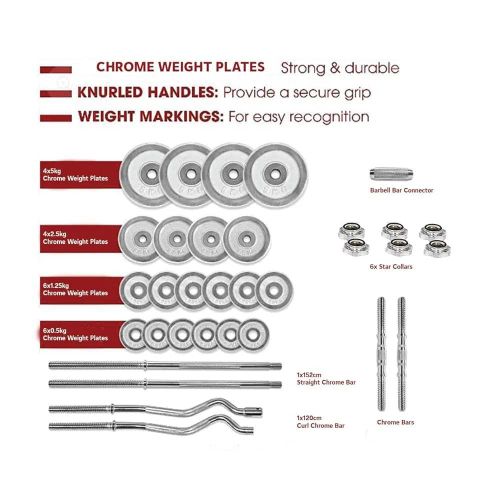 Key Features: FITNESS EQUIPMENT COMBO: Package includes 4x5kg, 4×2.5kg, 6×1.25kg, 6×0.5kg weight plates, 2x35cm dumbbell handles, 1x120cm curl barbell (after assembly), 1x152cm straight barbell (after assembly), 1x connectors, 6 collars. Full set weighs 55kg (carry case included) PLATING ADJUSTABLE SET: Comes with chrome weight plates for maximum durability. Chrome handles are knurled for a secure, firm and non-slip grip. Also includes star-lock collars for easy weight changes CONNECTOR: The steel connector helps to turn two short barbells into one long barbell easily and quickly in mere seconds, providing variety to your workout routine. The dumbbell set is easy to combine with a weight bench, press bench, barbell rack or squat rack