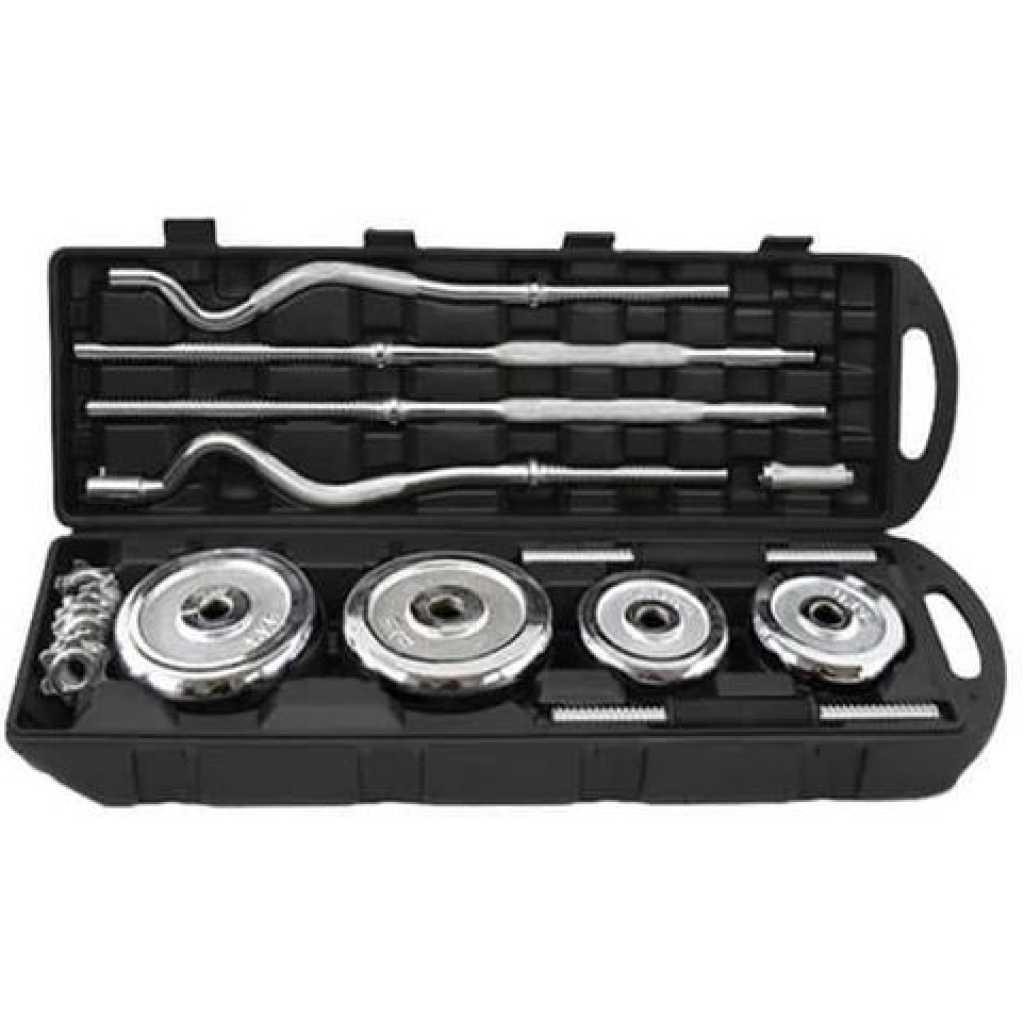 YALLA HomeGym 55KG Dumbbell Set Weights Solid Chrome Set with Straight Barbell, Curl Barbell Chrome Plates This cost-effective 55KG dumbbell set offers you the chance to sculpt and tone your body from the comfort of your own home. If you’re new to fitness and looking for an entry-level set, then look no further. Get ready to perform fun and effective full-body workouts for a total cost similar to only a couple of weeks gym membership. Solid Chrome Plates Made of Chrome iron these weights are built to last and the rubber grips will make it comfortable for you to use for longer. Adjustable weights Adjustable weights – can add and remove weights as desired. Target your legs by adding weight to lunges or squats to increase your strength and enhance your balance. Strengthen your core strength in an effective and safe way, help you burn calories, improve abdominal endurance and build six abdominal muscles. The connector that connects the two ends of the dumbbell to form a barbell is a dual purpose, which is a combination of dumbbell and barbell. The packaging is environmentally friendly and wear-resistant. It can protect the floor and protect the dumbbells. EXPANDED STRENGTH TRAINING: Our adjustable dumbbells with dumbbell connectors provide you with excellent versatility and interchangeability, and now you can quickly adjust your training level or easily switch between exercising dumbbells or barbells EASY TO USE AND STORE: it can be assembled and removed in seconds. Compact, convenient, easy to use and store. The all-in-one dumbbell eliminates the need for multiple dumbbells in the exercise space. Suitable for basic bodybuilding exercises NOTE: This product total weight is 55 kg. (including handle, spin lock, weight plate and plastic box)