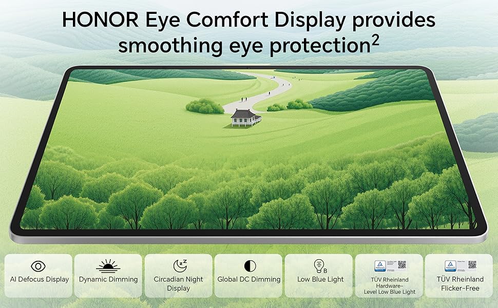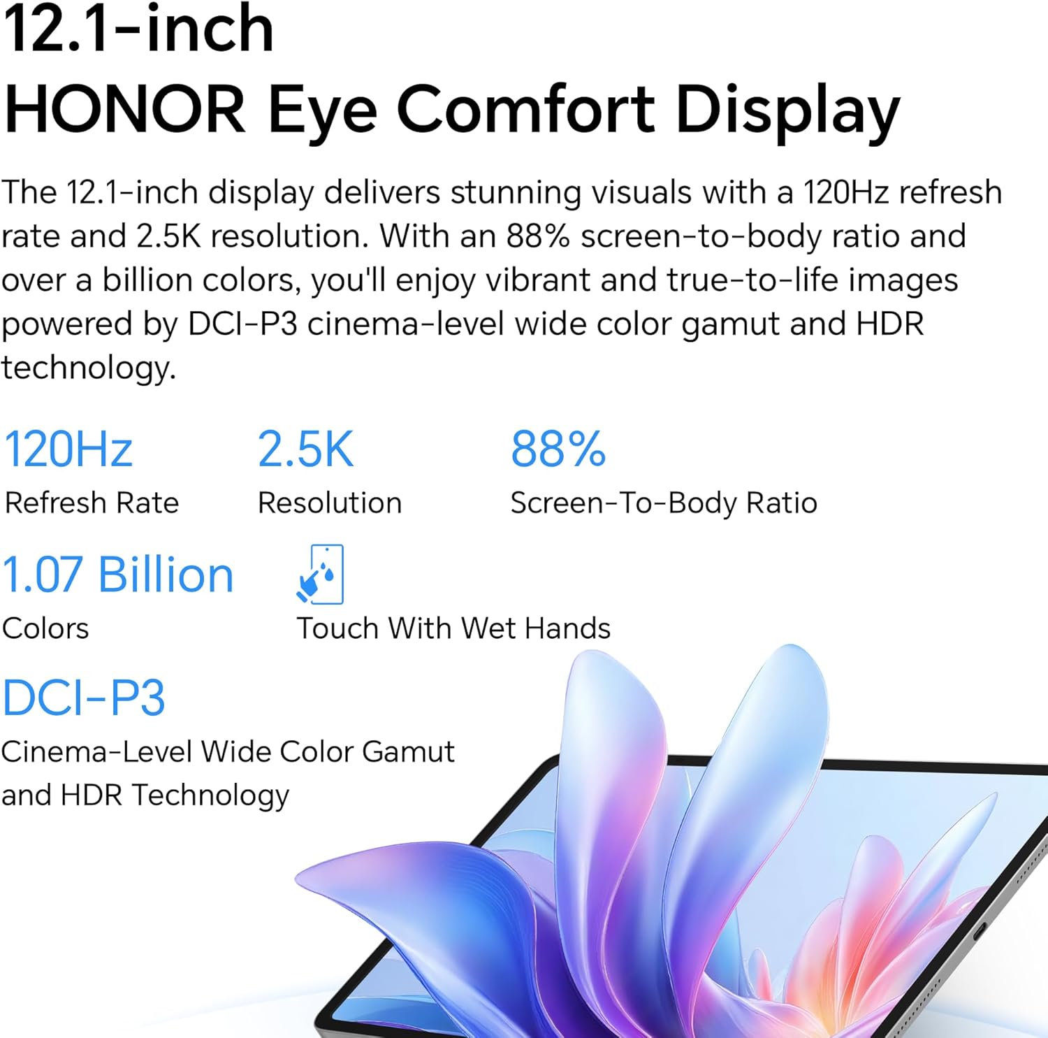 Key Features: ✅ [12.1″ 2.5K HONOR EYE COMFORT DISPLAY] – Large immersive screen with HDR, 120Hz refresh rate, and TÜV Rheinland low blue light certification — perfect for reading, streaming, or working long hours. [SNAPDRAGON 7 GEN 3 PERFORMANCE] – Equipped with an advanced 4nm chipset and 8GB RAM for smooth multitasking, app usage, and gaming. [FREE DETACHABLE KEYBOARD CASE + HONOR CHOICE PENCIL] – Boost your productivity with a full-function keyboard that doubles as a protective stand, plus a precision stylus for sketching and note-taking. [IMMERSIVE 6-SPEAKER SURROUND SOUND] – Enhanced stereo setup for crystal-clear audio while watching content, attending calls, or listening to music. [MASSIVE 10100MAH BATTERY + 35W FAST CHARGING] – All-day usage powered by a long-lasting battery and fast USB Type-C charging — ideal for travel, study, or hybrid work.