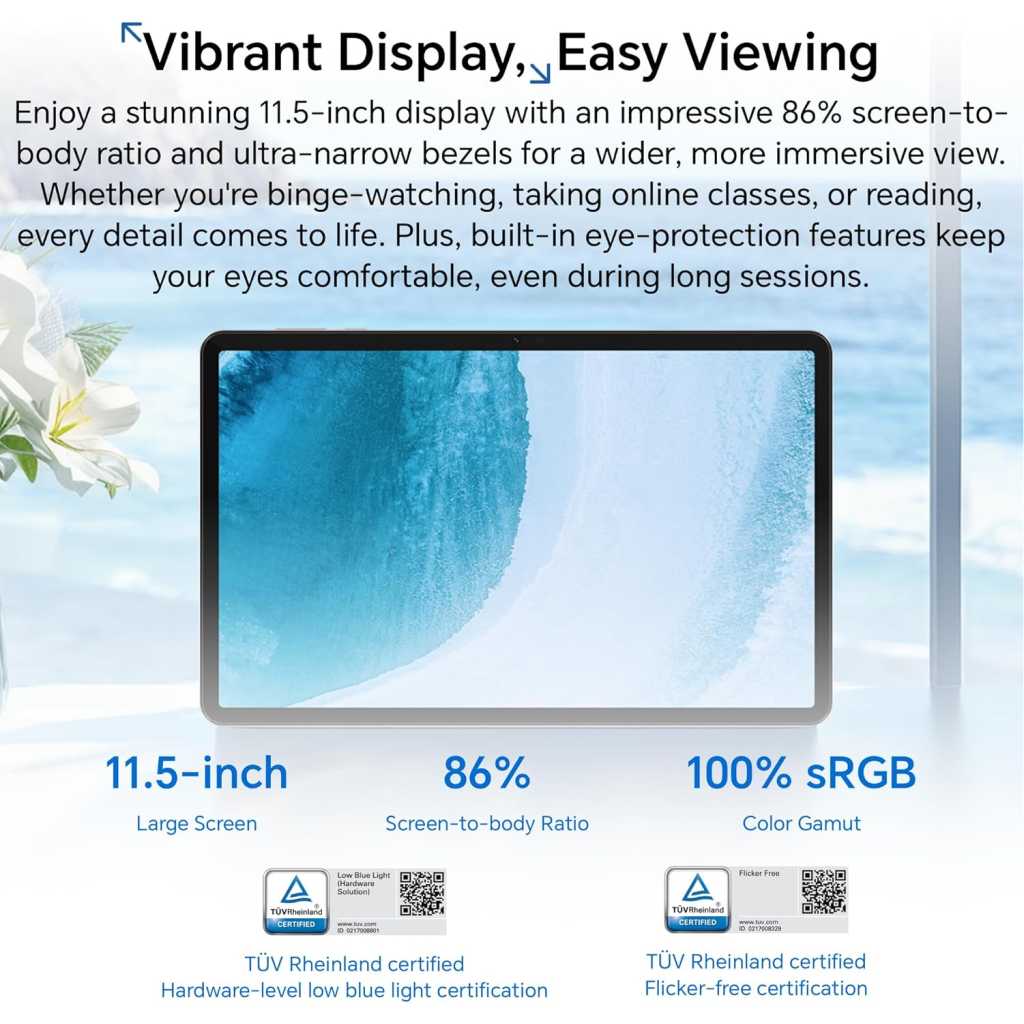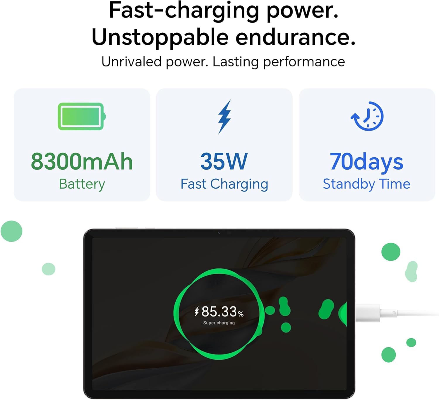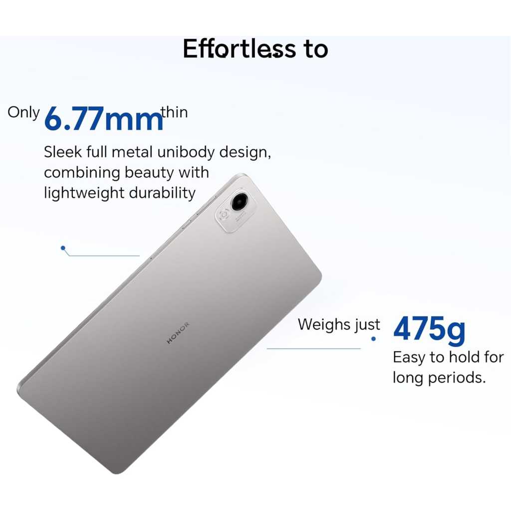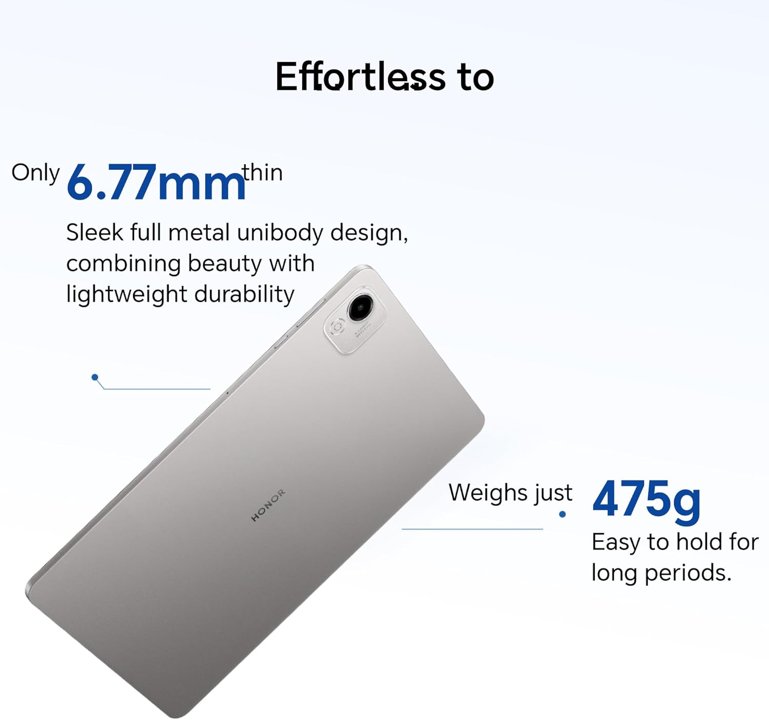 [11.5″ 120Hz 2.5K HONOR Fullview Display] – Lightning-fast speed. Exceptional quality.120Hz high refresh rate paired with 2.5K high-definition resolution, perfectly combining smooth visuals and clear quality. This screen delivers stunning clarity and earns rave reviews. [(6+6)+128GB Large Memory] – The combination of the 128GB storage and the 12GB memory allows you to store movies and music whenever you want. When joining hands with RAM Turbo, the 6+6GB expansion makes it smooth to switch between background APPs as always. [Sleek & Durable Ultra-Slim Design] – Featuring a 6.77mm metal body, Weighs just 475g,Sleek full metal unibody design, combining beauty with lightweight durability.Easy to hold, comfortable to use. [8300mAh All Day Battery] – Stay powered throughout the day with a 8300mAh battery, 70 days standby time,providing extended usage without frequent recharging. [Super Smooth Performance] – HONOR Pad X9a with Powerful Snapdragon 685 chip for a smooth performance experience.Brand-new Qualcomm Snapdragon chip with 6nm process technology, delivering a flagship-level, exhilarating experience. Key Features: [11.5″ 120Hz 2.5K HONOR Fullview Display] – Lightning-fast speed. Exceptional quality.120Hz high refresh rate paired with 2.5K high-definition resolution, perfectly combining smooth visuals and clear quality. This screen delivers stunning clarity and earns rave reviews. [(6+6)+128GB Large Memory] – The combination of the 128GB storage and the 12GB memory allows you to store movies and music whenever you want. When joining hands with RAM Turbo, the 6+6GB expansion makes it smooth to switch between background APPs as always. [Sleek & Durable Ultra-Slim Design] – Featuring a 6.77mm metal body, Weighs just 475g,Sleek full metal unibody design, combining beauty with lightweight durability.Easy to hold, comfortable to use. [8300mAh All Day Battery] – Stay powered throughout the day with a 8300mAh battery, 70 days standby time,providing extended usage without frequent recharging. [Super Smooth Performance] – HONOR Pad X9a with Powerful Snapdragon 685 chip for a smooth performance experience.Brand-new Qualcomm Snapdragon chip with 6nm process technology, delivering a flagship-level, exhilarating experience.