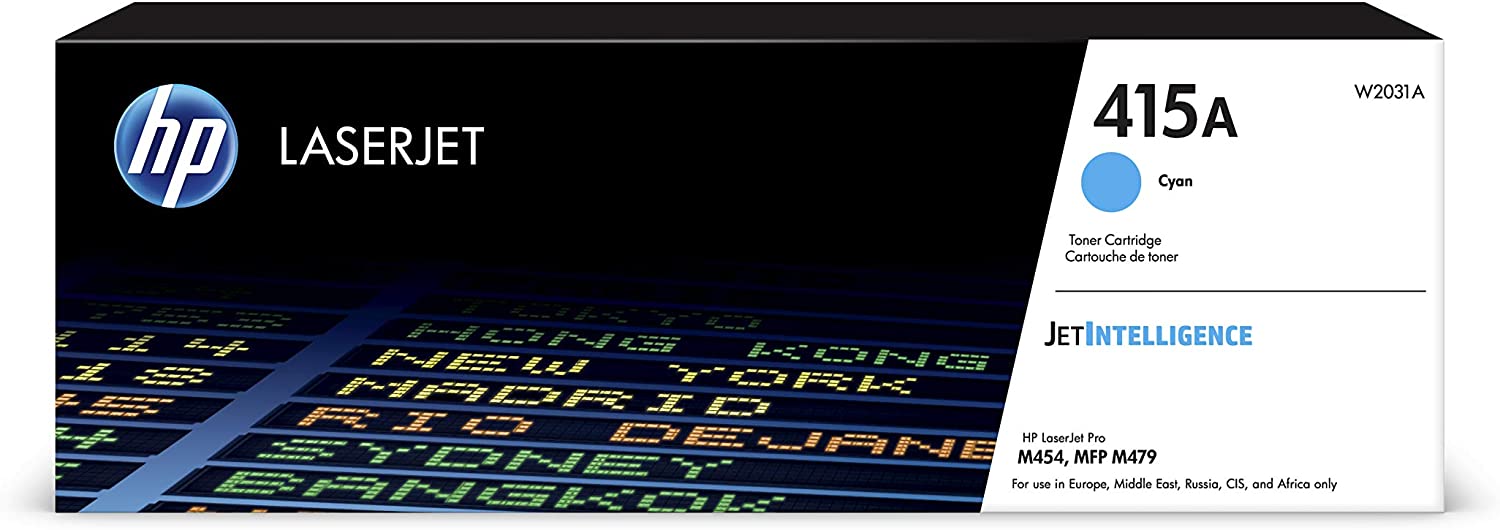 Printer Specifications Print technology Laser Print Resolution Print Resolution Technologies JetIntelligence Box contents What’s in the box Toner cartridge Recycling guide Cartridges and Printheads Page yield (color) 2,100 pages Color(s) of printing supplies Cyan Selectability 415A Page yield footnote Approximate average composite cyan, yellow, magenta yield based on ISO/IEC 19798. Actual yield varies considerably based on content of printed pages and other factors. For details see http://www.hp.com/go/learnaboutsupplies . Weights Weight ~0.6 kg Package weight ~0.86 kg Dimensions Minimum dimensions (W x D x H) 363 x 102 x 123 mm Package dimensions (W x D x H) 363 x 102 x 123 mm