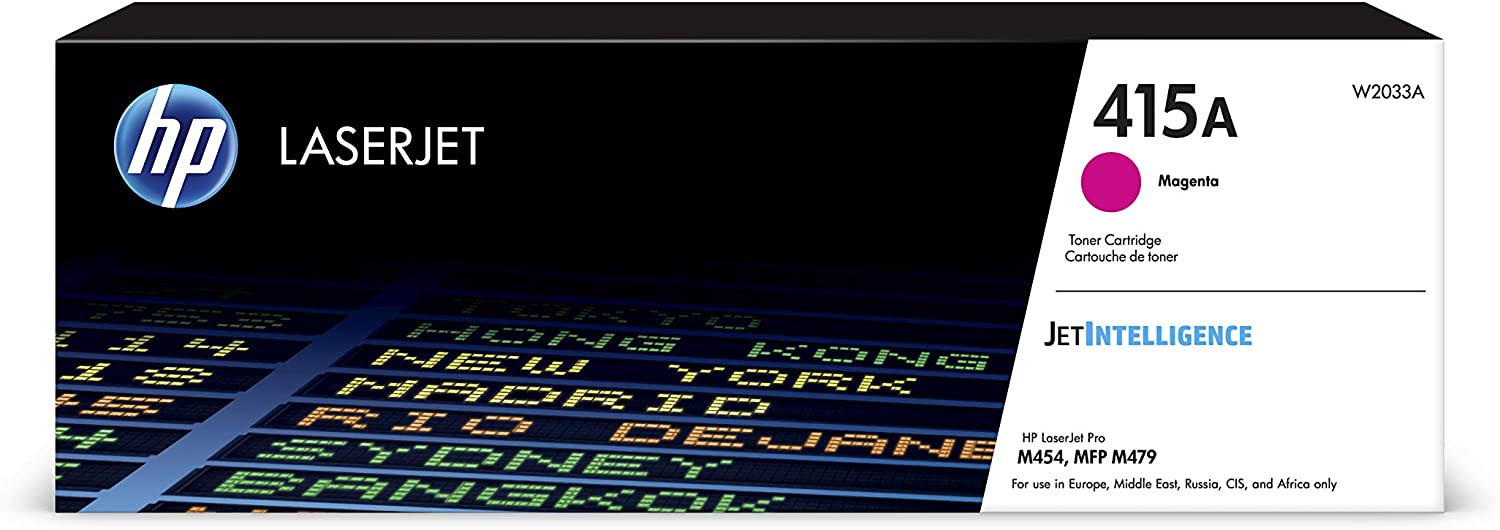 Printer Specifications Print technology Laser Print Resolution Print Resolution Technologies JetIntelligence Box contents What’s in the box Toner cartridge Recycling guide Cartridges and Printheads Page yield (color) 2,100 pages Color(s) of printing supplies Magenta Selectability 415A Page yield footnote Approximate average composite cyan, yellow, magenta yield based on ISO/IEC 19798. Actual yield varies considerably based on content of printed pages and other factors. For details see http://www.hp.com/go/learnaboutsupplies . Weights Weight ~0.6 kg Package weight ~0.86 kg Dimensions Minimum dimensions (W x D x H) 363 x 102 x 123 mm Package dimensions (W x D x H) 363 x 102 x 123 mm Key Features: Original HP Toner Cartridge – exceptional reliability and consistent print quality Page Yield: 2100 Per Cartridge Cartridges Per Pack: 1 For use with: HP Colour LaserJet M454dn; M454dw, HP Colour LaserJet Pro M479dw; M479fnw; M479fdn ;M479fdw Recycle HP Original Cartridges for free with HP’s Planet Partners Programme – 100 percent of Original HP Toner Cartridges contain recycled content