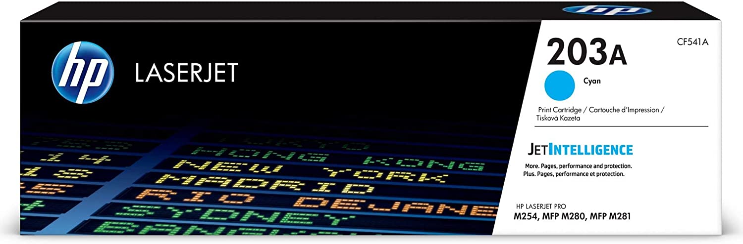 This HP 203A Cyan Toner cartridge has been precisely created to deliver quality and reliable printing results. This is done by working harmoniously with HP paper and your HP printer. Over 50 Percent of the printing technology of your HP printer is contained within the cartridge itself; meaning every time you replace your toner cartridge you are installing a brand new print engine. Unlike non-HP cartridges which can sometimes have hidden costs, Original HP Toner cartridges offer total value for money in the form of flawless, hassle-free printing and are carefully crafted to match your printer’s size, speed, fusing temperature and paper type. Therefore, allowing you to maximise the impact of documents when you print. All HP Original Toner contains recycled content, and once finished, it can be recycled with HP (see pack for instructions). Download the pre-paid postage labels from the HP website to return used products for recycling. The page yield is: 1300 pages. Page yield refers to an estimated yield reached by an industry-standard calculation. However, a number of other factors can affect page yield (example: printer, printer settings, types of pages printed and page content) so this number is not guaranteed and should be taken as a guide only. Choosing a high yield (X) cartridge gives you a better cost per page, and you’ll be helping the environment with reducing the materials and packaging used. Other cartridges within the HP 203 toner family are – Standard Cartridges HP 203A Original Black LaserJet Toner Cartridge (CF540A) HP 203A Original Cyan LaserJet Toner Cartridge (CF541A) HP 203A Original Yellow LaserJet Toner Cartridge (CF542A) HP 203A Original Magenta LaserJet Toner Cartridge (CF543A) High Yield Cartridges HP 203X High Yield Original Black LaserJet Toner Cartridge (CF540X) HP 203X High Yield Original Cyan LaserJet Toner Cartridge (CF541X) HP 203X High Yield Original Yellow LaserJet Toner Cartridge (CF542X) HP 203X High Yield Original Magenta LaserJet Toner Cartridge (CF543X) This cartridge is compatible for use with the following HP Printer models only. Using your HP cartridge alongside an HP printer results in the perfect balance of colour, permanence and reliability. HP Colour LaserJet Pro M254nw (T6B59A) HP Colour LaserJet Pro M254dw (T6B60A) HP Colour LaserJet Pro MFP M280nw (T6B80A) HP Colour LaserJet Pro MFP M281fdn (T6B81A) HP Colour LaserJet Pro MFP M281fdw (T6B82A) Legal Disclaimer Product is sourced and shipped from the European Economic Area (EEA). Product is genuine original from manufacturer authorised distributors. Key Features: Original HP Toner Cartridge – exceptional reliability and consistent print quality Page Yield: 1300 Per Cartridge Cartridges Per Pack: 1 For use with: HP Colour LaserJet Pro M254, MFP M280/281, M281CDW. Recycle HP Original Cartridges for free with HP’s Planet Partners Programme – 100 percent of Original HP Toner Cartridges contain recycled content