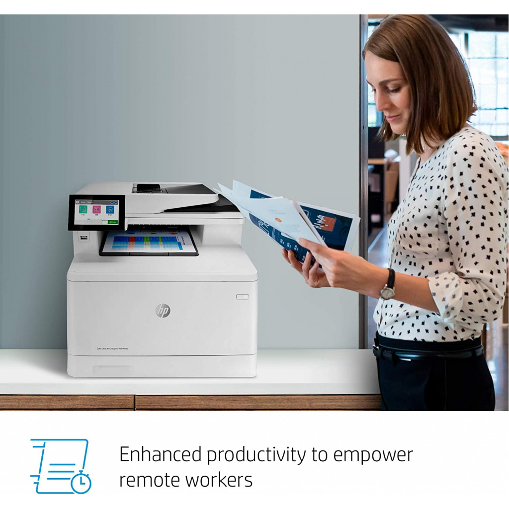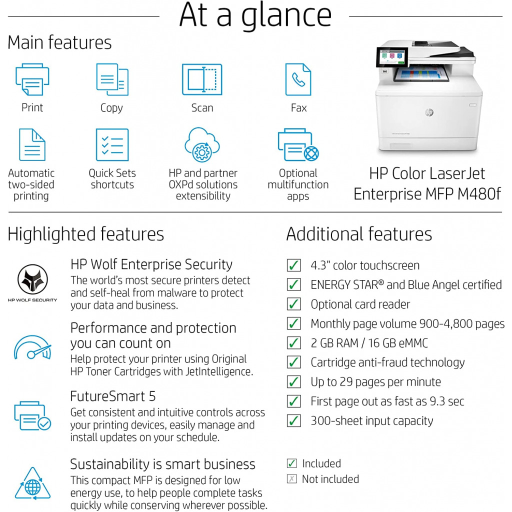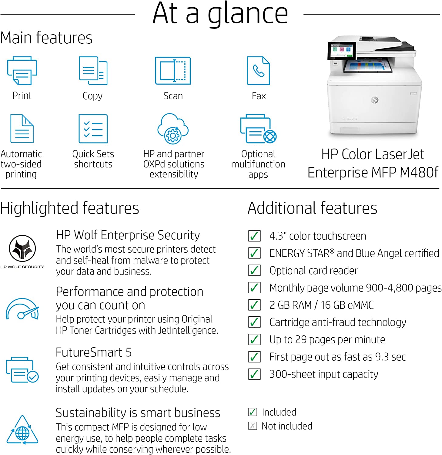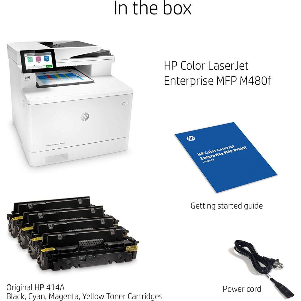Key Features: HP Color LaserJet Enterprise M480f Multifunction Duplex Printer – White Easy to use, simple to manage: Print, scan, copy and fax with the entry-level HP Color LaserJet Enterprise M480f Multifunction Printer, a laser printer with speeds up to 29 ppm, a 50-sheet automatic document feeder and strong security Enhanced productivity to empower work teams: Support mobile workers with optional multifunction apps that meet your specific business needs Build business efficiency: Centralize control of your printing environment with HP Web JetAdmin HP Wolf Enterprise Security: The world’s most secure printers are always on guard with defensive layers to detect and self-heal from malware, and protect your data and business Automatic 2-sided printing: Speed through tasks and save paper by printing two-sided documents Sustainability is smart business: Reduce wasted paper and toner by only printing jobs that are truly needed, using HP Roam for Business Print cartridges you can trust: Avoid reprints, wasted supplies and service calls by using Original HP 414A/414X cartridges designed for your color printer One-year, onsite warranty: Get help with 24-hour, 7 days a week FREE HP phone support