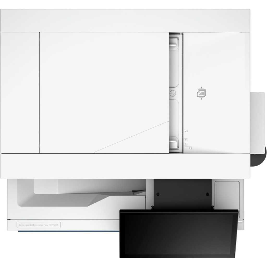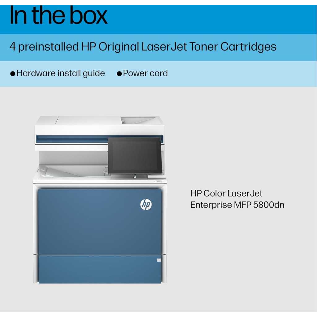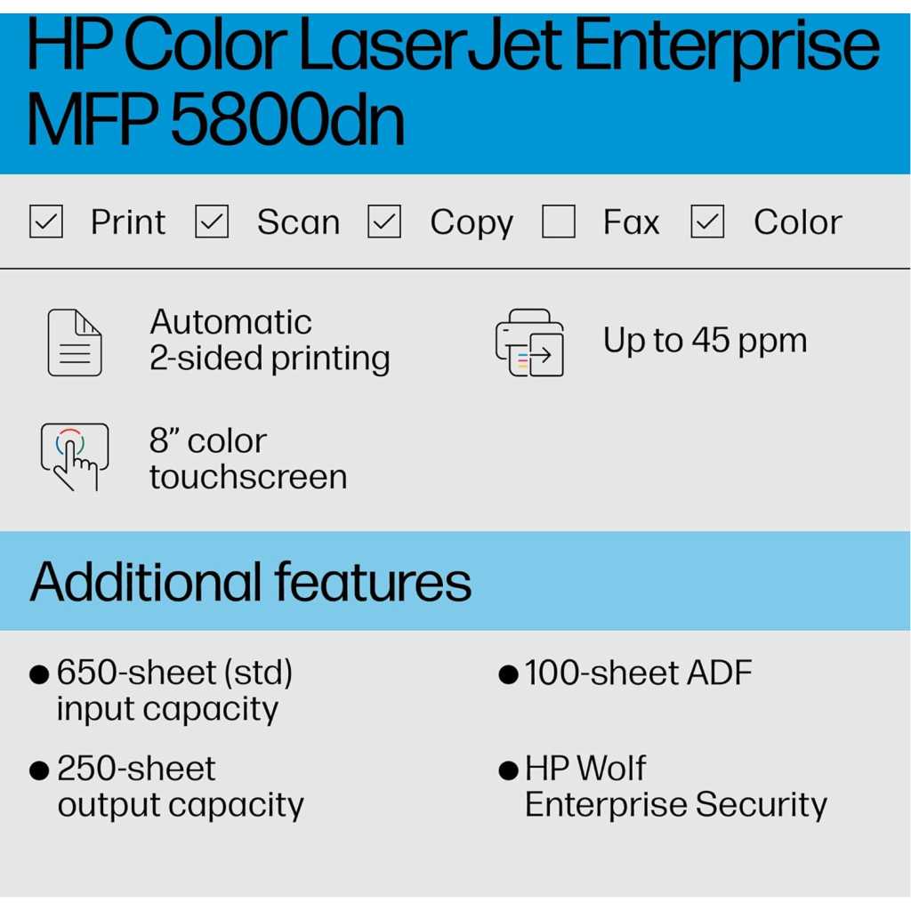 The HP Color LaserJet Enterprise MFP 5800dn is a high-performance multifunction printer designed to meet the demanding needs of large workgroups and enterprises. This robust and reliable device offers exceptional print quality, fast print speeds, and advanced features to streamline your workflow and enhance productivity. With its intuitive touchscreen interface, versatile connectivity options, and robust security features, the 5800dn is the perfect solution for businesses that demand the best. Exceptional Print Quality and Speed Experience professional-quality color prints with the HP Color LaserJet Enterprise MFP 5800dn. This printer delivers sharp text, vibrant colors, and crisp graphics at resolutions up to 1200 x 1200 dpi. Enjoy blazing-fast print speeds of up to 45 pages per minute (ppm), ensuring you get your work done quickly and efficiently. The automatic duplex printing feature allows you to print on both sides of the page, saving paper and reducing costs. Versatile Connectivity and Integration The HP Color LaserJet Enterprise MFP 5800dn offers seamless integration into your existing network infrastructure. With its Gigabit Ethernet connectivity, you can easily connect the printer to your network and share it with multiple users. The printer also supports various mobile printing solutions, allowing you to print from your smartphone or tablet with ease. Streamlined Workflow with Advanced Features The HP Color LaserJet Enterprise MFP 5800dn is packed with advanced features to streamline your workflow and boost productivity. The 8-inch color touchscreen provides intuitive control over all printer functions, making it easy to navigate and configure settings. The printer also features a 100-sheet automatic document feeder (ADF) for scanning and copying multi-page documents quickly and efficiently. Robust Security for Peace of Mind Protect your sensitive data and documents with the HP Color LaserJet Enterprise MFP 5800dn’s robust security features. The printer comes with HP Wolf Pro Security, which offers built-in protection against malware and unauthorized access. It also features secure boot, password protection, and other security measures to safeguard your information. Technical Specifications: Functions: Print, copy, scan Print Speed: Up to 45 ppm (black and color) First Page Out: As fast as 8.5 sec (black) Print Resolution: Up to 1200 x 1200 dpi Duplex Printing: Automatic Mobile Printing: Apple AirPrint, Mopria-certified Connectivity: Gigabit Ethernet, USB Scanner Type: Flatbed, ADF Scan Speed: Up to 100 ipm (duplex) Scan Resolution: Up to 1200 x 1200 dpi Scan to: Email, network folder, USB Copy Speed: Up to 45 cpm (black and color) Copy Resolution: Up to 600 x 600 dpi Input Capacity: 650 sheets (standard), up to 3,250 sheets (with optional trays) Output Capacity: 250 sheets Display: 8-inch color touchscreen Processor: 1.2 GHz Memory: 2 GB Duty Cycle: Up to 175,000 pages Dimensions: 22.9 x 20.1 x 22.6 inches Weight: 72.8 lbs Security Features: HP Wolf Pro Security, secure boot, password protection