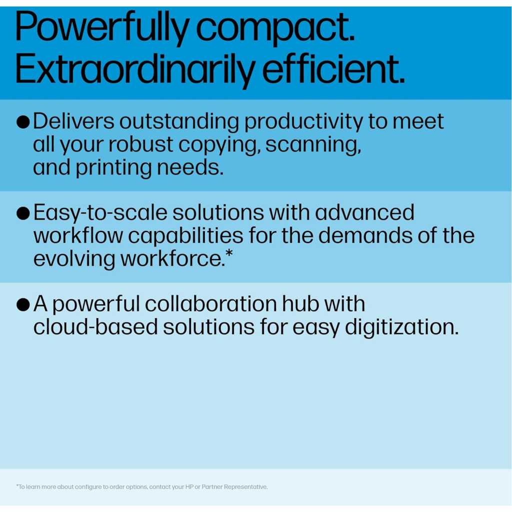 Key Features: Functions: Print, copy, scan Print Speed: Up to 45 ppm (black and color) First Page Out: As fast as 8.5 sec (black) Print Resolution: Up to 1200 x 1200 dpi Duplex Printing: Automatic Mobile Printing: Apple AirPrint, Mopria-certified Connectivity: Gigabit Ethernet, USB Scanner Type: Flatbed, ADF Scan Speed: Up to 100 ipm (duplex) Scan Resolution: Up to 1200 x 1200 dpi Scan to: Email, network folder, USB Copy Speed: Up to 45 cpm (black and color) Copy Resolution: Up to 600 x 600 dpi Input Capacity: 650 sheets (standard), up to 3,250 sheets (with optional trays) Output Capacity: 250 sheets Display: 8-inch color touchscreen Processor: 1.2 GHz Memory: 2 GB Duty Cycle: Up to 175,000 pages Dimensions: 22.9 x 20.1 x 22.6 inches Weight: 72.8 lbs Security Features: HP Wolf Pro Security, secure boot, password protection