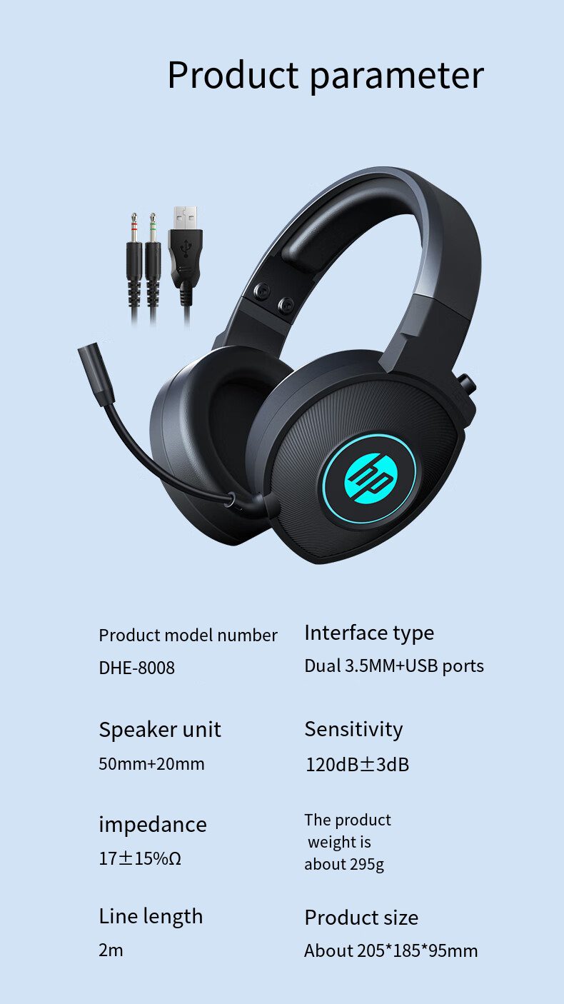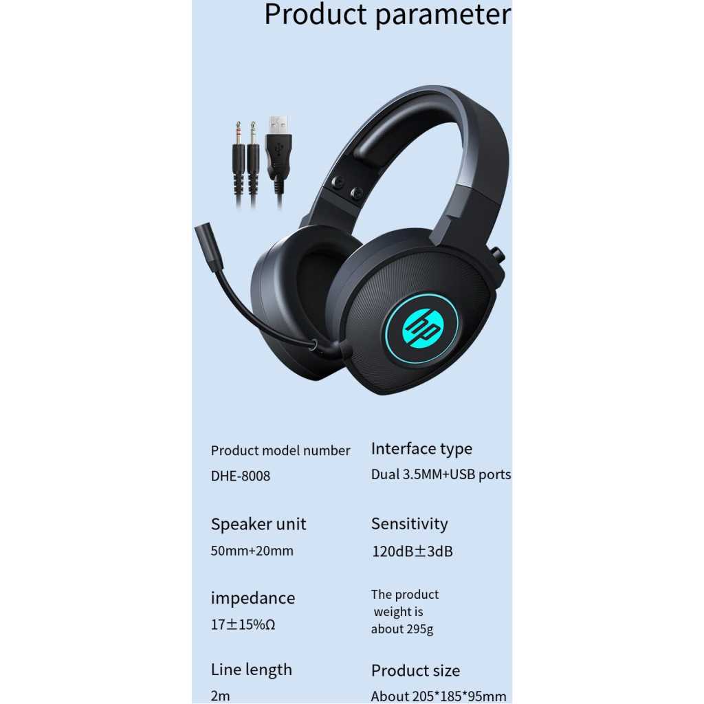 HP DHE-8008 Gaming Headset HP DHE-8008 Gaming Headset , Over Ear 3.5mm Stereo Sound Headphones – Blue LED Backlit with Microphone For PCs, Laptops , PS4 ,PS5 Xbox | Black Key Features: 3.5mm stereo sound. Blue LED Lighting Self-Adjusting Headband Skin-friendly breathable earmuffs For PCs, Laptops, PS4, PS5, Xbox