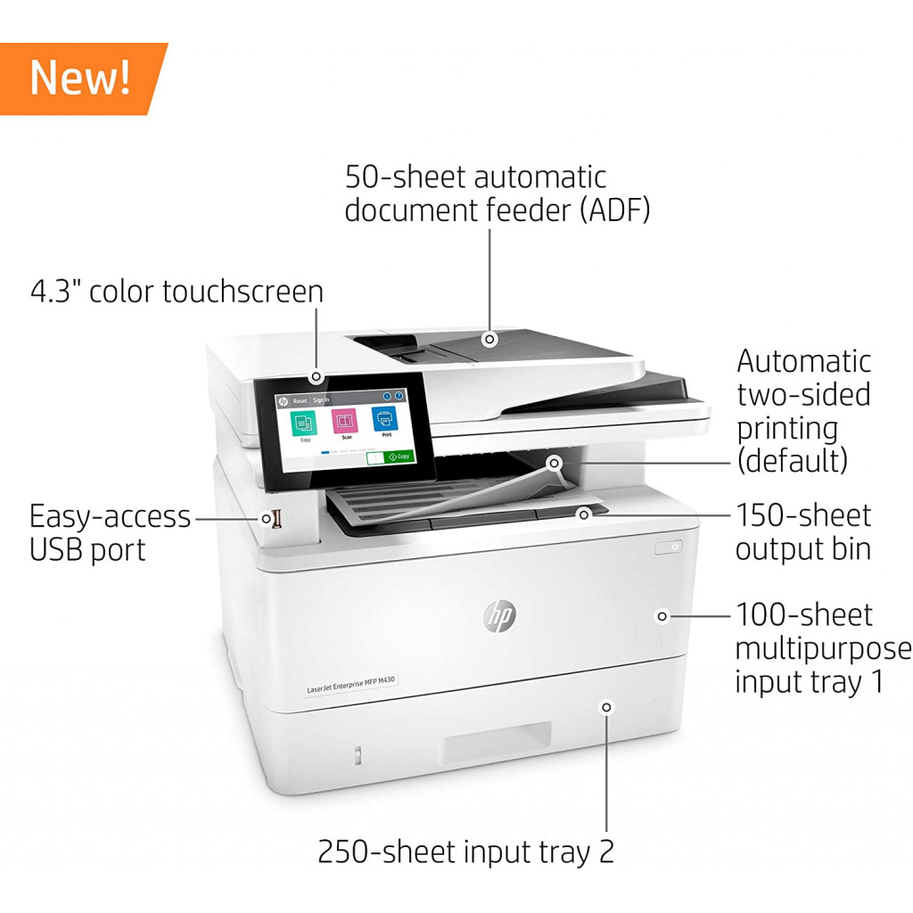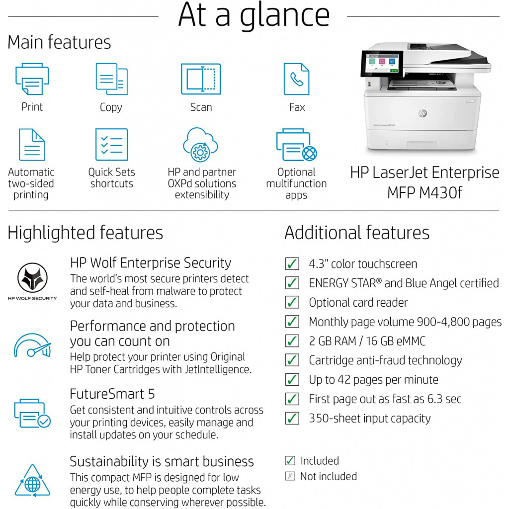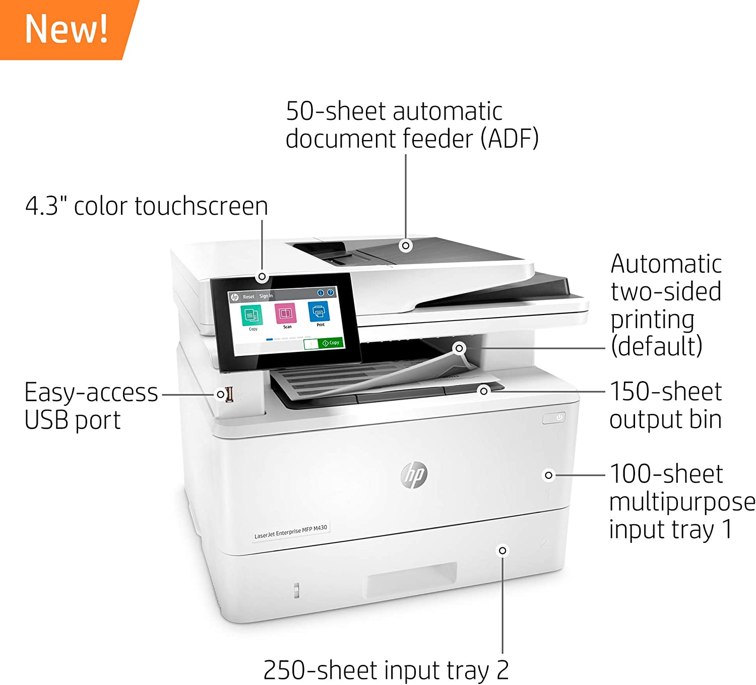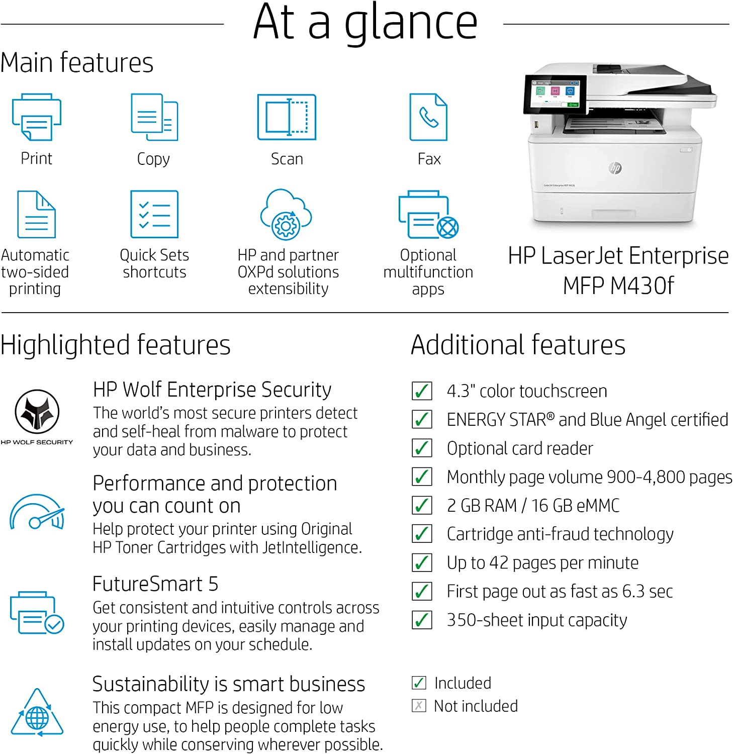 Key Features: HP LaserJet Enterprise MFP M430f Monochrome All-in-One Printer with integrated Ethernet and duplex printing Easy to use, easy to manage: Print, scan, copy, and fax with the entry-level HP LaserJet Enterprise MFP M430f, a laser printer with speeds up to 42 ppm, a 50-sheet automatic document feeder, and strong security Enhanced productivity to empower work teams: Support mobile workers with optional multifunction apps that meet your specific business needs Build business efficiency—HP FutureSmart firmware is upgradable with the latest features to optimize your investment for years to come HP Wolf Enterprise Security: The world’s most secure printers are always on guard with defensive layers to detect and self-heal malware and protect your data and business Automatic 2-sided printing: Speed up tasks and save paper by printing documents double-sided Sustainability is smart business – reduce paper and toner waste by only printing jobs that are actually needed, using HP Roam for Business Print cartridges you can trust – avoid reprints, wasted supplies and service calls by using Original HP 58A/58X cartridges designed for your printer One year, on-site warranty: