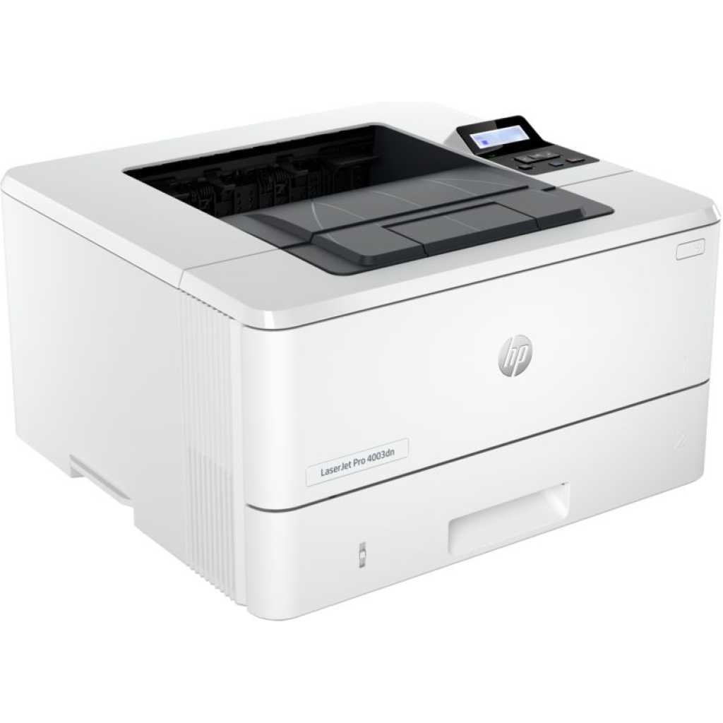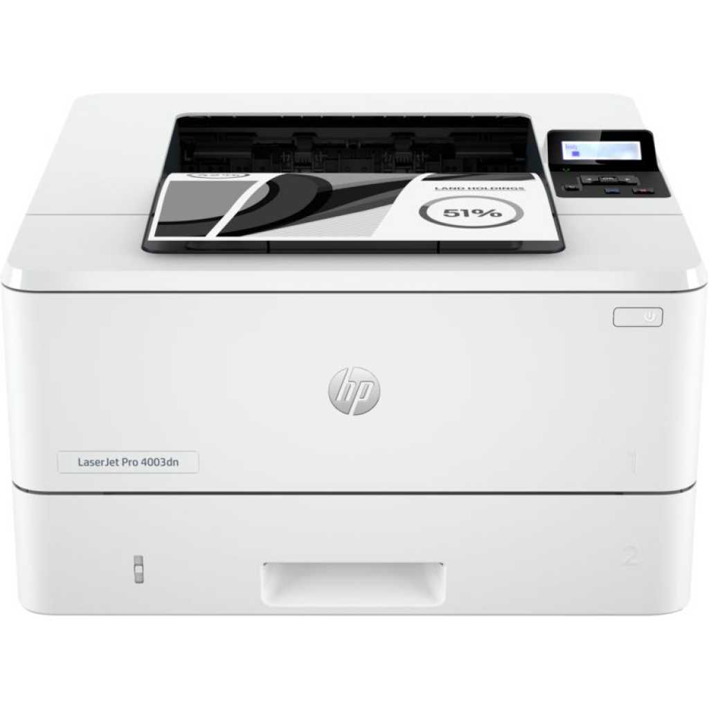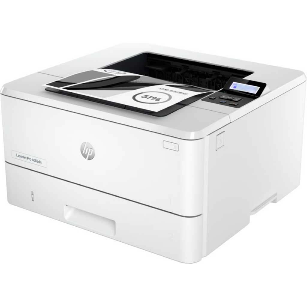 HP LaserJet Pro 4003DN Printer (2Z609A, Print, Up to 40 ppm, Auto Duplex, 1200MHz). Maximum effectiveness Enhanced IT control, lightning-fast speeds, and excellent performance will help you optimize office performance. Maximum effectiveness Utilize the HP Smart app’s convenient shortcuts and smart productivity tools to complete more tasks from anywhere at any time. Efficient management. With a single web-based interface called Smart Admin, you can easily configure and manage your fleet of HP printers that are linked to the cloud from anywhere. Your printers are prepared for use when you are thanks to their strong networking features and clever administration tools. Wolf Pro Security from HP. With preconfigured settings and ongoing updates, embedded, proactive security is ready to use and helps to keep your organization secure. Key Features: HP LaserJet Pro 4003DN Printer (2Z609A, Print, Up to 40 ppm, Auto Duplex, 1200MHz). – Functions: Print Only – Print speed: Up to 40 ppm – Print quality: 1200 x 1200 dpi – Monthly Duty cycle: Up to 80,000 pages – Connectivity: 1 Hi-Speed USB 2.0; 1 host USB at rear side; Gigabit Ethernet 10/100/1000BASE-T network; 802.3az(EEE) – Display: 2-line back lit LCD graphic display – Processor speed: 1200 MHz – Memory: 256 MB