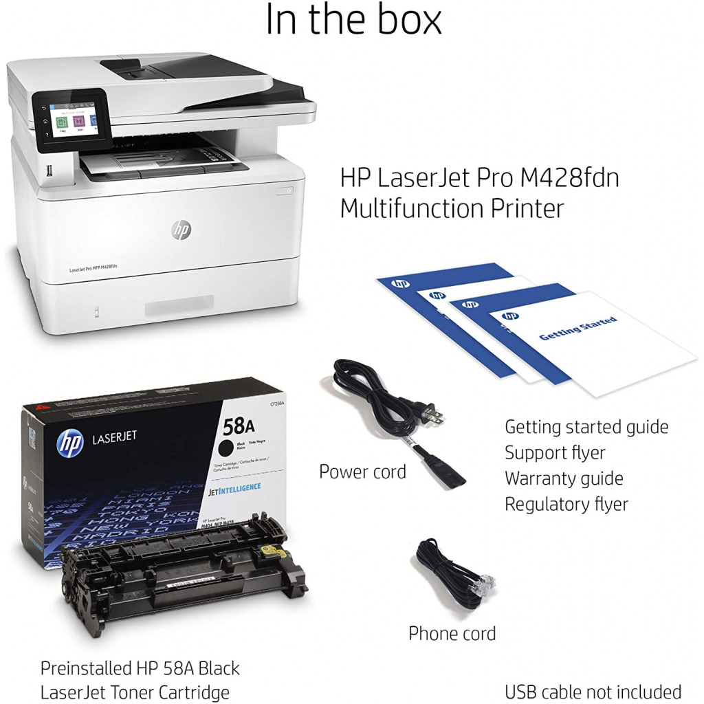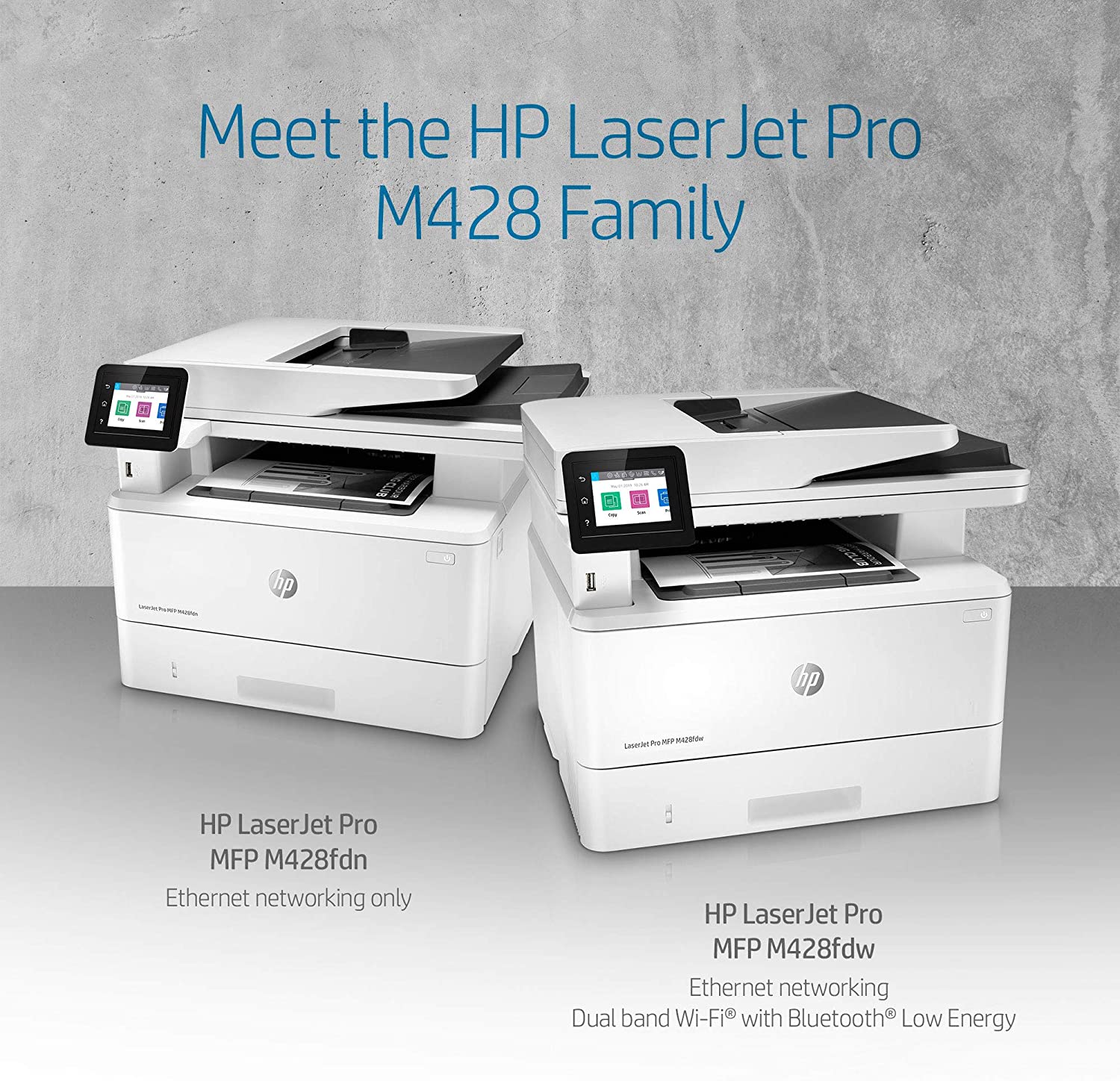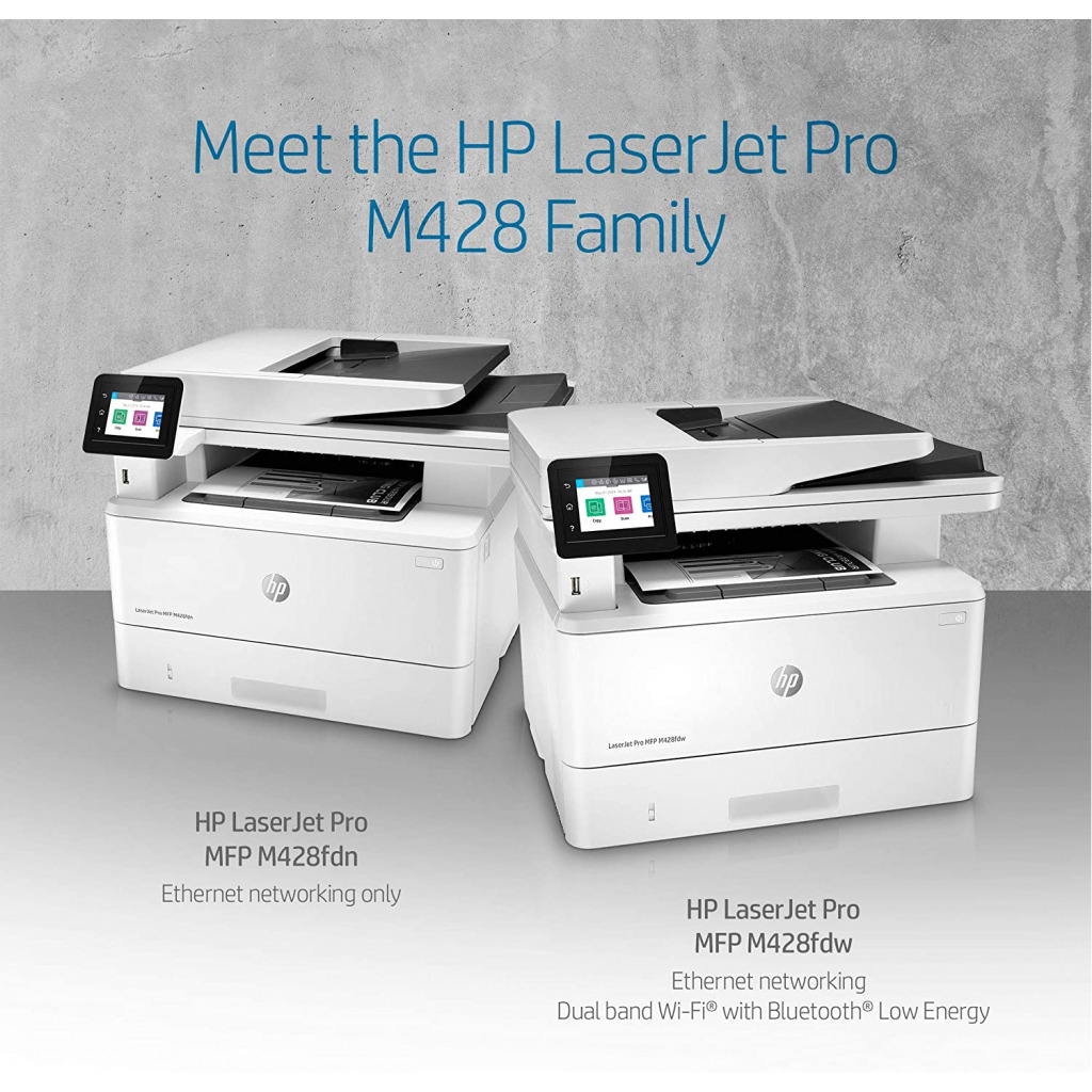 Key Features: HP LaserJet Pro MFP M428fdn Monochrome All-in-One Printer with built-in Ethernet & 2-sided printing, (W1A29A) BUILT TO KEEP YOUR BUSINESS MOVING FORWARD – Print, scan, copy and fax consistently high-quality documents with the HP LaserJet Pro Multifunction M428fdn, a monochrome laser printer designed to let you focus on growing your business HP WOLF PRO SECURITY – Protect company data and safeguard against cyberattacks with protection built into the printer hardware, firmware and OS AUTOMATE COMPLICATED WORKFLOWS – Help save time by automating steps in a complicated workflow, and apply your saved settings at a touch of a button via the customizable control panel WALK-UP USB PRINTING – Print Microsoft Office-formatted files in addition to PDFs right off your USB drive, using a port on the front of the printer, and save paper with automatic 2-sided printing.Operating temperature range:50 to 90.5°F SPEED THROUGH TASKS – Stay productive with single-pass, 2-sided scanning, 50-sheet auto document feeder, 250-sheet input tray, and print speeds of up to 40 pages a minute from this multifunction laser printer.Power consumption:510 watts (active printing) ENHANCED ENERGY EFFICIENCY – Designed with the environment in mind, HP LaserJet Pro MFP M428fdn saves up to 22% energy over prior products, with technologies that help reduce paper waste TONER CARTRIDGES YOU CAN TRUST – Avoid reprints, wasted supplies, and service calls by using Original HP 58A/58X toner cartridges designed for your multifunction laser printer ONE-YEAR LIMITED HARDWARE – Get help with 24-hour, 7 days a week HP Web support. See specification sheet for terms and conditions.Power consumption:510 watts (active printing)