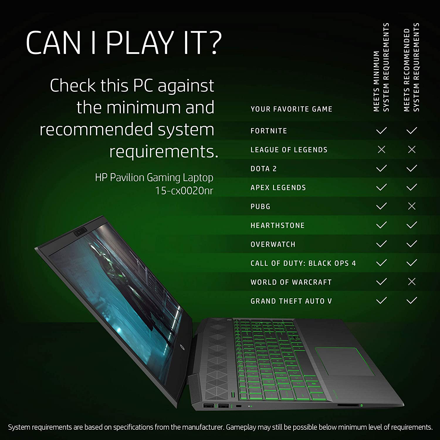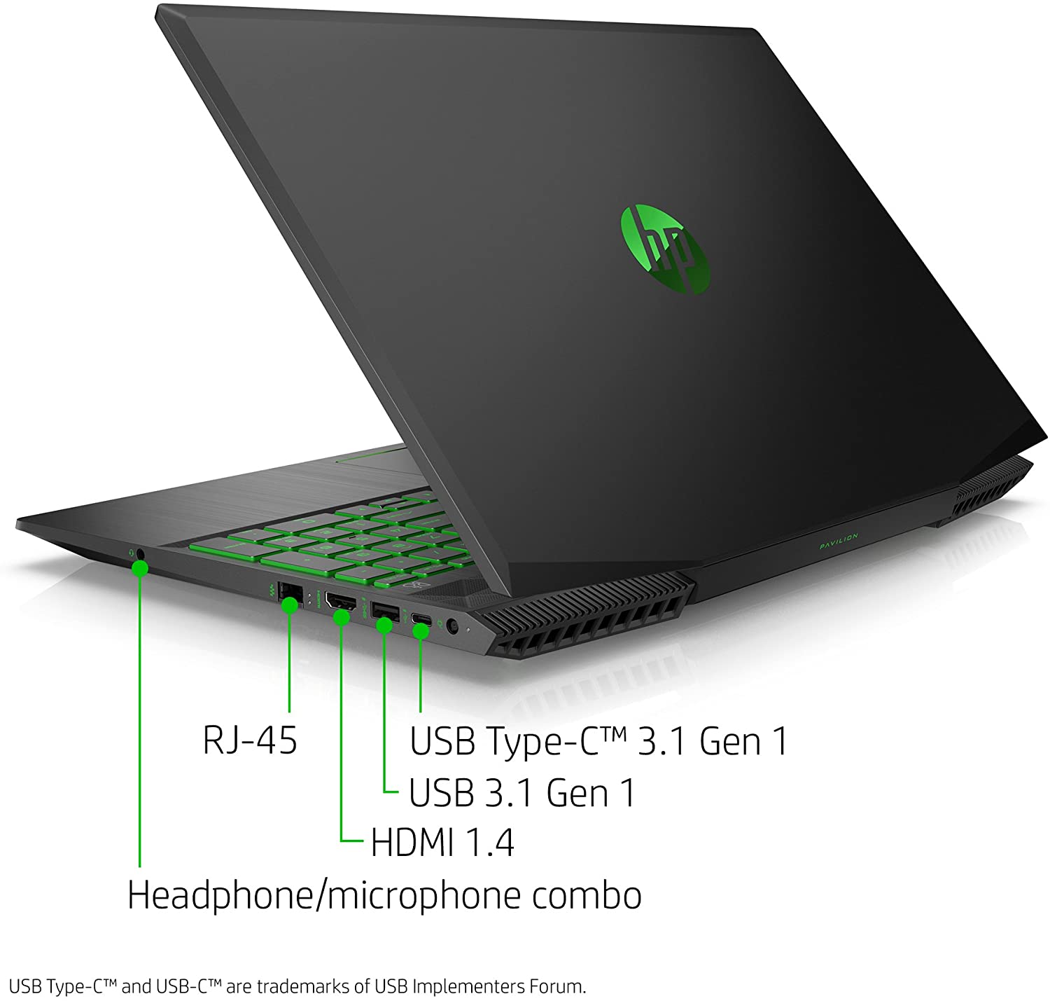 The thin and powerful HP Pavilion Gaming Laptop lets you experience high-grade graphics and processing power that meets your gaming and multitasking needs. Operating system: Windows 10 Home Processor: 9th Generation Intel® Core™ i5-9300H Display: 15.6-inch diagonal FHD, IPS, anti-glare, micro-edge, WLED-backlit Memory: 8 GB DDR4-2666 SDRAM (1 x 8 GB) Internal storage: 256 GB PCIe® NVMe™ M.2 SSD Graphics: NVIDIA® GeForce® GTX 1650 (4 GB GDDR5 dedicated) Sound: Audio by B&O with dual speakers Battery life: Up to 8 hours and 30 minutes (mixed usage) Up to 8 hours (video playback) Up to 5 hours and 30 minutes (wireless streaming) Wireless: Realtek 802.11b/g/n/ac(2×2) and Bluetooth® 4.2 combo Camera: HP Wide Vision HD Camera with integrated dual array digital microphone Product weight: 4.92 lb Keyboard: Full-size island-style acid green backlit keyboard with numeric keypad