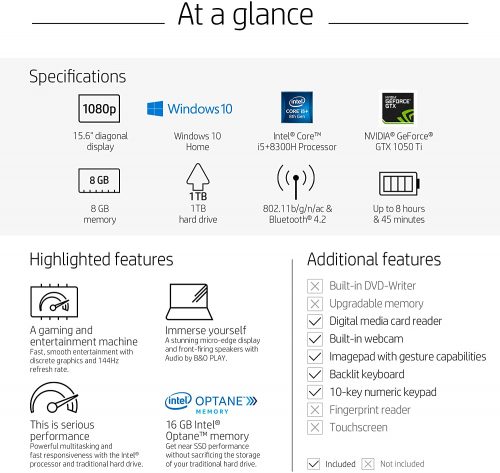Key Features: Processor: 8th Generation Intel(R) Core(TM) i5+8300H Processor (Core i5 and Intel Optane memory), Quad-Core, 2.3GHz up to 4.0GHz. Video graphics: NVIDIA GeForce GTX 1050 Ti (4 GB GDDR5 dedicated). Display: 15.6-inch diagonal FHD IPS anti-glare micro-edge WLED-backlit (1920 x 1080) with 144Hz refresh rate. Memory: 8 GB DDR4-2666 SDRAM (not upgradable). Hard drive: 1 TB 5400 RPM SATA hard drive. Battery life: Up to 8 hours and 45 minutes (mixed usage); up to 7 hours and 45 minutes (video playback); up to 5 hours and 30 minutes (wireless streaming). Dimensions and weight (unpackaged): 14.40 inches (W) x 10.01 inches (D) x 1.00 inch (H); 5.18 pounds. Operating system: Windows 10 Home.
