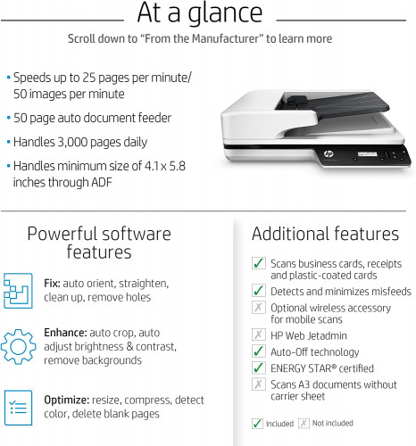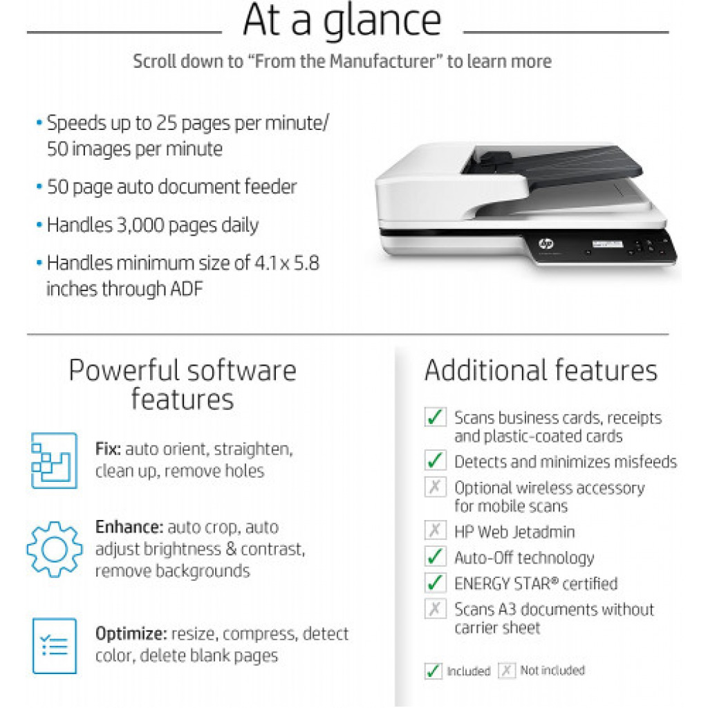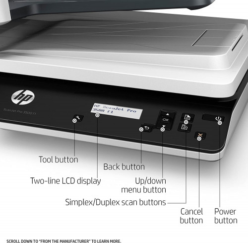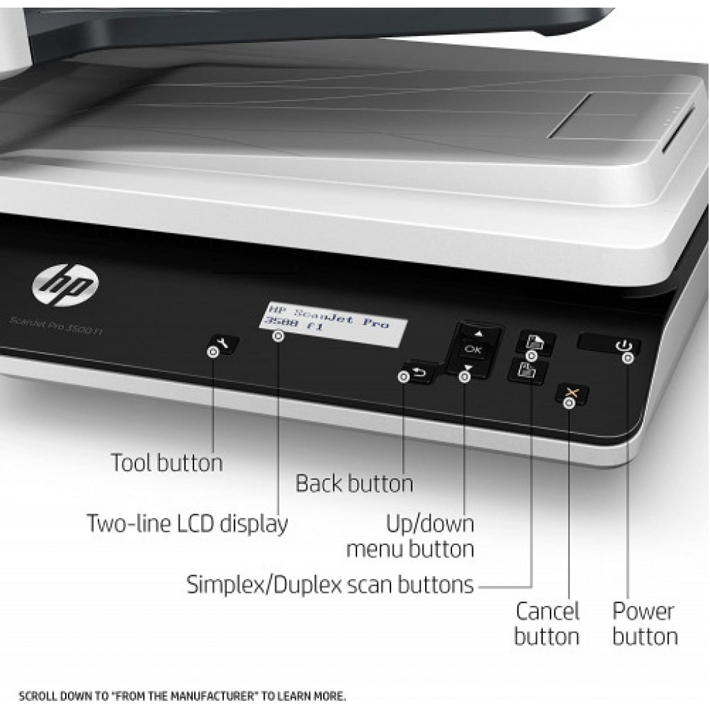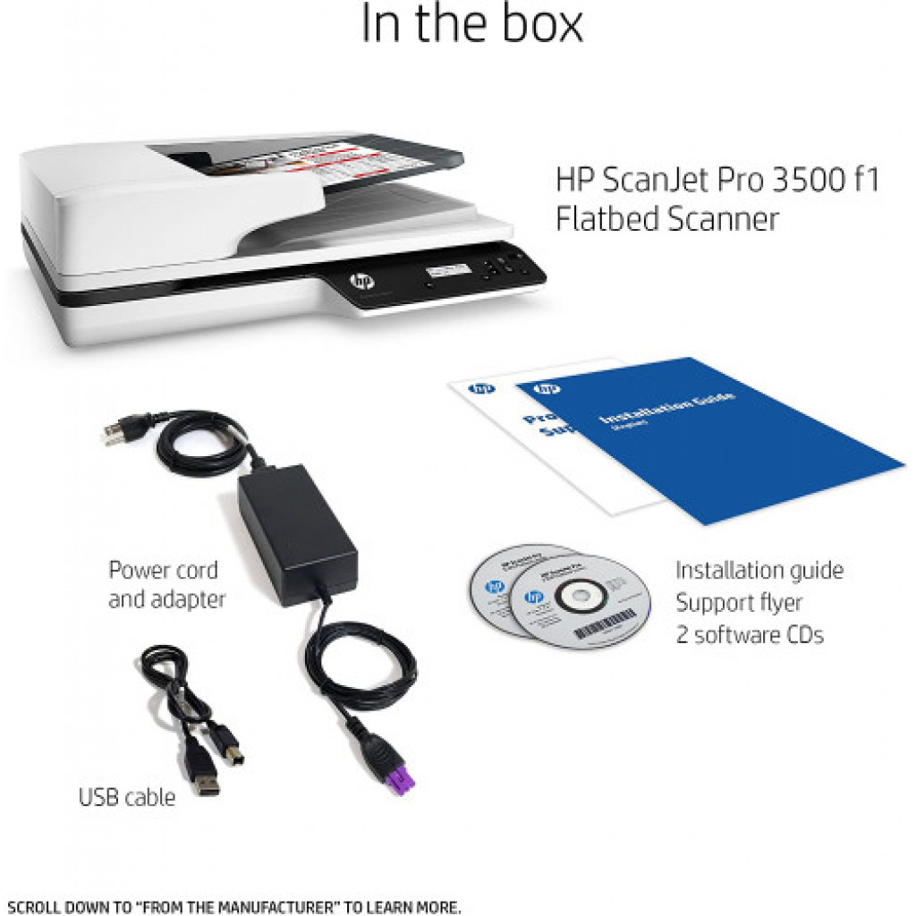HP ScanJet Pro 3500 f1 Scanner Whether it’s used in the office or at home, this versatile scanner from HP promises to produce outstanding results every time. This computer can be used conveniently with basic operating instructions since it can fit into both Windows and Mac systems. The HP ScanJet Pro 3500 f1 is also a fast scanner, capable of scanning up to 25 pages or 50 images per minute. Scans of the highest quality are assured. Even when operating under the tightest deadlines, the scanning resolutions of this system can ensure consistently professional results. Scan resolutions of up to 600 dpi in monochrome and color are achieved by using the automatic document feeder. With a resolution of up to 1200 dpi, the flatbed scanner can produce even more detailed images. The HP ScanJet Pro 3500 f1 allows you to work quickly without losing high-quality performance, whether you use the flatbed scanner to scan bulkier media or the ADF to scan in files quickly. You’ll be able to handle any workload with ease. The HP ScanJet Pro 3500 f1 is designed to scan up to 3,000 sheets a day, making it an excellent option for even the most hectic office environment. This scanner is built to combine reliability and excellence with ease, with no need to warm up and the ability to use pre-set one-button scan settings. Effortlessly organize and edit The HP ScanJet Pro 3500 f1 makes for a beautifully simplified editing process thanks to HP Scan and I.R.I.S. ReadirisTM Pro OCR software. It’s never been easier to search in files and save time at the same time, thanks to tools that enable users to edit selected sections of any document. This HP multi-tasking machine is the best option for fast, skilled media handling. HP ScanJet Pro 3500 f1 Scanner Detailed Specifications Scan Key Features: Fast, reliable two-sided scanning. Produce up to 50 images (25 pages) per minute with two-sided scanning. Reliably scan 3000 sheets per day. Capture every page easily—even for stacks of mixed media—with HP Every page and an ultrasonic sensor. Scan documents up to 8.5 x 122 in (21.6 x 309.9 cm) through the ADF, and use the flatbed for bulky media. Sharp images and accurate text capture. Accurately capture text from documents for easy editing with HP scan and I.R.I.S. Readiris Pro OCR software. Get sharp, true-to-life scans of documents, graphics, and photos with up to 1200 dpi resolution. Book-edge scanning prevents distorted text, even near the spine of books and other bound materials. Work smarter with quick, simple scanning. Define scan profiles for common document types and scan to multiple destinations with HP scan software. Create one-button scan settings for recurring tasks and make selections using the LCD control panel. Quickly share or archive scans directly to popular cloud destinations with HP scan software. One-year limited hardware warranty; 24-hour, 7 days a week Web support