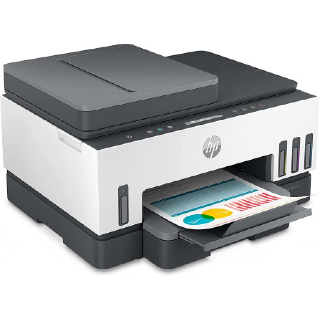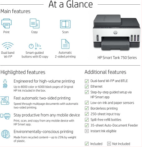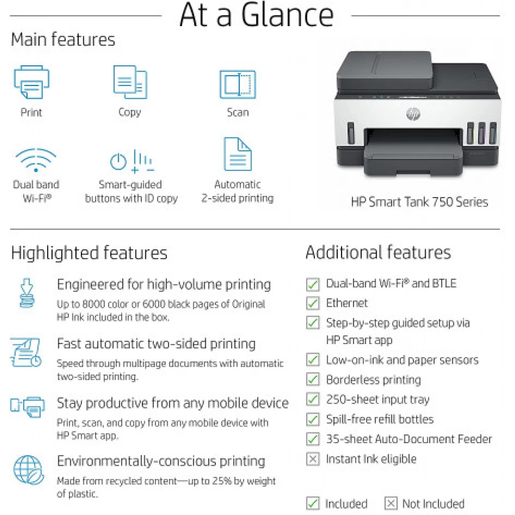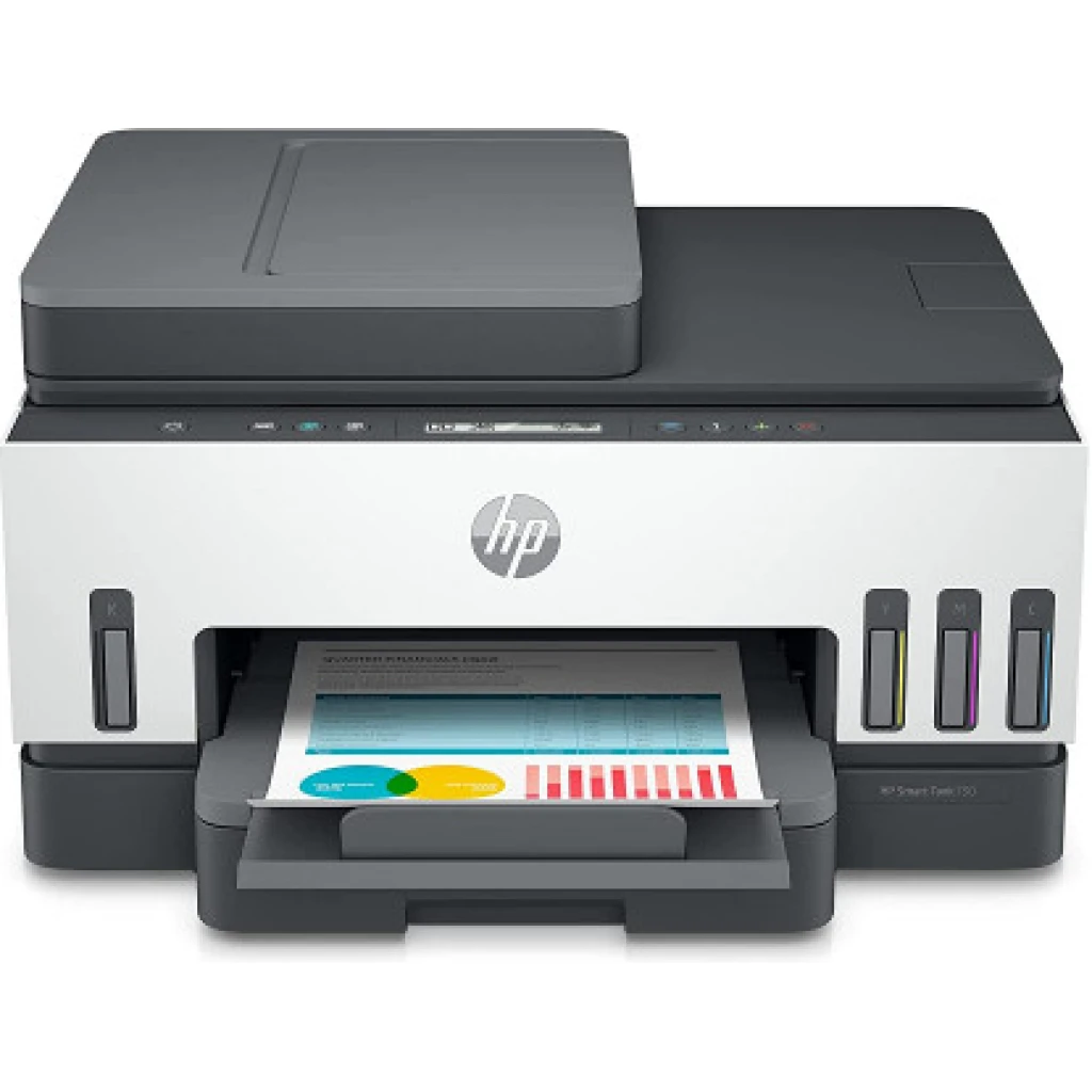 Key Features: HP Smart 750 WiFi Duplex Printer with Smart-Guided Button, Print, Scan, Copy, Wireless – Black/White HIGHLY AFFORDABLE DUPLEX WIFI PRINTER FOR YOUR PRINT, SCAN and COPY NEED : With integrated ink tanks and an automatic ink and paper sensor with Smart guided buttons. Up to 8,000 colour or 12,000 black pages are included HIGH VOLUME, LOW COST PRINTING: Print worry-free at 10 paise for Black and 20 paise for Colour WORRY FREE DUAL BAND WIRELESS WITH SELF HEALING: Get better range, faster and more reliable connections using dual band Wi-Fi.Print, scan, and copy from anywhere with the best-in-class mobile print app: HP Smart RELIABLE CONNECTIVITY: Hi-Speed USB 2.0; Wi-Fi, Bluetooth LE and LAN; INCREASE PRODUCTIVITY WITH AUTOMATIC DOCUMENT FEEDER: This all-in-1 printer’s 35-page automatic document feeder helps you breeze through scan and copy jobs quickly CONVENIENT INK MANAGEMENT: Easy to fill integrated ink tanks lets you see how much ink you have left. With newly designed ink bottles specific for each colour it’s easier than ever to fill and refill. QUICK MOBILE SETUP WITH HP SMART APP: The guided, step-by-step set up via HP Smart app; Use a smartphone or tablet to set up your printer and connect to your local wireless network. ENVIRONMENTAL CONSCIOUS PRINTING : This printer is made from recycled printers and other electronics—more than 25% by weight of plastic; EPEAT Silver certified WARRANTY : 1 year onsite warranty or 50000 pages warranty whichever is earlier from the date of purchase. Use only original HP ink. Using counterfeit ink will harm your printer as well as render your warranty void