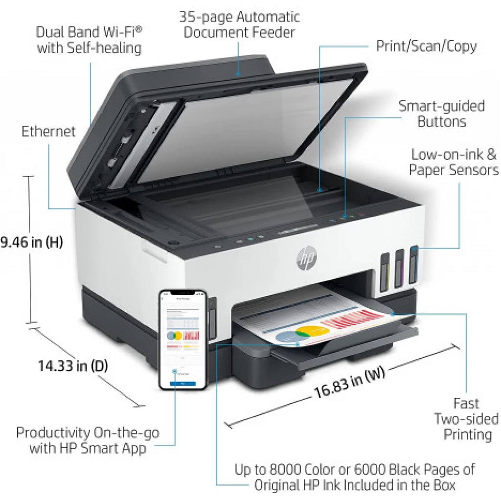 HP Smart 750 WiFi Duplex Printer with Smart-Guided Button, Print, Scan, Copy, Wireless – Black/White Simplify the printing process . Stay connected, on task, and in control with seamless mobile setup, smart guided buttons, and self-healing dual band Wi Fi®. Set up your printer easily with the help of the guided, step-by-step videos. With two-sided printing, multi-page scanning, and the HP Smart app, you can save time and increase company efficiency. Automatic two-sided printing helps you get through multi-page papers faster. Original HP ink is provided and is ideal for low-cost, high-volume printing up to 8000 color or 6000 black pages. Original HP ink is included in the box and can print up to 8000 color pages or 6000 black pages.
