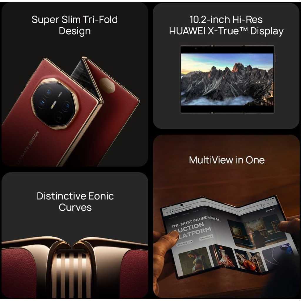 From the manufacturer Key Features: 【Free Gifts】Get Free ‘Foldable wireless Keyboard’ + ‘ 1-time Screen Protection (1 Year)’ 【Super Slim Tri-Fold Design】Tri-fold Display screen is made to be slim yet durable. Introduces Multi-directional Flexible Materials, coping with pressure from internal or external bending and adhering to strict performance requirements 【10.2-inch Hi-Res HUAWEI X-True Display】This tri-fold phone equipped with 3K HUAWEI X-True Display. Measuring with a resolution of 2232 x 3184. Boasts an ultra-high screen-to-body Ratio of 92%, with a golden 16:11 aspect ratio 【Ultra Aperture XMAGE Camera】Supports a 10-size Adjustable Physical Aperture, Equipped with a periscope telephoto lens, the device supports 5.5x optical zoom and ultra-wide-angle photography, capturing stunning scenes both near and far 【MultiView in One】 In single screen mode, it excels at efficient information processing, catering to both the need for efficient operations and portability. In dual-screen mode, it’s ideal for browsing news and emails. The triple-screen mode is perfect for entertainment and productivity