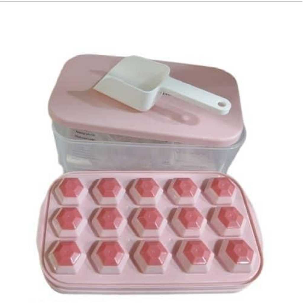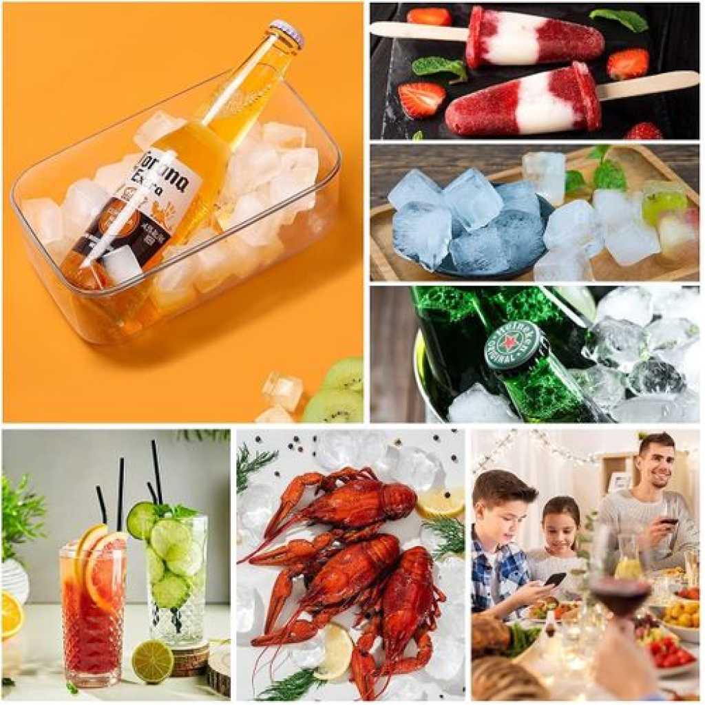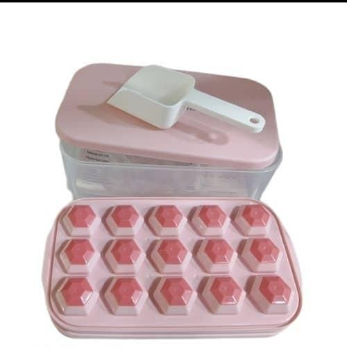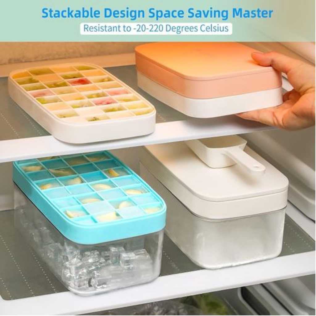 Easy Release Ice Cube Tray: Made of highly-elastic plastic, Flexible and Durable. Ice cubes release easily with just a twist. No need to wait for the ice cubes to melt a bit. You can empty the tray immediately after take it out from the freezer. The Silicone ice cube molds u0026 trays can not pour all cubes at a time. Practical Design u0026 Easy to Use: The lid keeps ice fresh and sanitary by preventing ice from absorbing freezer odors. The lid and The edges of the tray are designed higher for easy filling and easy transporting, not easy to spill. Enough Small Ice Cubes: This Ice tray makes 55 perfect mini nugget ice cubes each time, the ice bucket can holds 2 trays of cubes. So you can enjoy ice coffee or cocktails at any time. Our ice cube trays can also be used in making Miniature dessert, such as Jelly, chocolate, baby food, frozon yogurt, perfect size for ice chewer. Great for RV, home use, and parties. Safe and Convenient for Your Family: Both the tray and bin scoop are made of food-grade safety material, BPA free. The lid keeps ice cubes from absorbing freezer odor, and using scoop to take ice is more convenient and hygienic than using hand. Very suitable for non-private rooms such as office and student apartment, Stackable Ice Tray and Bin: Space-saving master. Perfect compact size is 10.6(L) x 6.7(W) x 3(H) inches, fits nicely in RV refrigerator and Home Fridges. This 3 in 1 set includes: 1 ice cube tray with lid, 1 storage container, 1 ice scooper.Food Grade Safe Material: The ice molds made of silicone and TPE material, BPA free, odorless and nontoxic. The ice cube tray with lid is safe and durable. Each tray has 32 grids, for a total of 64. Enjoy summer coolness at home, perfect for using at home, parties, whisky and bars, etc. Easy to Release: The ice cube trays bottom is made of soft silicone material not break after freezing for a long time, and is equipped with a corresponding release pressing plate which makes it easy to get ice cubes. More direct use of effects you can watch videos. Easy to Use: Pour the liquid into the ice tray for freezer for 4-6 hours. Each grid of ice tray is an independent individual, and there is a water level line on the edge of each grid to prevent too much water, which is more conducive to the separation of ice cubes. Wide Applications: The mini ice cube trays are perfect for whisky, cocktails, coffee. Try infusing mint for the perfect mojito or strawberry for a delicious lemonade. The size of each grid is 2.5×2.4×2.3cm, and you can also DIY various ice cubes. You will get: Each ice cube trays set comes with 2 layer, a 25.5*13.2*9.5cm ice container that can hold more than 200 ice cube balls and a mini scoop. This ice cube set is perfect for summer. If you have any questions please contact us at anytime.