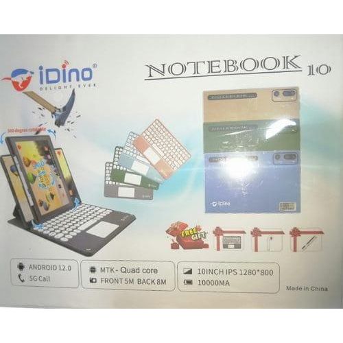 The All-New Idino NoteBook 10 is a special Tablet PC with a Dual SIM card slot and WiFi and is the Successor to the Idino Notebook 10 . A tablet produced to meet your Digital needs and make you super satisfied with an understanding of technology. This Premium Android Tablet has a decent look and it is a very nice tablet made with special material of metal and plastic, Slim and Sleeky Design, and can be used by adults and teenagers. This Android Tablet has an Android version of 12. The tablet features large, bright, and colorful icons on a 10.1-inch IPS Screen with 1080P full HD Screen Resolution letting the user navigate quickly. It has a touchscreen with ten-point touch support. The Quad-Core along with 512GB of internal storage and 8GB of RAM, makes this a highly capable tablet. WiFi facilitates easy connectivity of this tablet to different devices and calls to your beloved people by using Dual SIM cards. Let your child develop an early understanding of computer devices through the use of this tablet. IDINO Notebook 10 is a Premium model because of its high quality and awesome performance as it’s designed with a Quad-Core processor. The software of the Idino Notebook 10 is Android 12 and it can run all the applications and games no matter what are you using your tablet for. To entertain you. it’s the best choice with a 10000mAh rechargeable Li-ion battery. With a simple cable, you will be able to hook various OTG extensions and USB devices. The IDINO Notebook 10 Tablet has Multiple cameras to capture your photos beautifully. To watch videos with good colors you can enjoy 1080P Full HD Display. In general, the Notebook 10 tablet is an Edutainment system for you and your family The All-New Idino NoteBook 10 is a special Tablet PC with a Dual SIM card slot and WiFi and is the Successor to the Idino Notebook 9 . A tablet produced to meet your Digital needs and make you super satisfied with an understanding of technology. This Premium Android Tablet has a decent look and it is a very nice tablet made with special material of metal and plastic, Slim and Sleeky Design, and can be used by adults and teenagers. This Android Tablet has an Android version of 12. The tablet features large, bright, and colorful icons on a 10.1-inch IPS Screen with 1080P full HD Screen Resolution letting the user navigate quickly. It has a touchscreen with ten-point touch support. The Quad-Core along with 512GB of internal storage and 8GB of RAM, makes this a highly capable tablet. WiFi facilitates easy connectivity of this tablet to different devices and calls to your beloved people by using Dual SIM cards. Let your child develop an early understanding of computer devices through the use of this tablet. IDINO Notebook 10 is a Premium model because of its high quality and awesome performance as it’s designed with a Quad-Core processor. The software of the Idino Notebook 10 is Android 12 and it can run all the applications and games no matter what are you using your tablet for. To entertain you. it’s the best choice with a 10000mAh rechargeable Li-ion battery. With a simple cable, you will be able to hook various OTG extensions and USB devices. The IDINO Notebook 10 Tablet has Multiple cameras to capture your photos beautifully. To watch videos with good colors you can enjoy 1080P Full HD Display. In general, the Notebook 10 tablet is an Edutainment system for you and your family