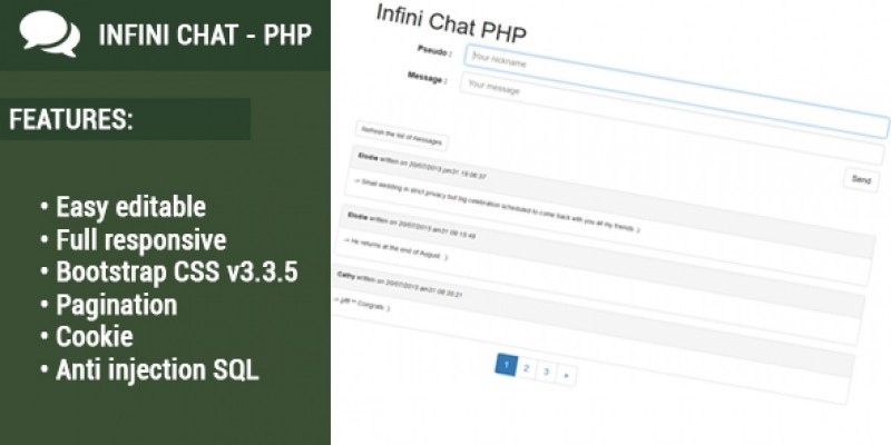 Infini Chat 2 - Responsive PHP Chat Script. Infini Chat is a social chat built on php and mysql. It allows each guest to create their own message visible to everyone.