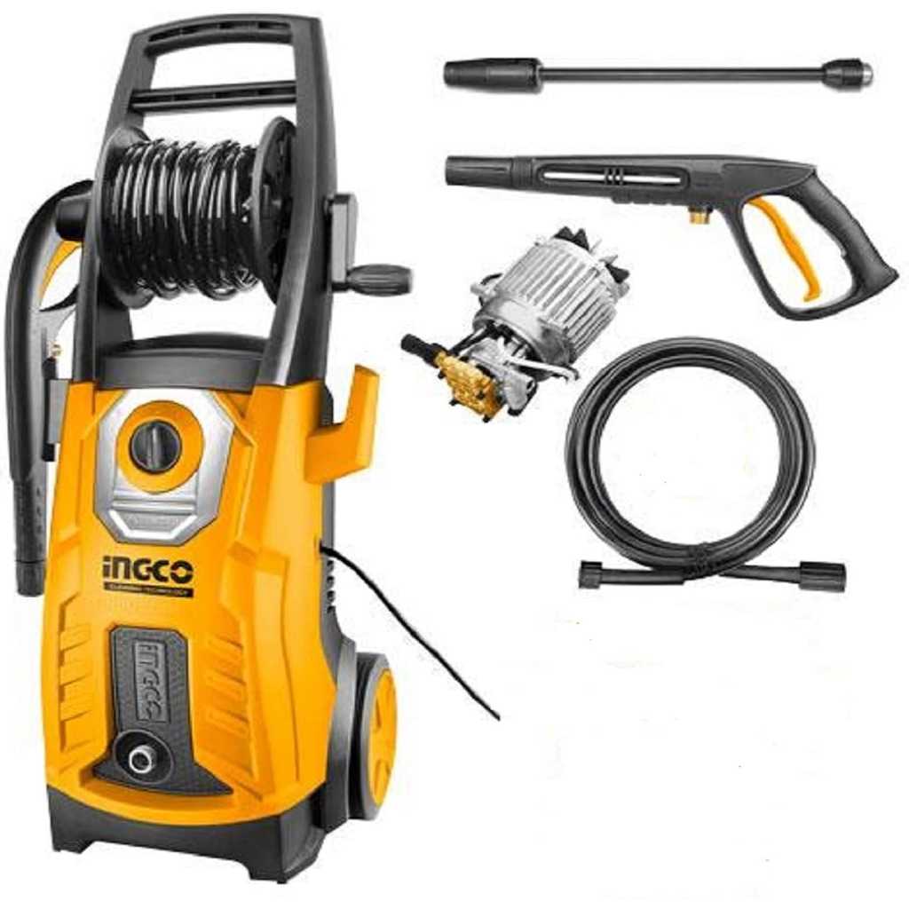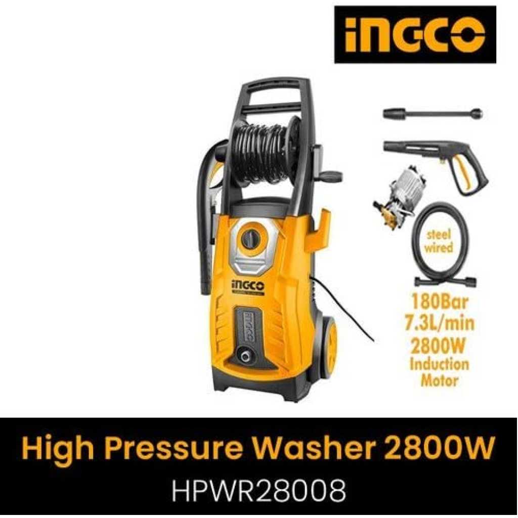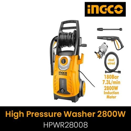 Key Features: INGCO High-Pressure Car Washer, Patented High-Pressure Washer HPWR28008, 2800W |100% Pure Copper Motor|Pressure-180 Bar, Max Flow-438 l/h, Working Radius +11 m. POWERFUL CLEANING FORCE : Powerful 2800-watt Copper wire induction motor generates up to180 bar / 438L/Hour for maximum cleaning power. perfect for decks, cement walls, pavement, pools, outdoor furniture, cars, trucks, garbage cans, animal cages and more ALL IN ONE SET : INGCO High Pressure Washer HPWR28008 can be used for Underside Cleaning of your Car ,Universal Tap Connector ,Long Spray Gun , 5m high pressure hose(steel wired) , 1pcs soap bottle 1 set water spray gun, you will get the best washing/cleaning experience using this wonderful cleaning tool AUTO STOP SYSTEM : When the trigger is removed, the water joins with the air and gets out of the nozzle. Automatically shuts off the pump when trigger is not engaged to save energy and prolong pump life USER FRIENDLY : INGCO Pressure Washer comes equipped with Built-In Storage Compartments for all accessories along with Power Cord Storage to keep it tangle free and Easy Carry Handle along with wheels for ease of movement ,makes Your Cleaning Job Much Faster WARRANTY : Comes with 3 year warranty NO QUESTIONS ASKED ,Contact customer support anytime for the lifetime of the electric pressure washer.