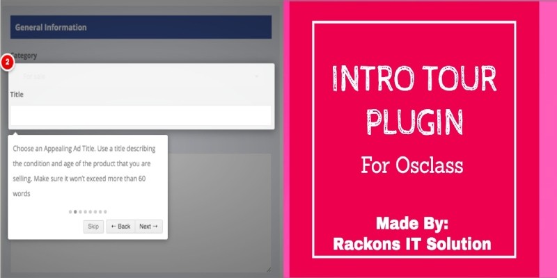 Intro Tour Plugin for Osclass. Intro Tour Plugin will guide sellers for Step-by-step introduction about post creative ads