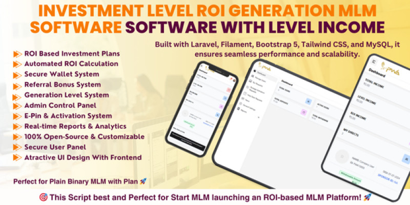 Investment MLM Software with 10-Level ROI. A fully automated Investment MLM System offering ROI Generation, 10-Level Income, Direct Sponsor Earnings, and Auto Withdrawals.
