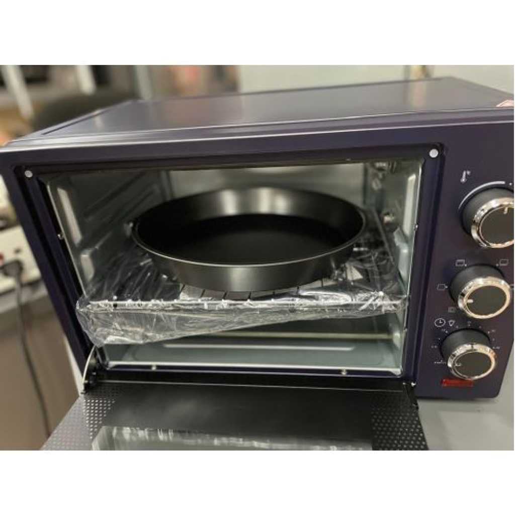 IQRA 19 Litre Premium Electric Oven IQ-EO22, 60 Minute Timer, Low Power Consumption Of 1280W, Comes With Oven Lamp, Has a Rotisserie, Baking Tray And Grill, Comes With Wire Rackrotisserie Handle And a Bakepan Handle IQRA PREMIUM ELECTRIC OVEN – IQ-EO22 comes with stylish Navy Blue color with premium quality knobs, it has pizza tray, baking pan, grill and rotisserie with handle. This premium quality electric oven gives you good baking experience to your loved once! 19 Litre premium electric oven 60 minute timer Low power consumption of 1280W Comes with oven lamp Has a rotisserie, baking tray and grill Comes with wire rackrotisserie handle and a bakepan handle