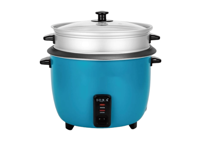 IQRA 2.8-liter Rice Cooker with Steamer IQRC28ST, 1,000 watts – Blue. 2.8 Litre Capacity Rice Cooker, Cook and Keep warm function, Steamer and Glass Lid with Teflon coating. Non-stick coating inner pot, Cool touch handles, Aluminium outer steamer, Accessory for measuring cup and spoon Cook all types of rice – including Arborio, jasmine, white, basmati, long grain and more. 1,000-watt power Outer finishing colour; blue Perfectly Fluffy/Sticky Rice, Every Time. 1-year warranty
