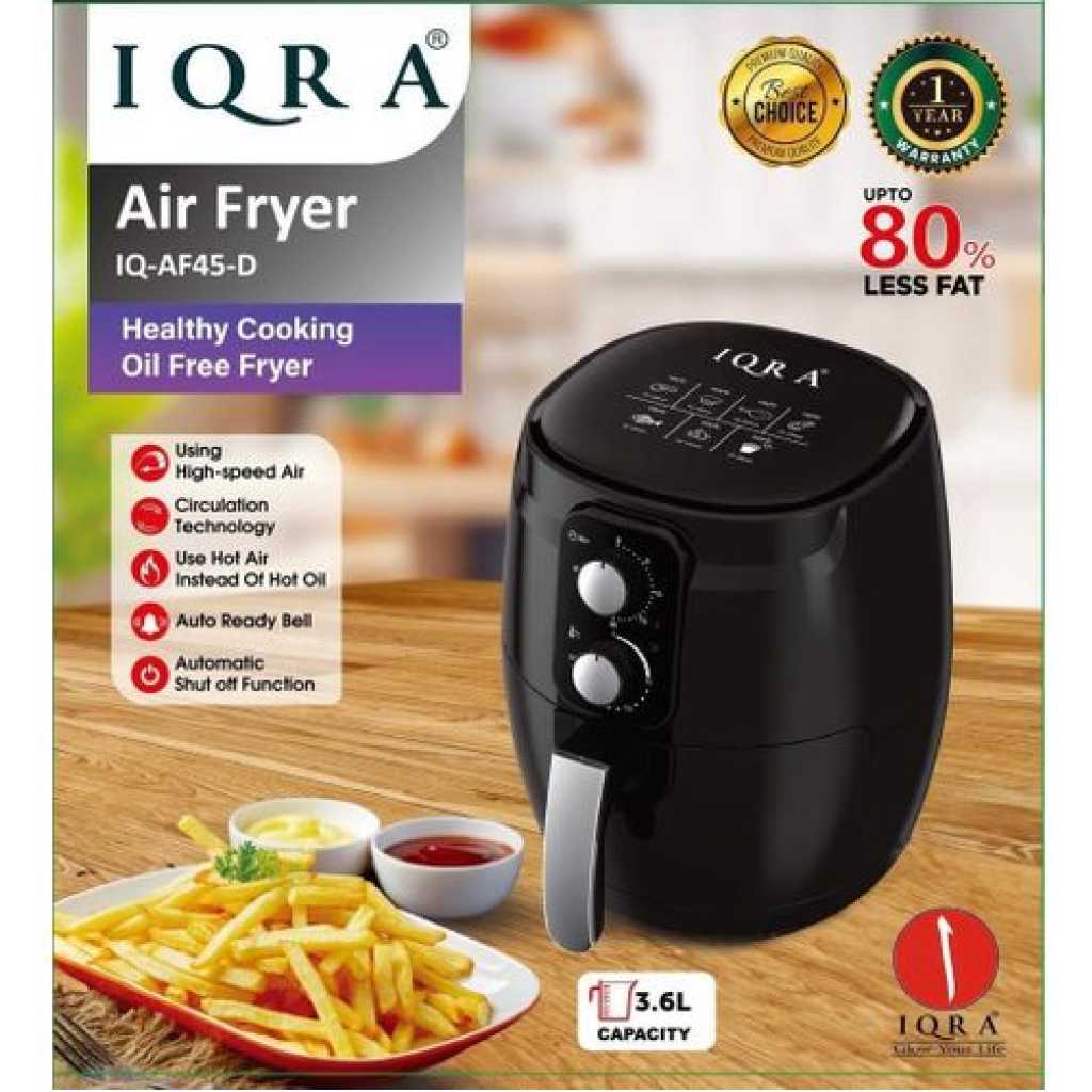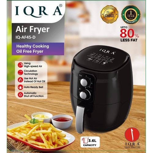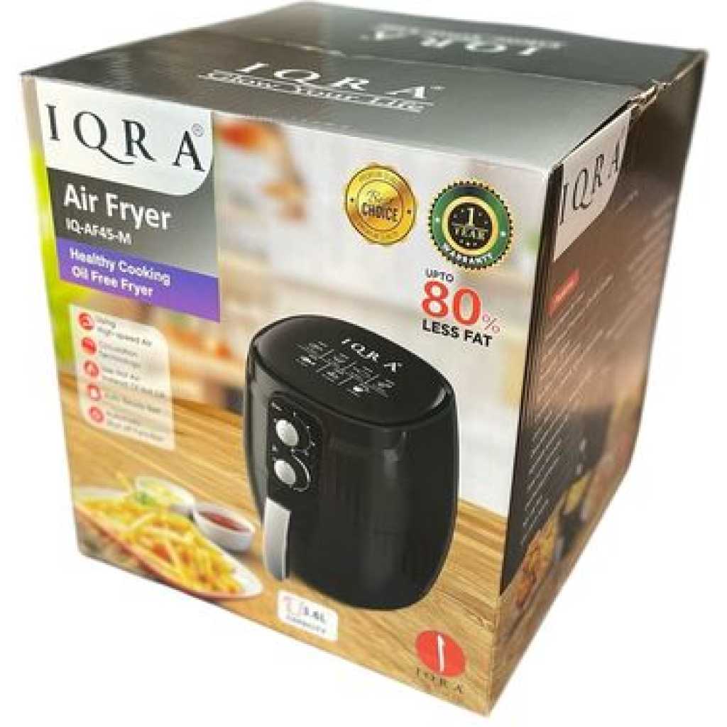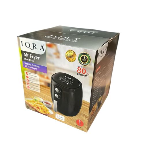 IQRA 3.6L Airfryer IQ-AF45M, Over Heating Protection, SS304 Heating Element, Temperature Upto 200C, Perfect Temperature Balance While Operating, 30 Minutes Timer Healthier cooking in 30 min or less: Thanks to rapid air technology, you can now experience your favorite food without the extra calories. This air fryer can fry, bake, grill and roast with little to no oil. Model: IQ-AF45M Colour: Black Net Capacity: 3.6LTR POWER : 1350W TEMPERATURE – UPTO 200C Timer: 30 MIN VOLTAGE : 220 – 240V OVERHEATING PROTECTION, SS304 HEATING ELEMENT Key Features: IQRA 3.6L Airfryer IQ-AF45M, Over Heating Protection, SS304 Heating Element, Temperature Upto 200C, Perfect Temperature Balance While Operating, 30 Minutes Timer Over heating protection SS304 Heating element Temperature upto 200C Perfect temperature balance while operating 30 Minutes timer 3.6 Litre