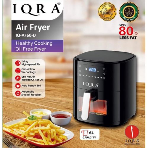 IQRA 6L Airfryer IQ-AF60D , Over Heating Protection, SS304 Heating Element, Temperature Upto 200C, Perfect Temperature Balance While Operating, 30 Minutes Timer Healthier cooking in 30 min or less: Thanks to rapid air technology, you can now experience your favorite food without the extra calories. This air fryer can fry, bake, grill and roast with little to no oil. Model: IQ-AF45M Colour: Black Net Capacity: 3.6LTR POWER : 1350W TEMPERATURE – UPTO 200C Timer: 30 MIN VOLTAGE : 220 – 240V OVERHEATING PROTECTION, SS304 HEATING ELEMENT Key Features: IQRA 6L Airfryer IQ-AF60D , Over Heating Protection, SS304 Heating Element, Temperature Upto 200C, Perfect Temperature Balance While Operating, 30 Minutes Timer Over heating protection Digital display with touch screen SS304 Heating element Temperature upto 200C Perfect temperature balance while operating 30 Minutes timer 6 Litre