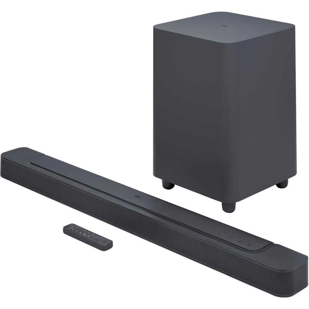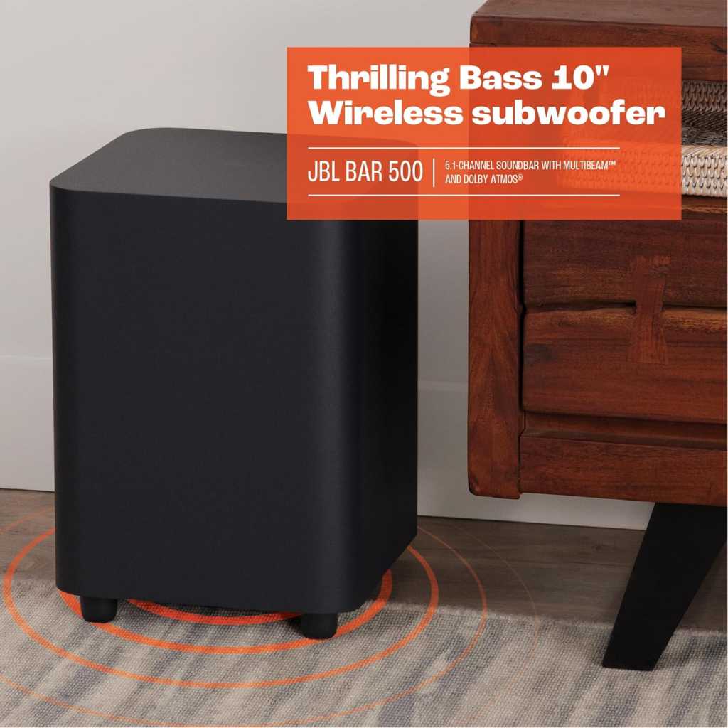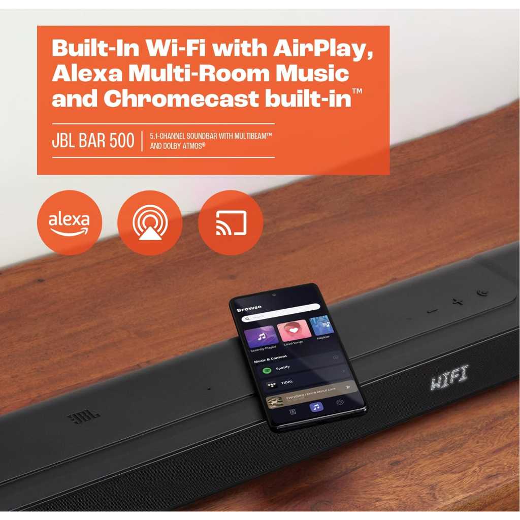 From the manufacturer Amazing 3D Sound with Thrilling Bass JBL BAR 500 The JBL Bar 500 brings your movies to life with MultiBeam and Dolby Atmos 3D surround sound. PureVoice technology optimizes voice clarity so you never miss a word. Feel the bass from the wireless 10″ subwoofer. And with AirPlay, Alexa Multi-Room Music (MRM) and Chromecast built-in, you’ve got 300+ streaming options. Key Features: Dolby Atmos and MultiBeam Surround Sound: Immerse yourself in theater-quality 3D surround sound. Hear extraordinary sound effects from everywhere in the room, without the need for extra surround speakers. Built-In Wi-Fi with AirPlay, Alexa Multi-Room Music and Chromecast built-in: Get ready to explore. Access over 300 online music streaming services through AirPlay, Alexa MRM and Chromecast built-in. Enjoy all of your favorite audio content, Internet radio, and podcasts in high definition. The Wi-Fi connection also allows automatic software updates, so you can always enjoy the latest features. With 590 watts of total system output power, the JBL Bar 500 transforms your movies, music and games into immersive sound experiences. 10″ Wireless subwoofer: Thrilling, precise bass from a mighty 10″ wireless subwoofer brings the action to your movies and the emotion to your music. PureVoice Dialogue Enhancement Technology: PureVoice technology uses our unique algorithm to optimize voice clarity to ensure you never miss a word of dialogue, even when the surround effects are at their peak.