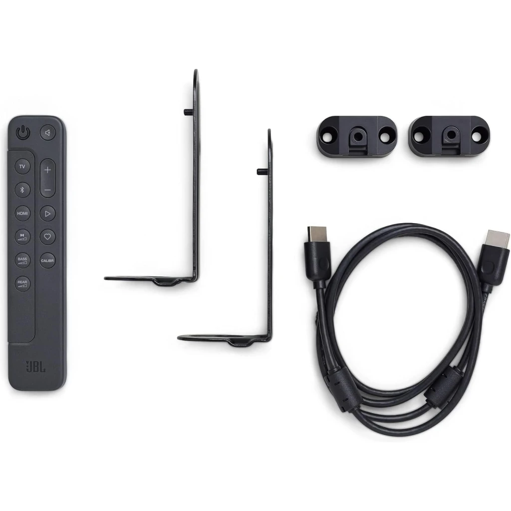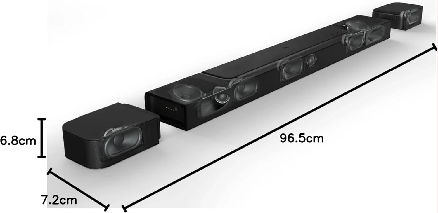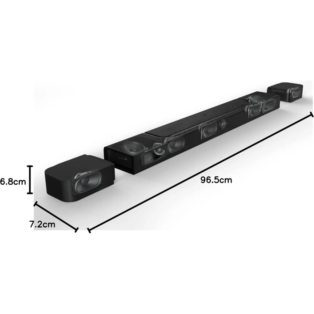 Features Key Features: Lose yourself in movie night: Experience cinematic sound with JBL’s Bar 800, delivering Dolby Atmos 3D surround sound through detachable stereo speakers which are battery-powered to avoid annoying wires Let your music soar: Whether you’re watching a film or listening to your favourite tunes, the 10″ wireless subwoofer produces mind-shattering bass, bringing you a uniquely immersive experience Never miss a word: PureVoice Enhancement ensures pristine voice clarity so you capture every second of your series, while sound calibration delivers the optimum 3D surround effects for your room layout Stream your favourites: Access to over 300 online music streaming services through AirPlay, Alexa MRM and Chromecast while Wi-Fi connectivity allows automatic software updates Items delivered: 1x Bar 800 soundbar, 2x surround speakers, 1x wireless subwoofer, remote control + batteries, power cords, 1 x HDMI cable, wall-mounting kit, start guide, safety instructions