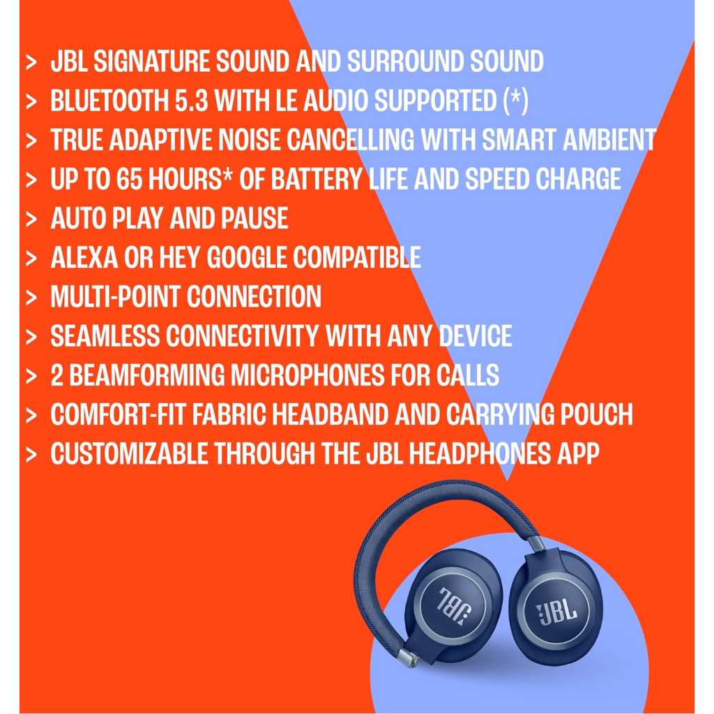 Key Features: JBL Signature Sound and surround sound Bluetooth 5.3 with LE audio supported True adaptive noise cancelling with smart ambient Up to 65 hours of battery life and speed charge Auto play and pause