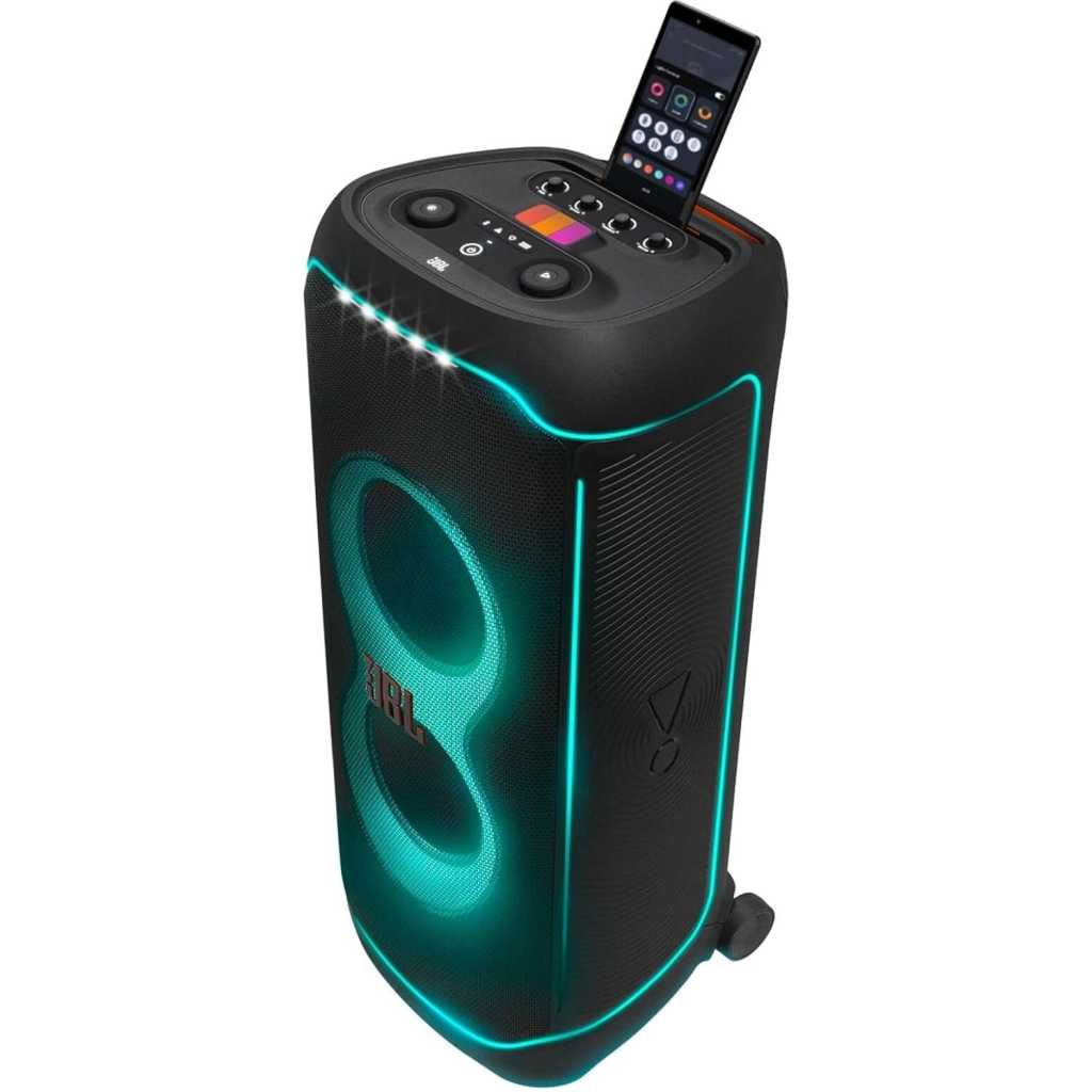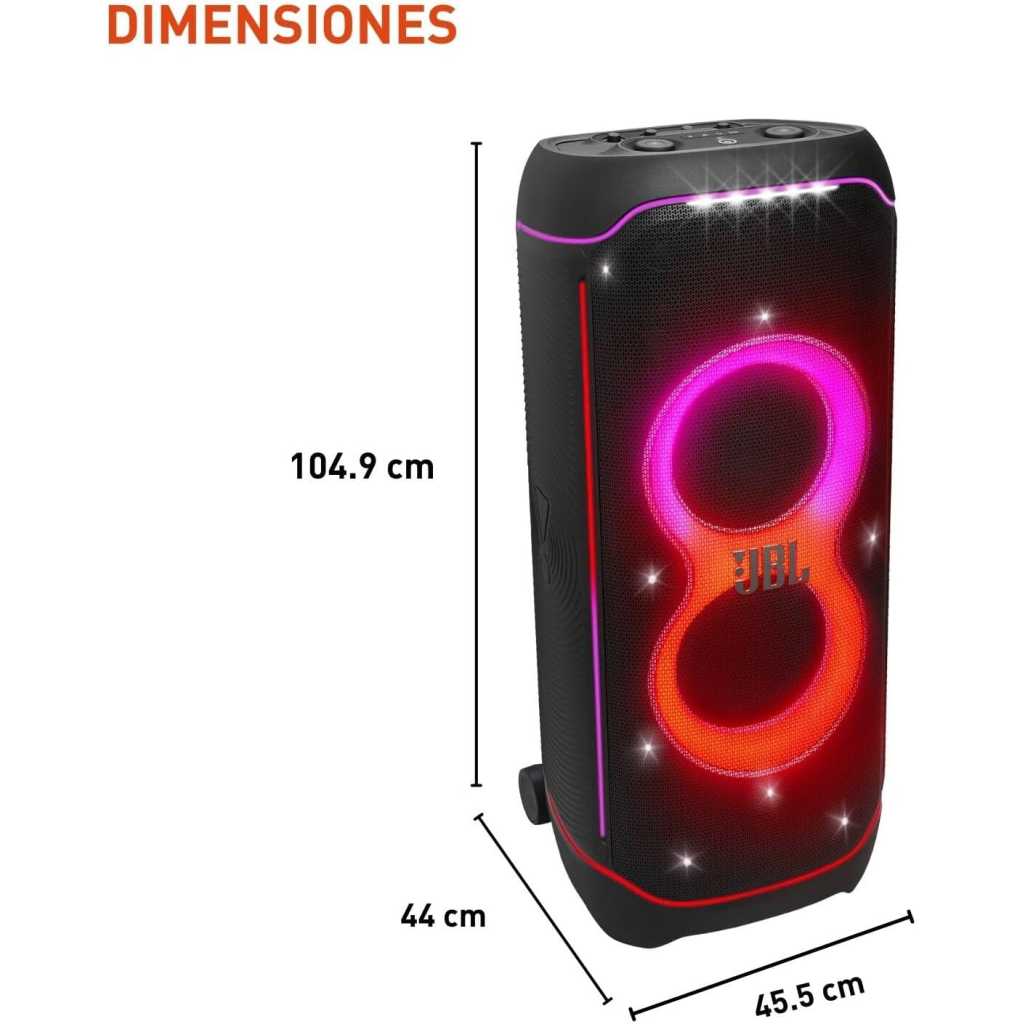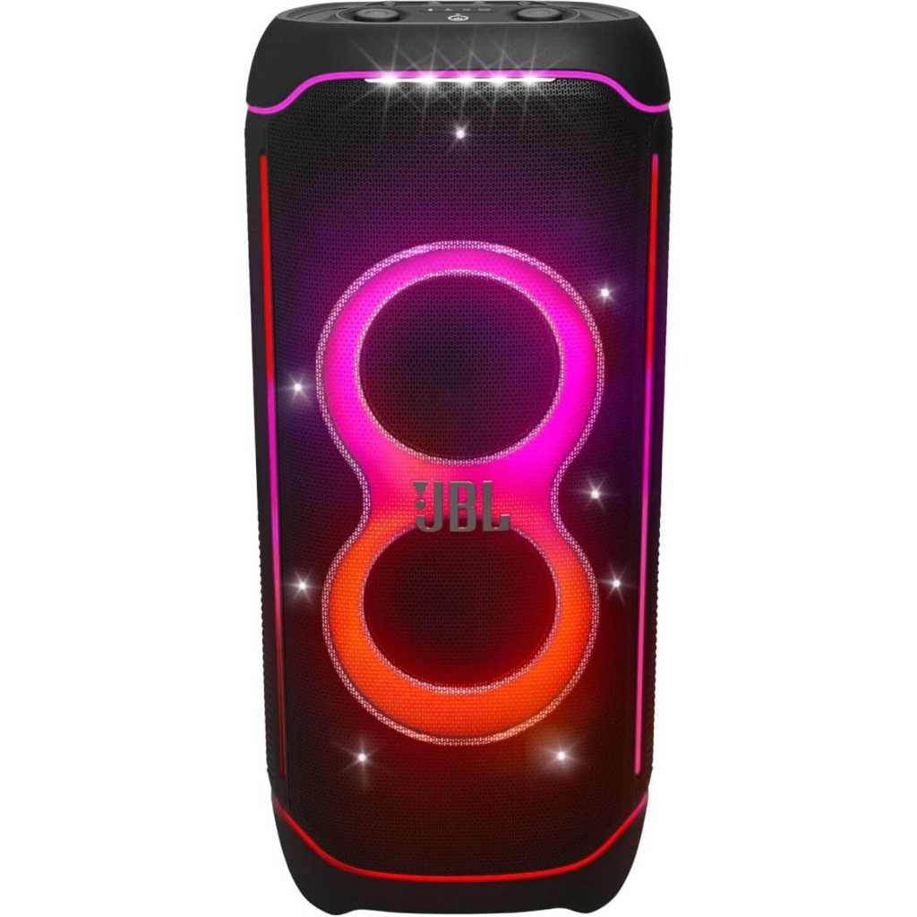 Key Features: All the superior Original JBL Pro Sound you can handle The JBL PartyBox Ultimate can cover a massive space—we’re talking two basketball courts—with superior Original JBL Pro Sound. Featuring two drivers and mid range speaker to deliver louder sound. Dual tweeters and a pair of subwoofers means there’s going to be more than enough bass for even the most dedicated fans, while Dolby Atmos* provides immersive 3D spatial effects. This is the kind of thunderous sound you’ll not just hear, but feel. * A subscription to a high definition music service is required in order to listen to immersive music in Dolby Atmos. Please check subscription fees in your region. A multi-dimensional, dynamic lightshow Lights, color, party! Transform your space into a captivating,full sensory experience with the biggest multi-dimensional lightshow of any party speaker. It’s got a unique starry night effect, cool light trails, strobes, and even lights that project onto any surface it’s sitting on. All of it syncs to your music and can be easily controlled via the streamlined, user-friendly dials on the top panel or through the JBL One app. Wi-Fi and Bluetooth connectivity Stream high definition music anywhere with the JBL PartyBox Ultimate, including 3D Dolby Atmos over Wi-Fi. Taking a call or scrolling your feed? Go ahead—it won’t interrupt your music. Switch easily to Bluetooth and keep enjoying seamless audio experiences whether you’re indoors or outside. Handle and sturdy wheels Get the party rolling with wide, sturdy wheels and an easy-to-grip handle that makes this big speaker surprisingly easy to transport. A simple but effective cable management setup makes sure the cords never get in your way. *AC input required IPx4 Splashproof Whether you are partying with friends in your backyard or sipping drinks by the pool, the JBL PartyBox Ultimate is IPX4 splashproof so you never have to worry about the party getting too wet and wild.