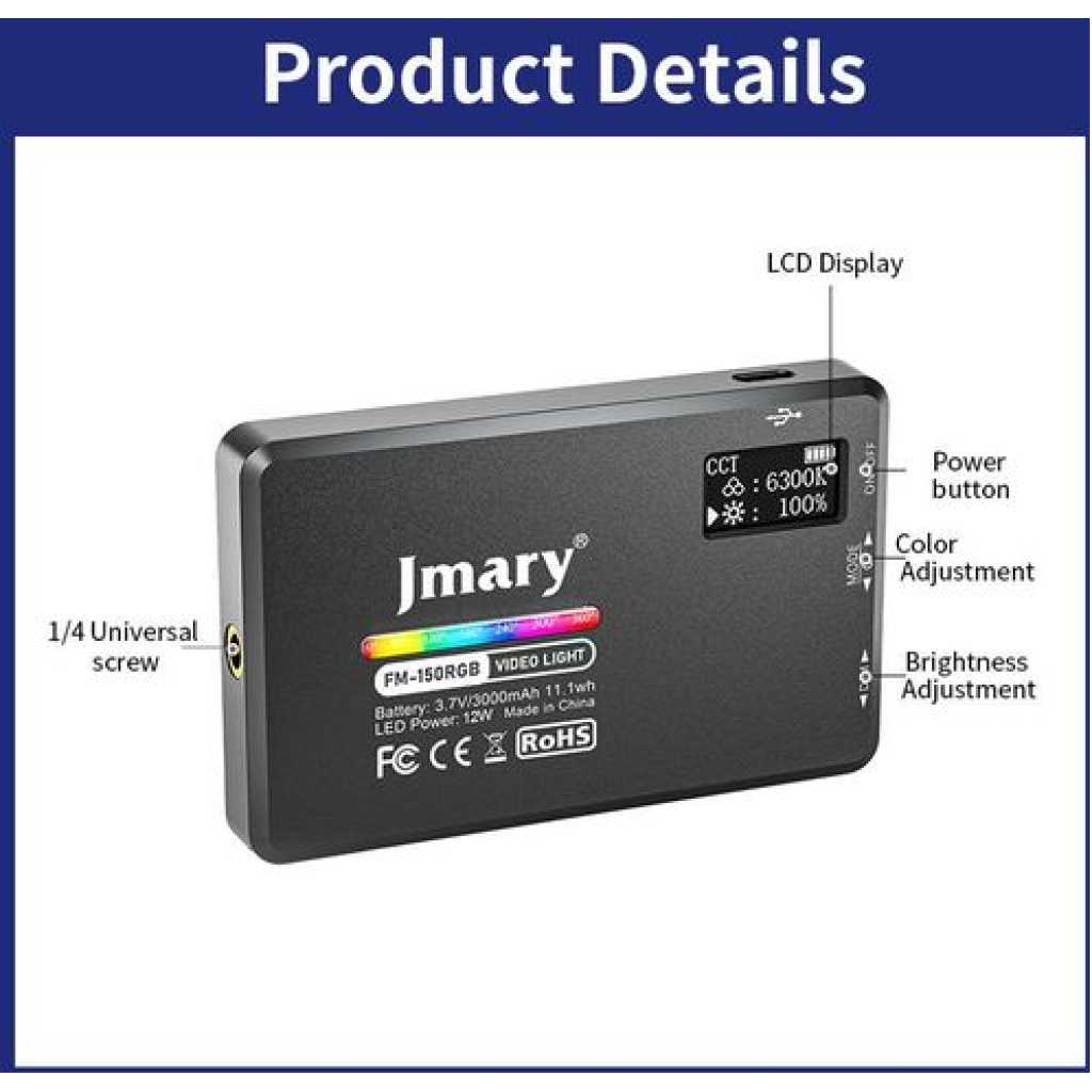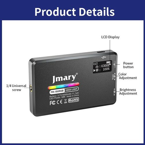 RGB Color Options The FM 150RGB comes equipped with full RGB color control, allowing users to choose from millions of colors to set the perfect mood or tone for their content. This flexibility is ideal for creative lighting effects, whether you want vibrant color splashes or soft pastel hues for a more cinematic look. Key Features: Cage Size:25.5*13*5.2cm Tripod Length:14cm Holder Range:4.2-9.5cm 1/4 Screw interface:5pcs Cold shoe interface:3pcs Wight:0.4kg