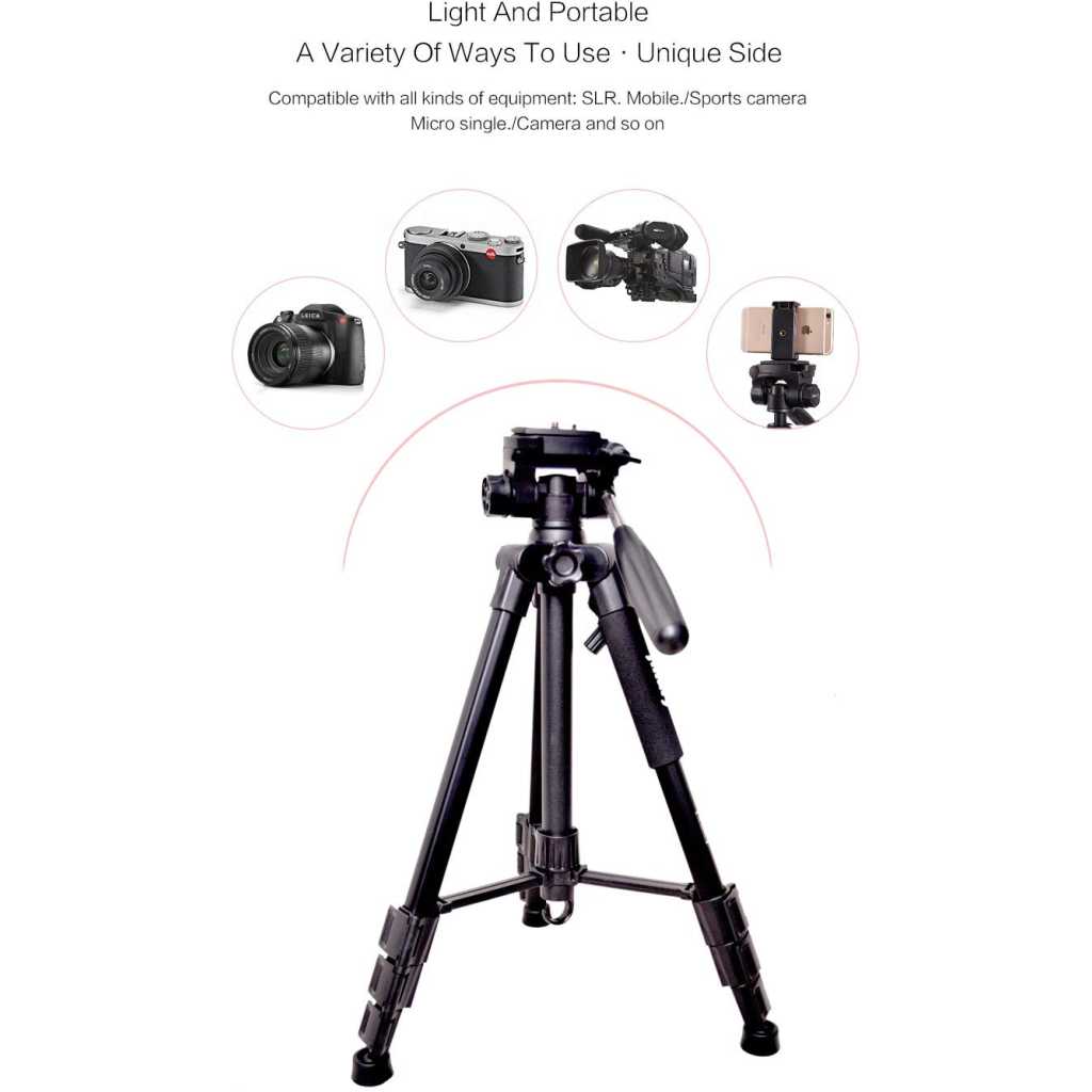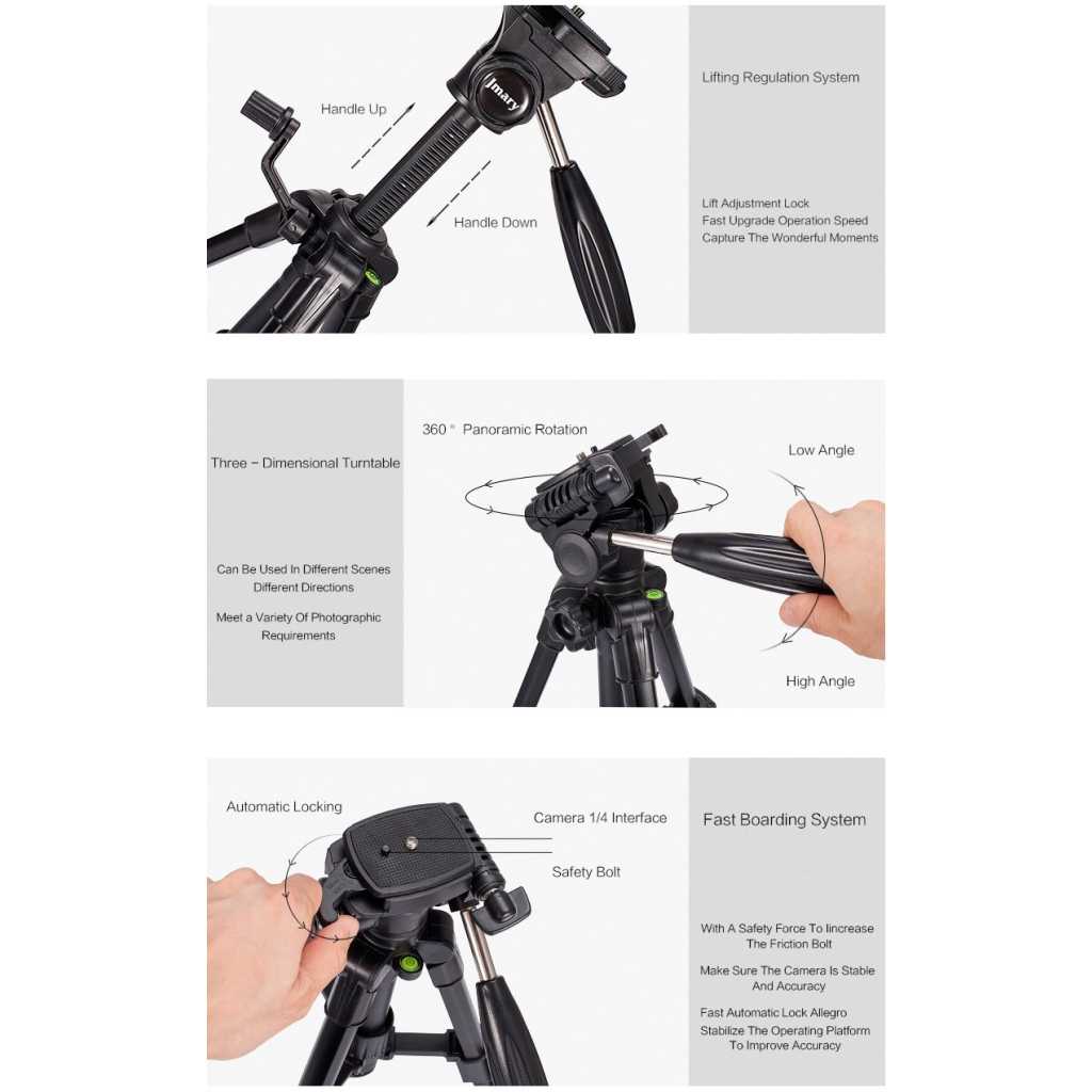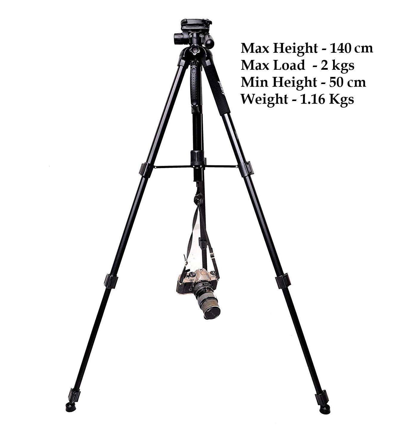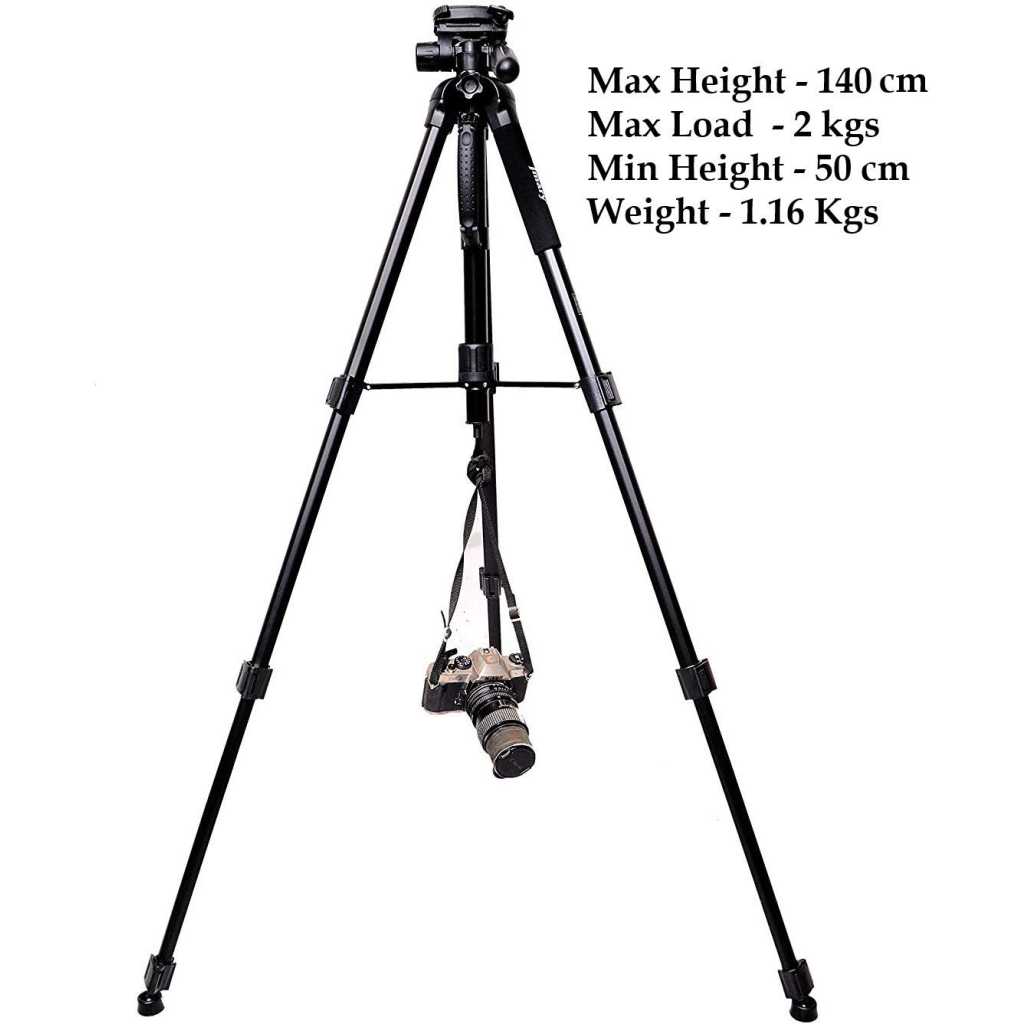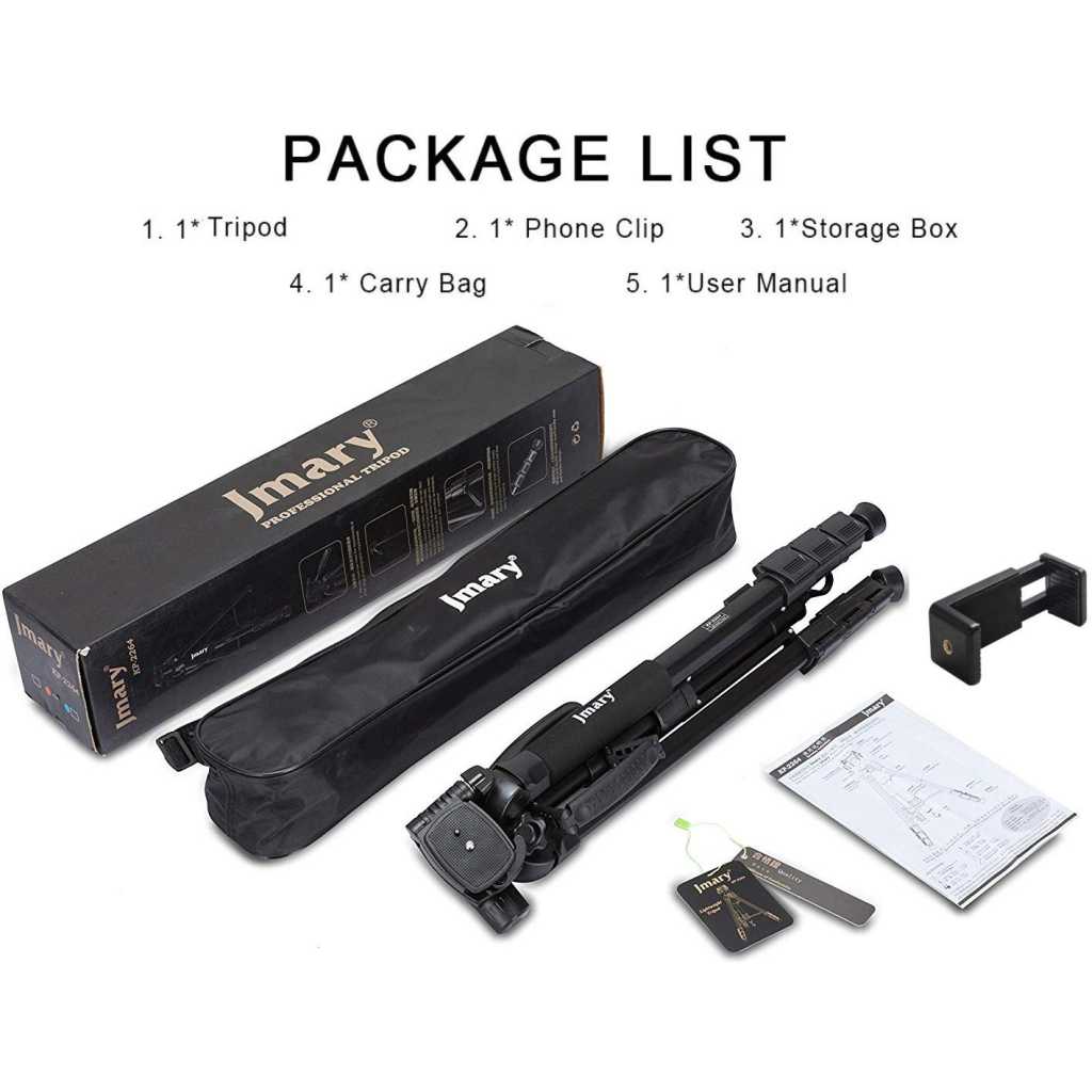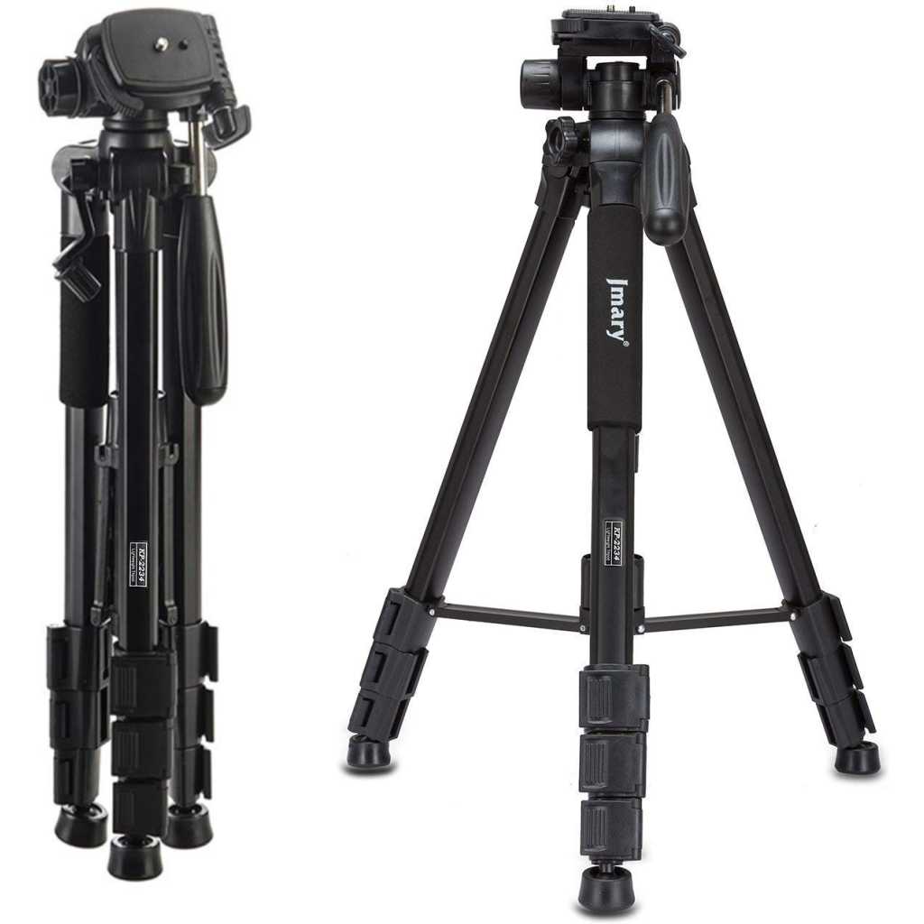 Key Features: ★Jmary 2234 with Max – Load Capacity – 2kg, Max Height – 1400mm/4.6ft Professional Tripod has multiple-section aluminum channel legs ★ This is a professional-level bubble and quick-release plate ★The tripod is very portable and it comes with a carry bag and mobile holder ★ Lightweight and portable with convenient to carry; Minimum Height: 50cm/1.6ft; Weight – 1.16 kgs ★ Quick power lock with high-locking power guarantees maximum camera stability. Rubber feet help increase stability on a variety of surfaces