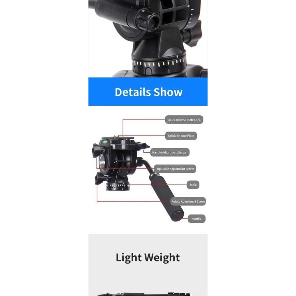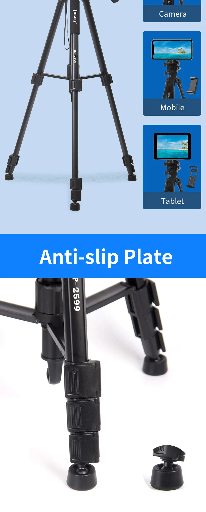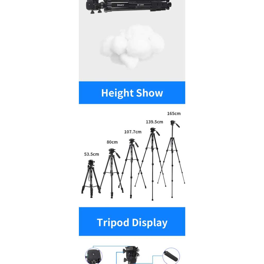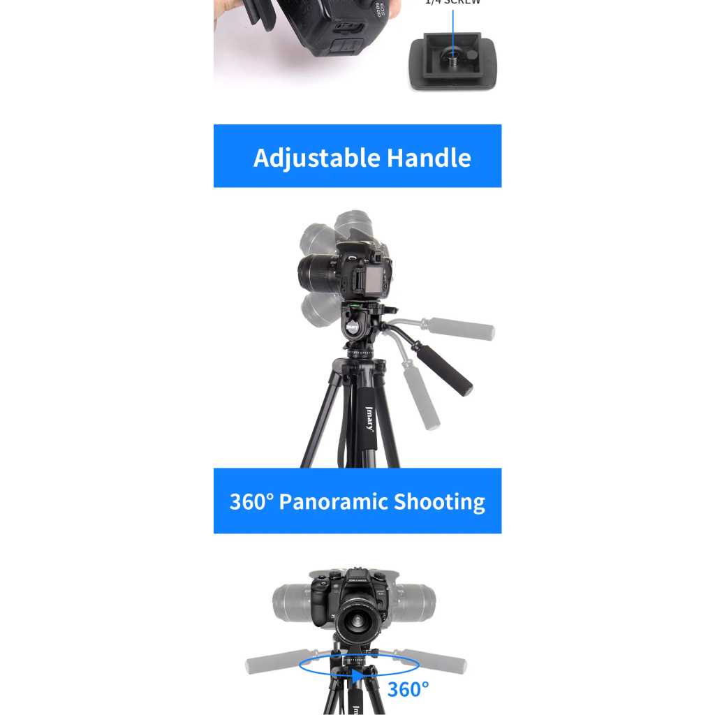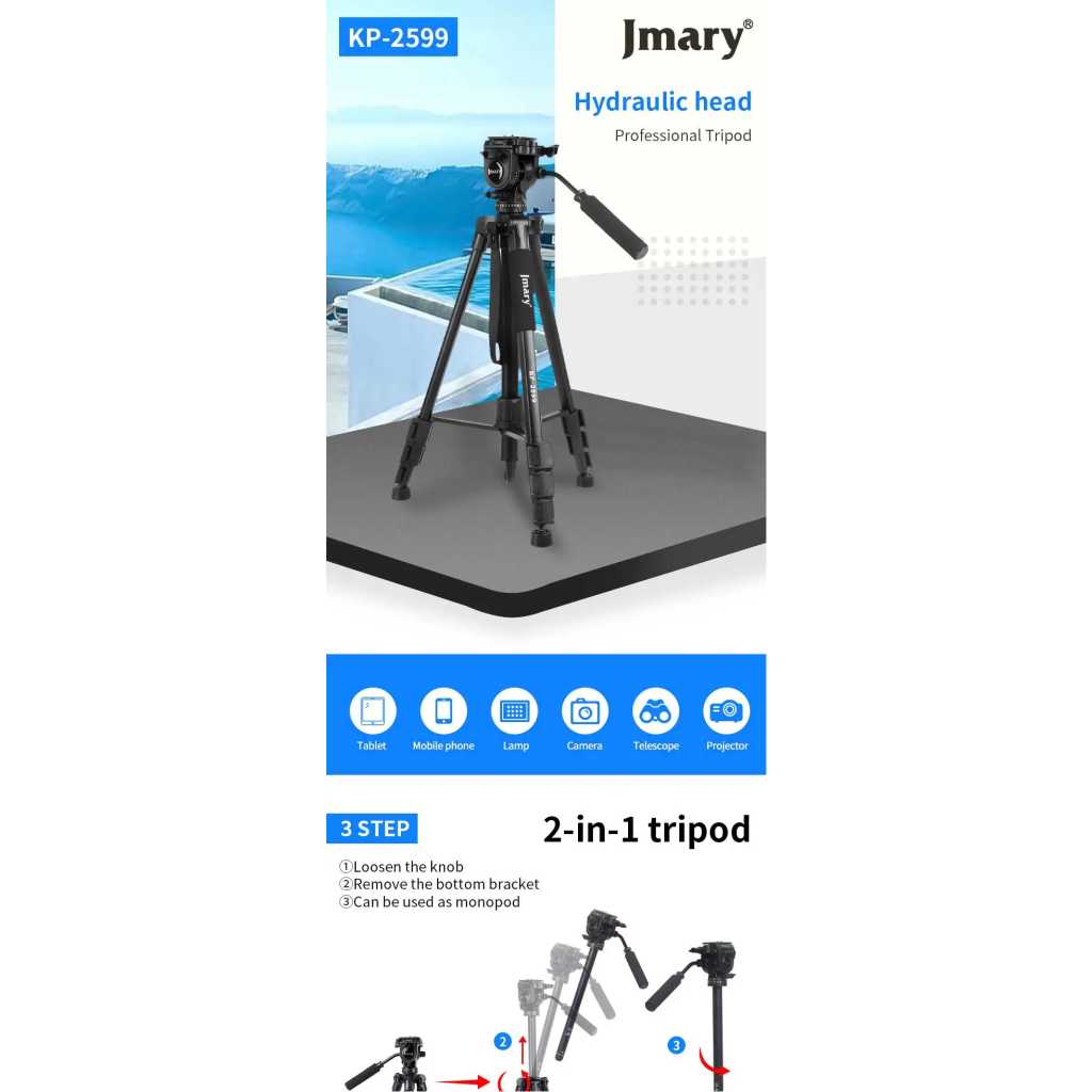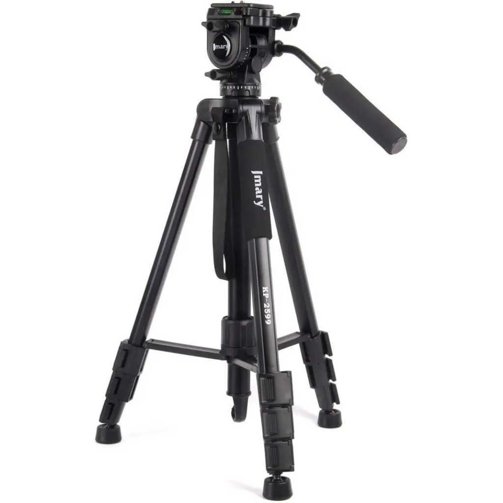 Key Features: Sturdy Construction: The Jmary kp-2599 tripod is built with high-quality materials to provide stability and durability. It can securely hold your camera equipment, preventing any wobbling or shaking during use Quick Release Plate: With a quick-release plate system, you can effortlessly attach and detach your camera from the tripod. This feature saves you time and ensures a secure connection between your camera and the tripod Pan and Tilt Head: The Jmary kp-2599 tripod is equipped with a smooth pan and tilt head, enabling you to capture fluid and precise movements. It offers 360-degree horizontal rotation and a tilt range of -90 to +90 degrees Compact and Portable: This tripod is designed to be lightweight and compact, making it convenient to carry and transport. It folds down to a manageable size, allowing you to easily fit it into your camera bag or backpack Bubble Level: The built-in bubble level helps you ensure that your camera is perfectly level, preventing any tilted or crooked shots. It helps maintain the composition and balance of your images or videos Non-Slip Feet: The tripod’s rubberized feet provide excellent grip and stability on various surfaces. They minimize slipping and sliding, ensuring a steady platform for your camera even on uneven terrain Versatile Mounting Options: The Jmary kp-2599 tripod comes with a universal 1/4-inch screw, compatible with a wide range of cameras, camcorders, DSLRs, and other photography equipment Multiple Shooting Modes: Whether you’re interested in capturing time-lapse videos, panoramic shots, or long-exposure images, the Jmary kp-2599 tripod offers versatility and stability for a variety of shooting modes