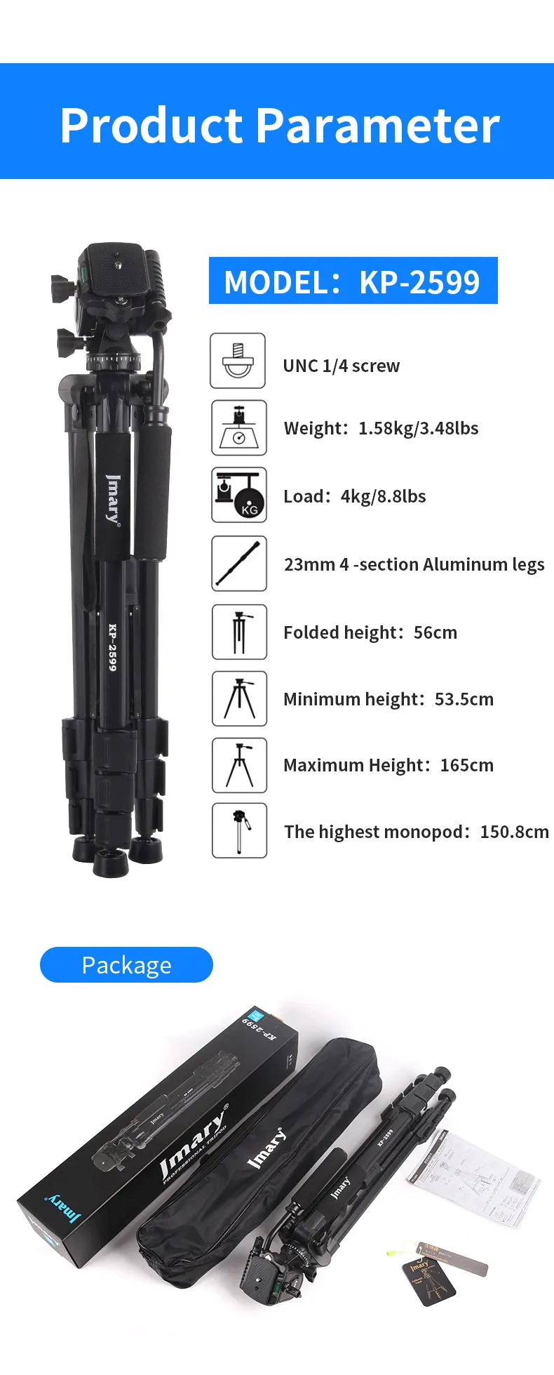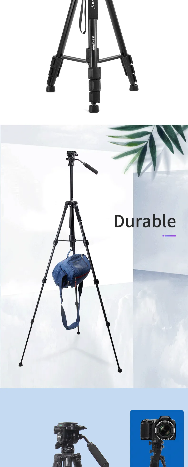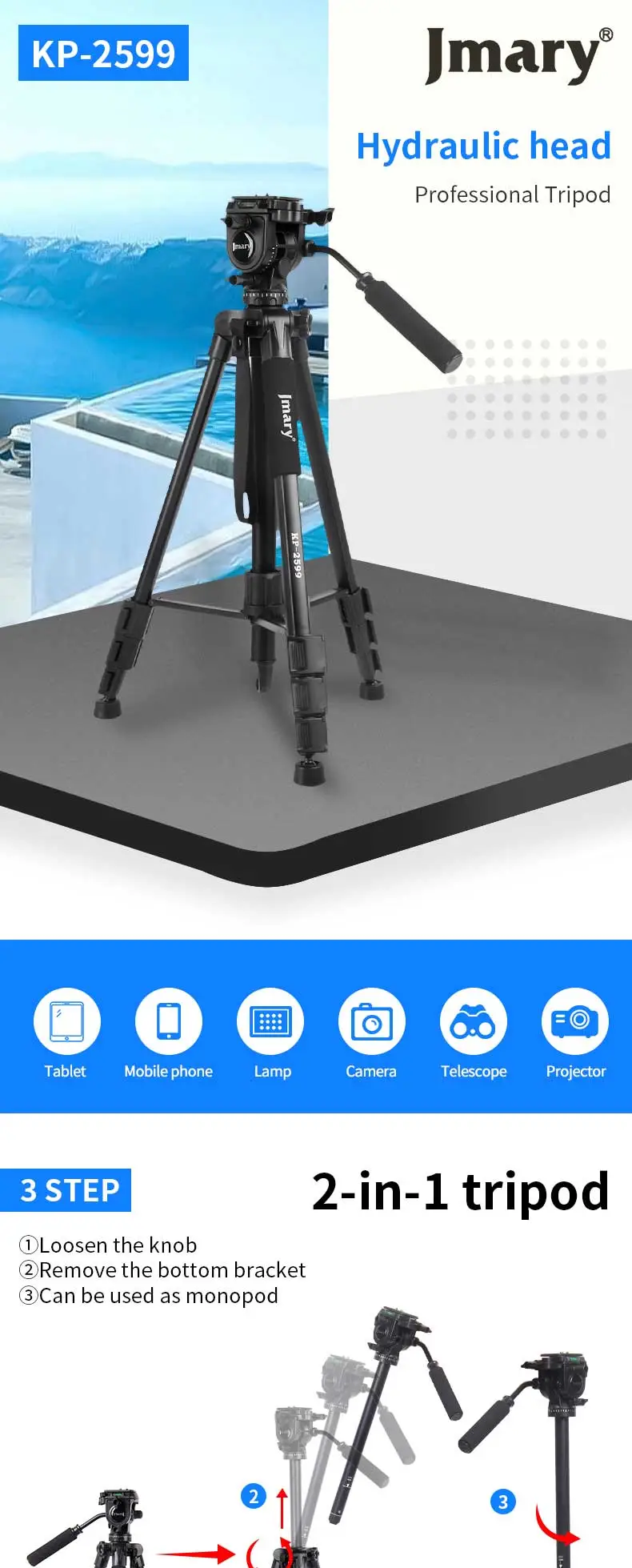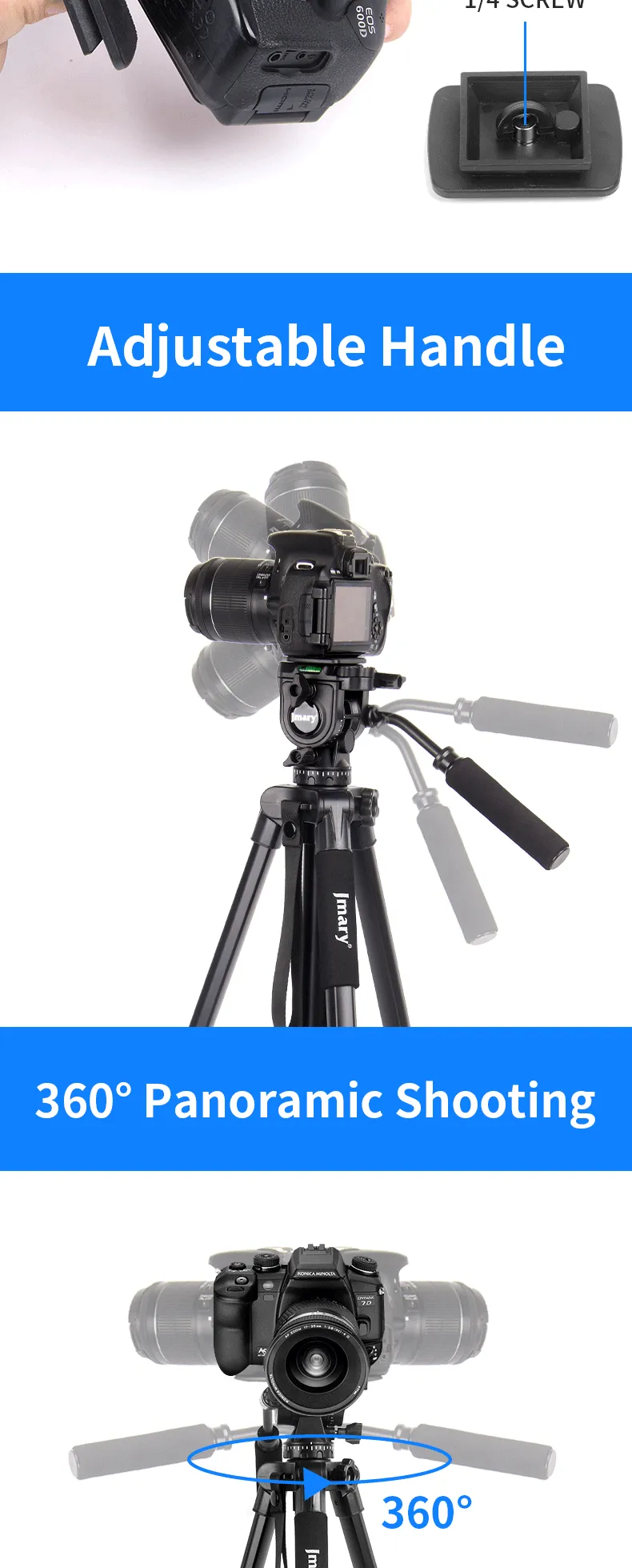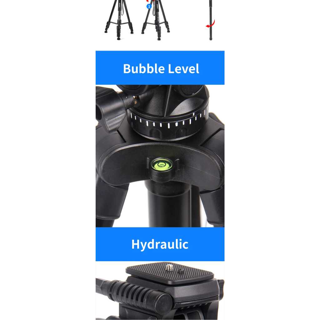 Key Features: Sturdy Construction: The Jmary kp-2599 tripod is built with high-quality materials to provide stability and durability. It can securely hold your camera equipment, preventing any wobbling or shaking during use Quick Release Plate: With a quick-release plate system, you can effortlessly attach and detach your camera from the tripod. This feature saves you time and ensures a secure connection between your camera and the tripod Pan and Tilt Head: The Jmary kp-2599 tripod is equipped with a smooth pan and tilt head, enabling you to capture fluid and precise movements. It offers 360-degree horizontal rotation and a tilt range of -90 to +90 degrees Compact and Portable: This tripod is designed to be lightweight and compact, making it convenient to carry and transport. It folds down to a manageable size, allowing you to easily fit it into your camera bag or backpack Bubble Level: The built-in bubble level helps you ensure that your camera is perfectly level, preventing any tilted or crooked shots. It helps maintain the composition and balance of your images or videos Non-Slip Feet: The tripod’s rubberized feet provide excellent grip and stability on various surfaces. They minimize slipping and sliding, ensuring a steady platform for your camera even on uneven terrain Versatile Mounting Options: The Jmary kp-2599 tripod comes with a universal 1/4-inch screw, compatible with a wide range of cameras, camcorders, DSLRs, and other photography equipment Multiple Shooting Modes: Whether you’re interested in capturing time-lapse videos, panoramic shots, or long-exposure images, the Jmary kp-2599 tripod offers versatility and stability for a variety of shooting modes
