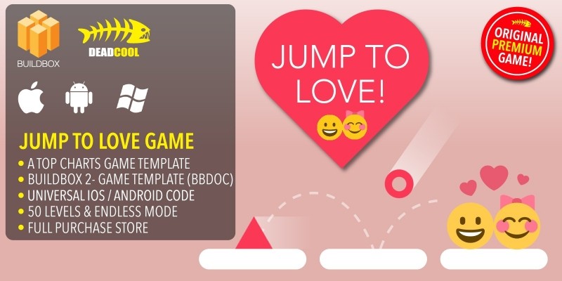 Jump To Love - BuildBox Game Template. Fast reflexes and a sharp eye are the only things keeping you alive! Simply tap to jump and help Emoji get to his Girl!