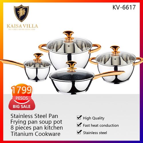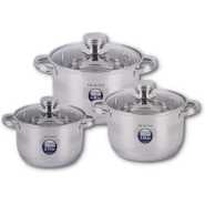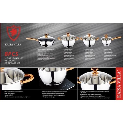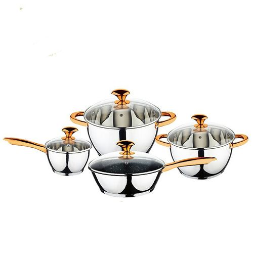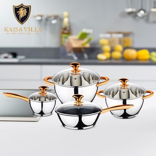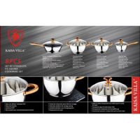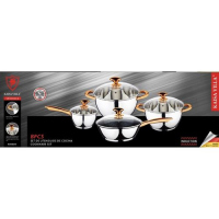 Key Features: Color : Silver Material: stainless steel. Cover material: heat resistant glass. Number of items in a set: 12 Bottom type: 5-layer. Measurement scale: yes. Handles fastening method: riveted connection. Handle type: hollow. Lid with a steam outlet: yes. Metal polishing: mirror / satin. Dishwasher safe: yes. K-gold plate knob and handle