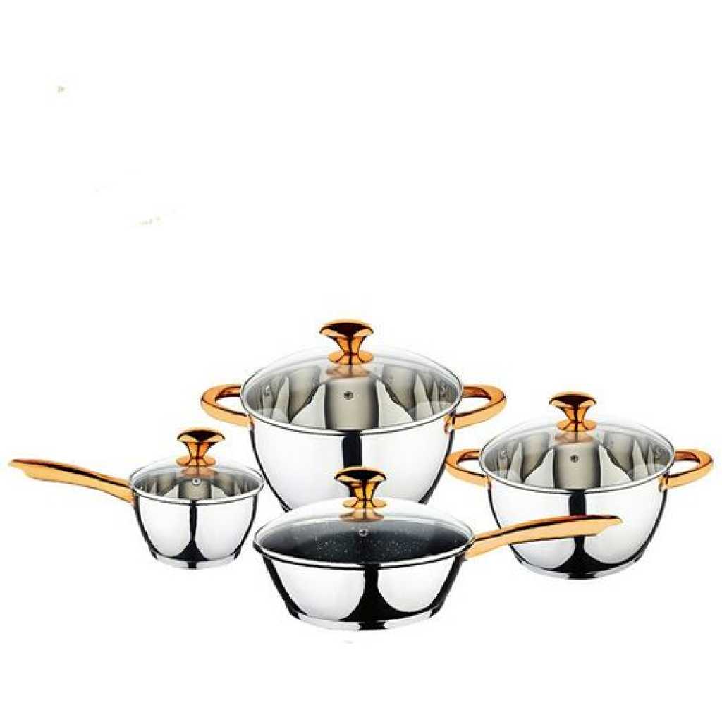 This stainless cookware set is built to last a lifetime. Elegant design, easy to use, nice to stack, excellent range of sizes. You can put them in oven with the lid on. This is the cookware set you will ever need. LFGB & FDA listed for your health, environmental-friendly & PFOA-free Teflon generates zero chemicals, defending health for you and your loved ones ERGONOMIC CURVED HANDLE: revolutionary handles are designed to keep you from fatigue even after long sessions of cooking STUNNING 12 PIECES SET: come in an elegant color, fits well into any decor, the durable, soft, comfortable and colorfast coating on handles and lid finials provide superior heat-resistant performance for your safety during cooking BREAK-RESISTANT LID & MULTI-LAYER BOTTOM: clear glass lid for easy observation during cooking; multi-layer bottoms distribute heat evenly and are compatible with types of cooking range including induction cooker, gas range What’s on the box? saucepan with lid16 X 9.5cm1.9L*Casserole with lid16 X 9.5cm1.9L18 X 10.5cm2.5L20 X 11.5cm3.4L24 X 13.5cm5.8L*Frypan with lid & Marble Coating24 X 6.5cm