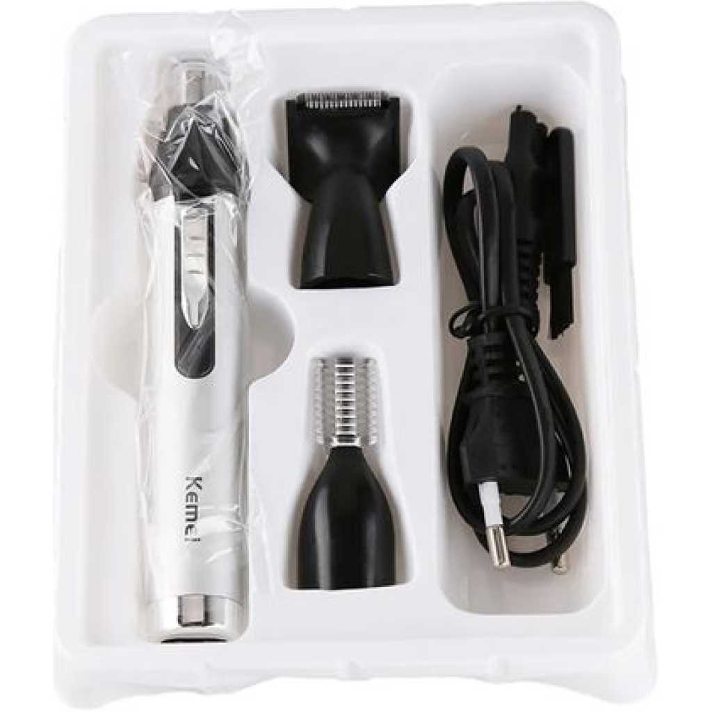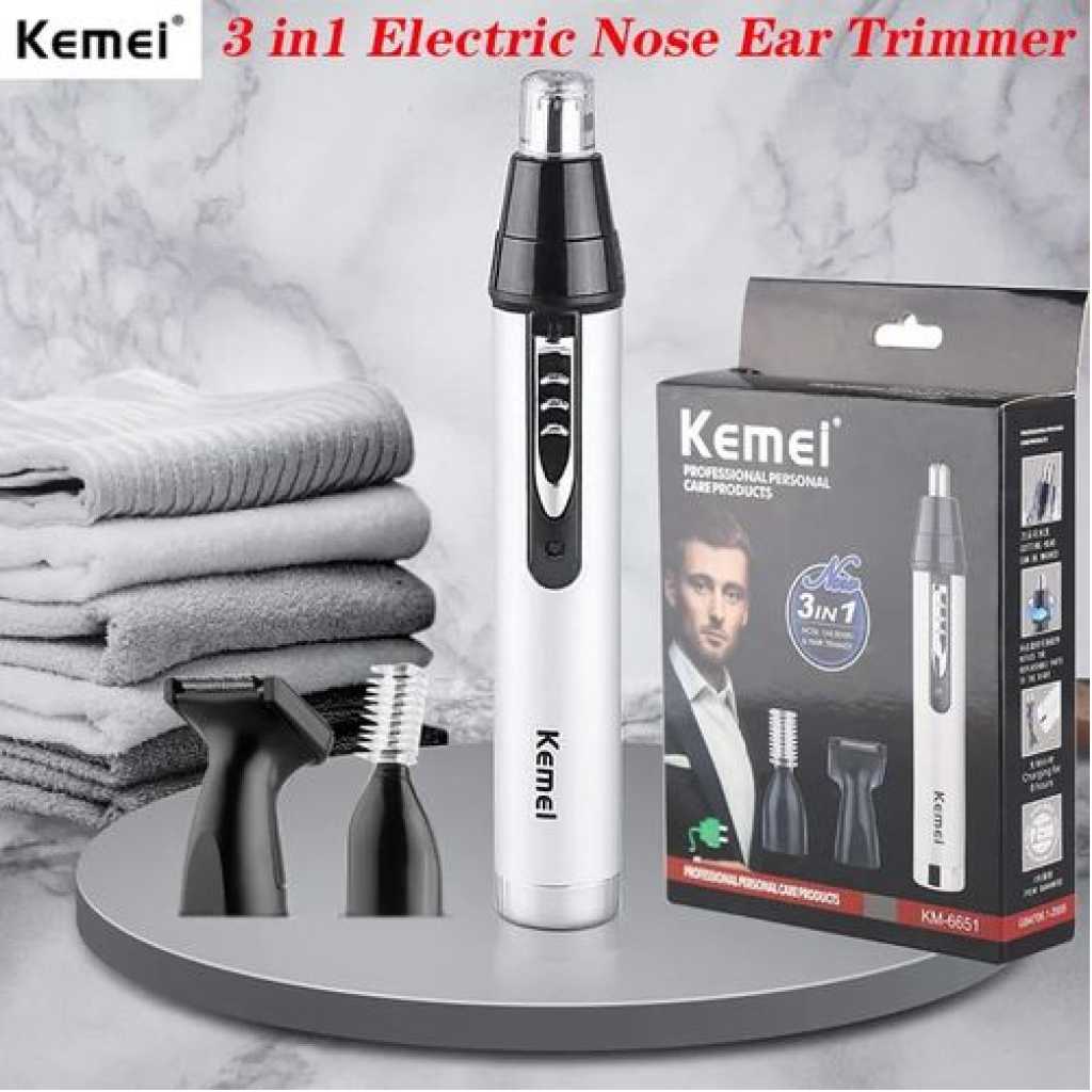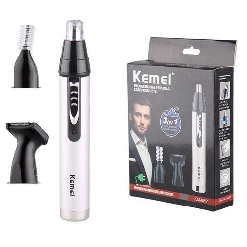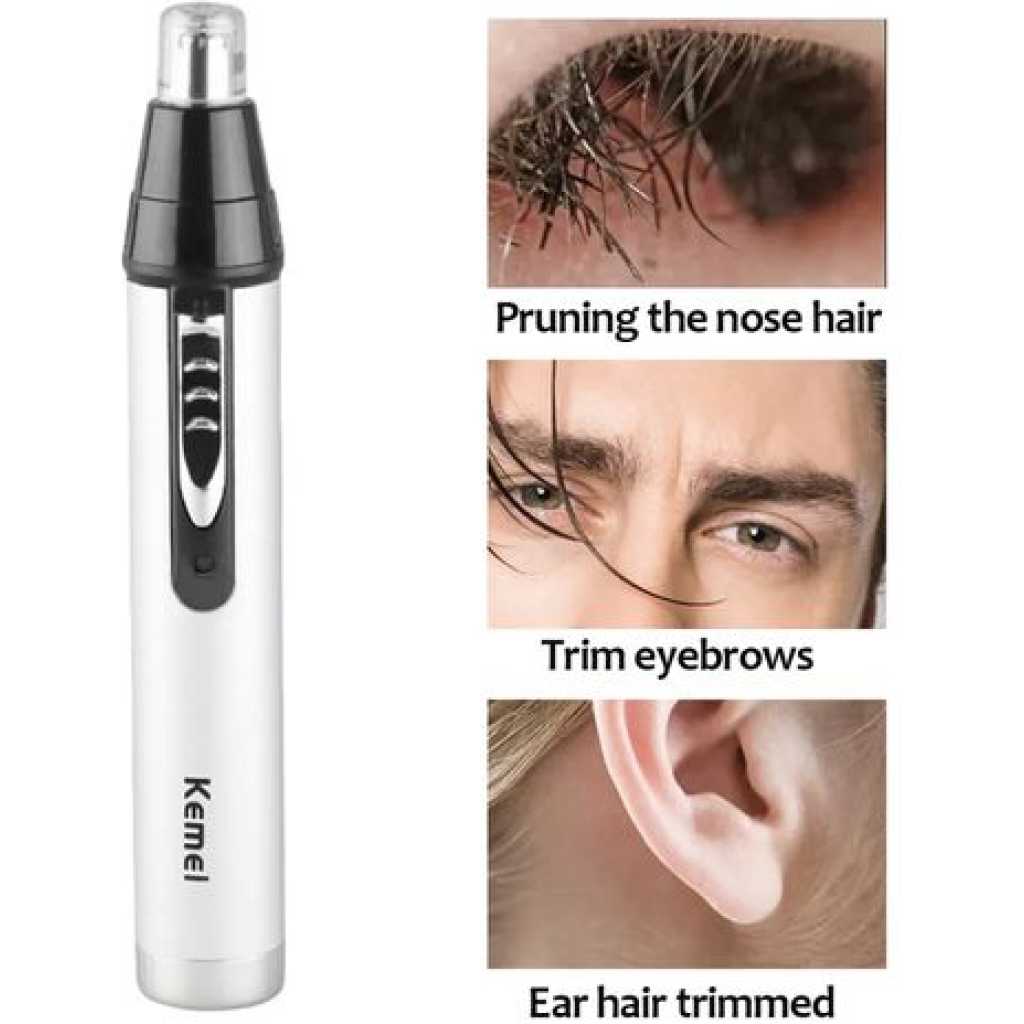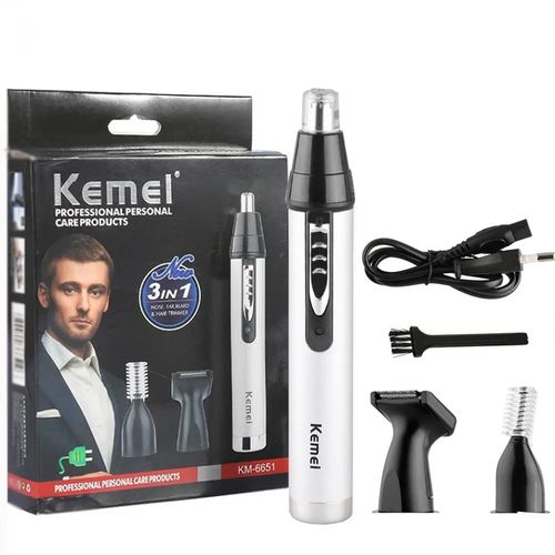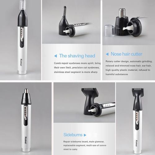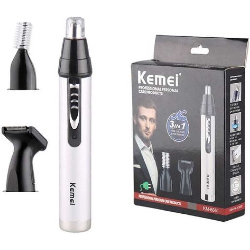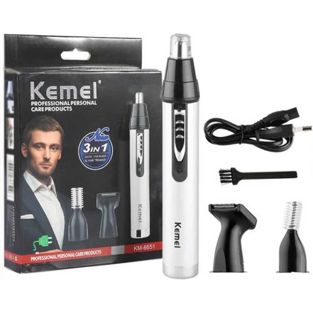 Kemei 3 In1 Electric Nose Ear Trimmer For Men Rechargeable Shaver Hair Removal Eyebrow Trimer Face Shaving Machine Men’s Shaving Machine- Silver. ELECTRIC PROFESSIONAL HAIR – Self-sharpening stainless steel is designed for smooth, quick, and precise clipping performance on all types of hair. They are engineered for long-lasting and premium cutting performance LITHIUM BATTERY AND USB FAST- – Long-lasting powerful rechargeable lithium battery, up to about 150 minutes run time by only about 1 hour charging.LED light indicates the battery level. 2000mAh is enough to provide a perfect fit cut or taper ADJUSTABLE TAPER LEVER – The thumb taper lever on the left side enables easy haircut length adjusting From 0.5mm to 1mm. You can easily adjust the comb to the right height and cut out the hairstyle you want ACCESSORIES INCLUDED – For your convenience, the BOLUONI comes with 6 guide combs(1.5/3/4.5/6/10/13mm), also including blade guard, cleaning brush, USB charging cable, instruction LED DISPLAY AND ERGONOMIC HANDLE – The LED display of this clearly shows the remaining percentage of the battery. This professional hair for men is very comfortable to hold, easy to use, and even for first-time users Key Features: Kemei 3 In1 Electric Nose Ear Trimmer For Men Rechargeable Shaver Hair Removal Eyebrow Trimer Face Shaving Machine Men’s Shaving Machine- Silver. Stainless steel material nylon color design Size 17cmx5cm Voltage and rate 220v ~50hz motor Type: 100% copper wire motor Length of cable standard 2m (Customized For Optional) Switch 1 voltage adjustment button 1 hanging hook equipped use salon, household lubricant/adjustment key/brush High-cutting performance. Quiet operation Cutting speed can be regulated. High-quality carbon steel blade Convenient adjustable control lever Durable: can be used for a long time. Slim and safe design, convenient to operate.
