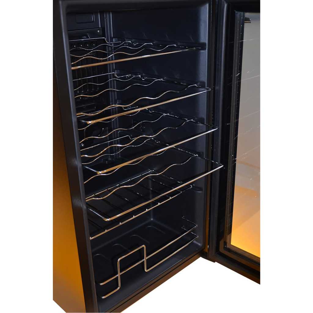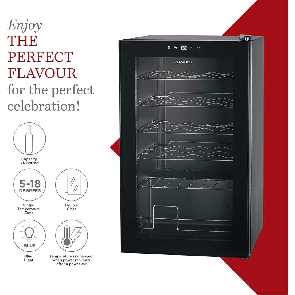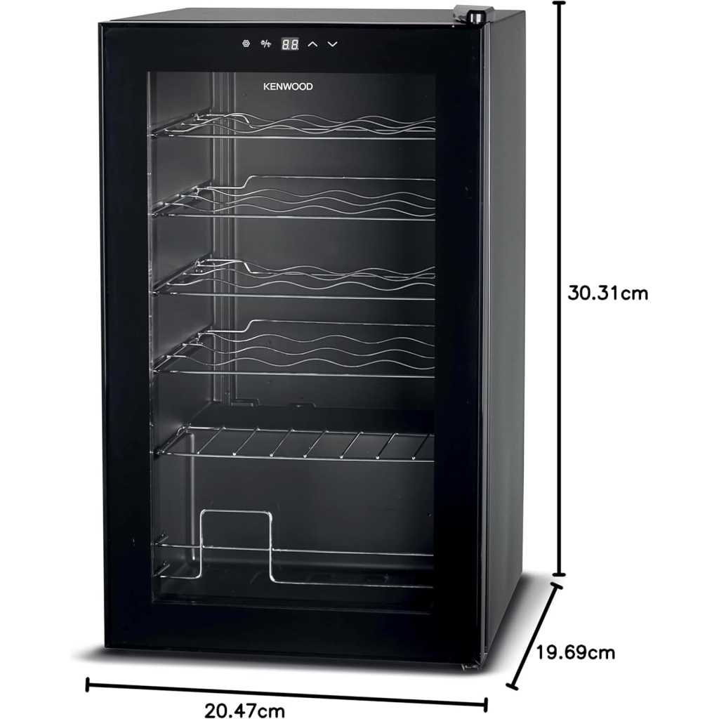 Kenwood 24 Bottles Beverage Cooler BCW24.000BK, Wine Refrigerator With Smart Temperature Control, Double Glass Door, Blue Light – Black Kenwood Beverage Cooler 24 Bottles- Bases Capacity, Compact Cooling, Single Heat Zone 5 TPO 18 Degree, Metal Shelves, Interior Lighting, Door Glass, Dimensions 43 x 45 x74.24 Bottles Capacity Compressor Cooling Single Temperature Zone 5-18 degrees 50 Watts Metal Shelves Interior Light Glass Door Type: Wine Cooler Dimension 430*450*740mm Key Features: Kenwood 24 Bottles Beverage Cooler BCW24.000BK. 24 Bottles Capacity Black Bcm24.000BK Compressor Cooling Single Temperature Zone 5-18 degrees 50 Watts Metal Shelves Interior Light Glass Door Type: Wine Cooler Dimension 430*450*740mm