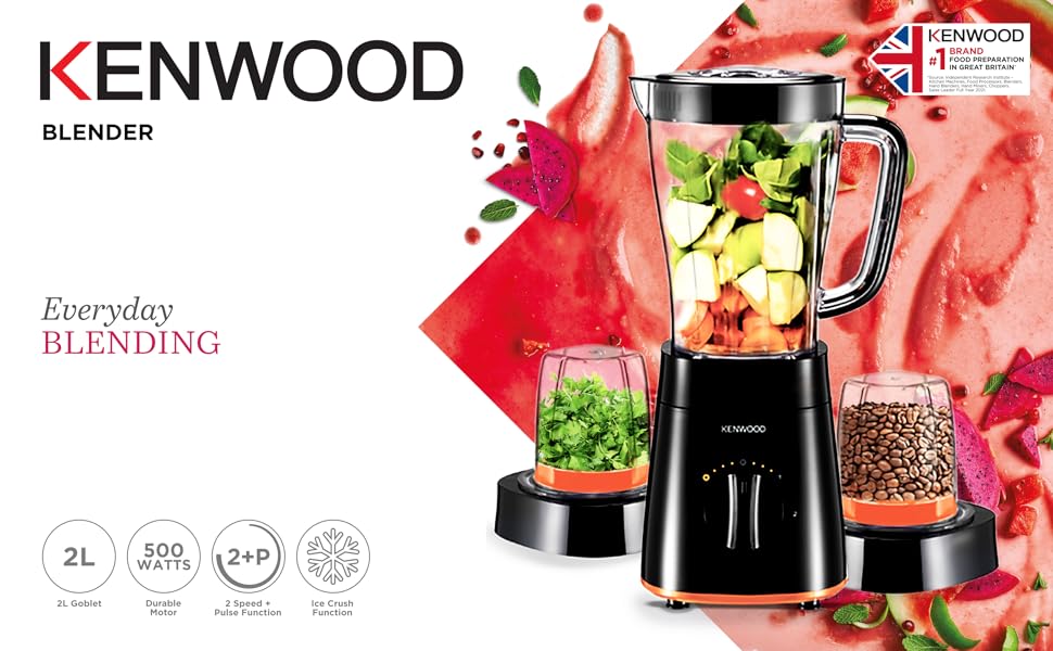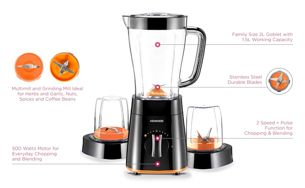 Kenwood Blender 500W Smoothie Blender/Smoothie Maker 1.5L With Multi Mill (Grinder/Chopper), Ice Crush Function BLP15.150BK Black Brand: Kenwood Color: Black Material: Plastic Style: Countertop Blenders Power / Wattage: 500 watts Dishwasher-safe: Yes Easy to use Safe to use Easy to be cleaned Very Effective High quality International Warranty From the manufacturer Key Features: Kenwood Blender 500W Smoothie Blender/Smoothie Maker 1.5L With Multi Mill (Grinder/Chopper), Ice Crush Function BLP15.150BK Black Take the effort out of blending with kenwood’s blender need a powerful blender without compromising precious kitchen worktop space The kenwood blender is ideal for smaller spaces, but still has a generous 1.5L capacity goblet, perfect for all your blending needs for refreshing smoothies, sauces and much more Consistency in blending is crucial, so that’s why the strong stainless steel blades work fast for effortless blending, with 2 speeds and a pulse function to put you in total control Goblet plastic, mill available, easy clean, body material plastic, non slip feet, safety interlock
