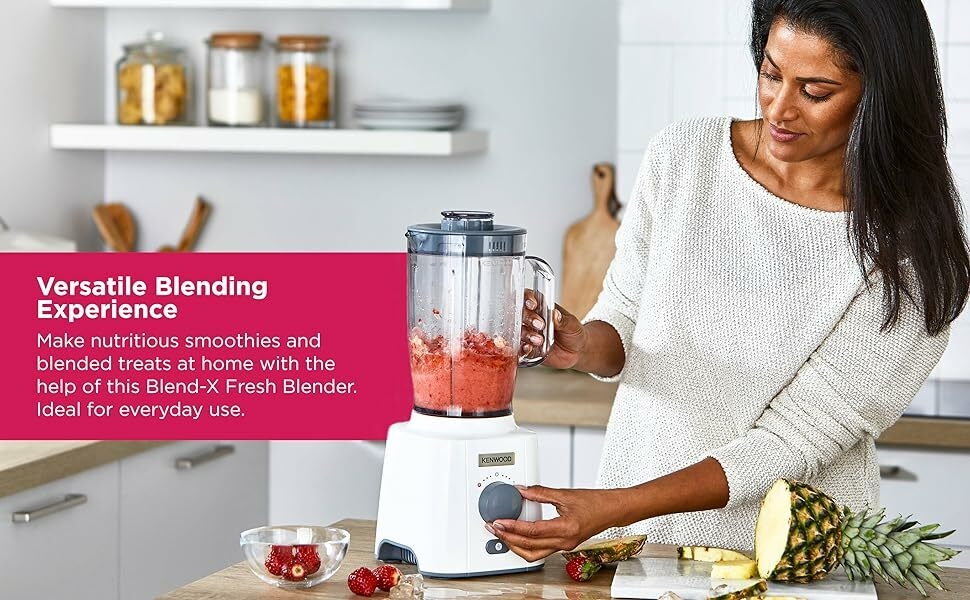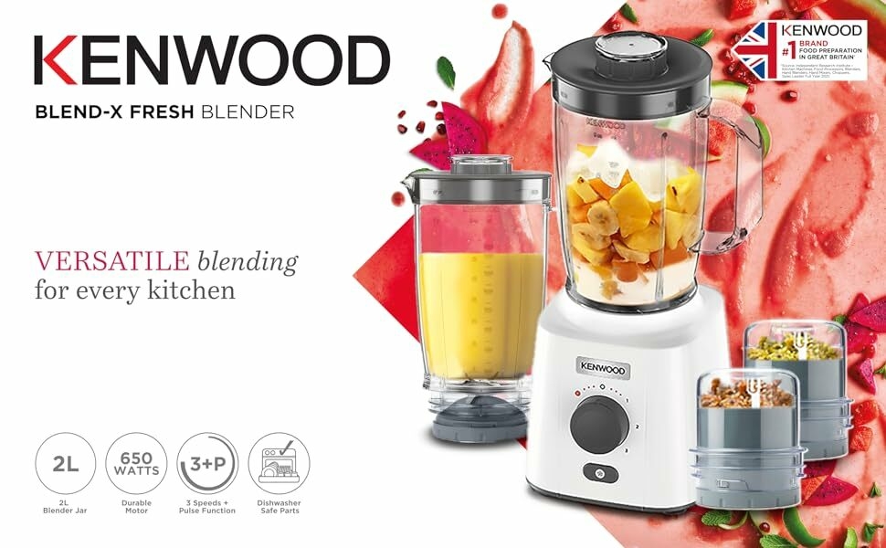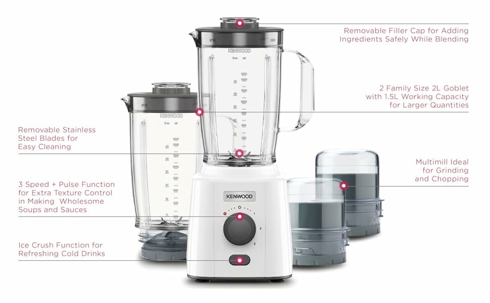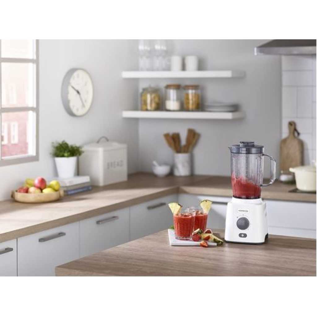 Kenwood Blender 650W Smoothie Blender/Smoothie Maker Blend-X Fresh 1.5L With Extra Blender Jar, Grinder Mill, Grater Mill, Ice Crush Function BLP41.C0Wh White 650W powerful motor, 2L goblets ( 1.5L working capacity)for effective chopping and grinding for large quantities. 3speed + pulse function for extra texture control for wholesome soup and smooth sauces Ice crushing function for refreshing cold drinks Removable stainless steel blades for easy cleaning, removable filter cap simply and safely to add ingredients while blending Key Features: 650W Powerful Motor 3 Speed + Pulse Ice Crushing Function 2L Blending Jar Capacity Grinding Mill Attachment Grating Mill Attachment Dishwasher safe parts Blender Motor 2L Blender Jar Grinding Mill Grating Mill Instruction Manual