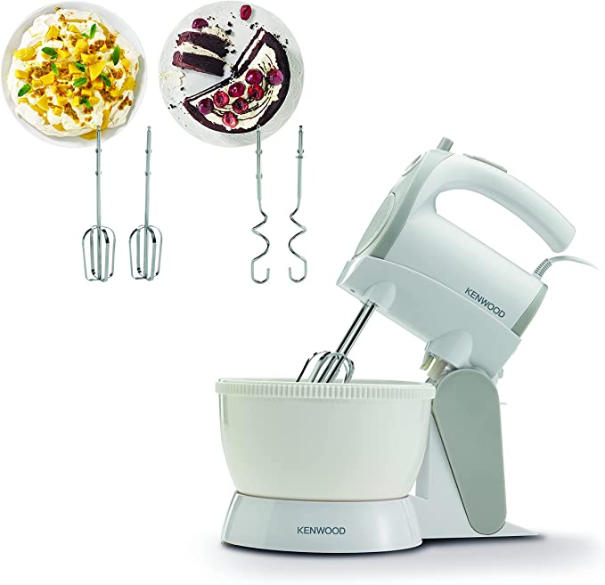 Kenwood Stand Mixer Hand Mixer (Electric Whisk) 300W with 2.4L Rotary Bowl, 5 Speeds + Turbo Button, Twin Stainless Steel Kneader and Beater for Mixing, Whipping, Whisking, Kneading HMP22.000WH White Use the hand mixer separately for quick convenient mixing or attach to the specially designed stand with rotating bowl for larger batches. Double removable hooks: Mixing hooks Whisking hooks